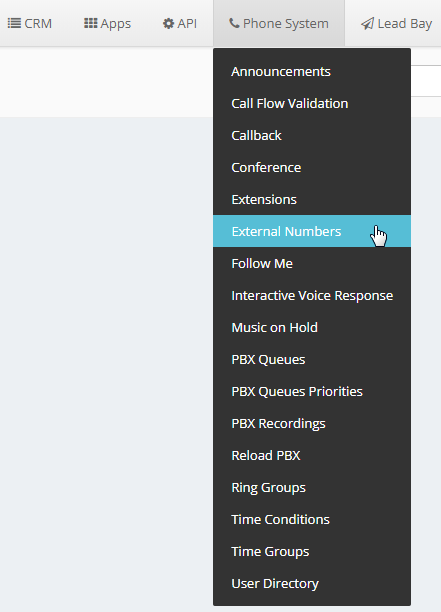 From the Dashboard, click on Phone System and select External Numbers from the drop down.