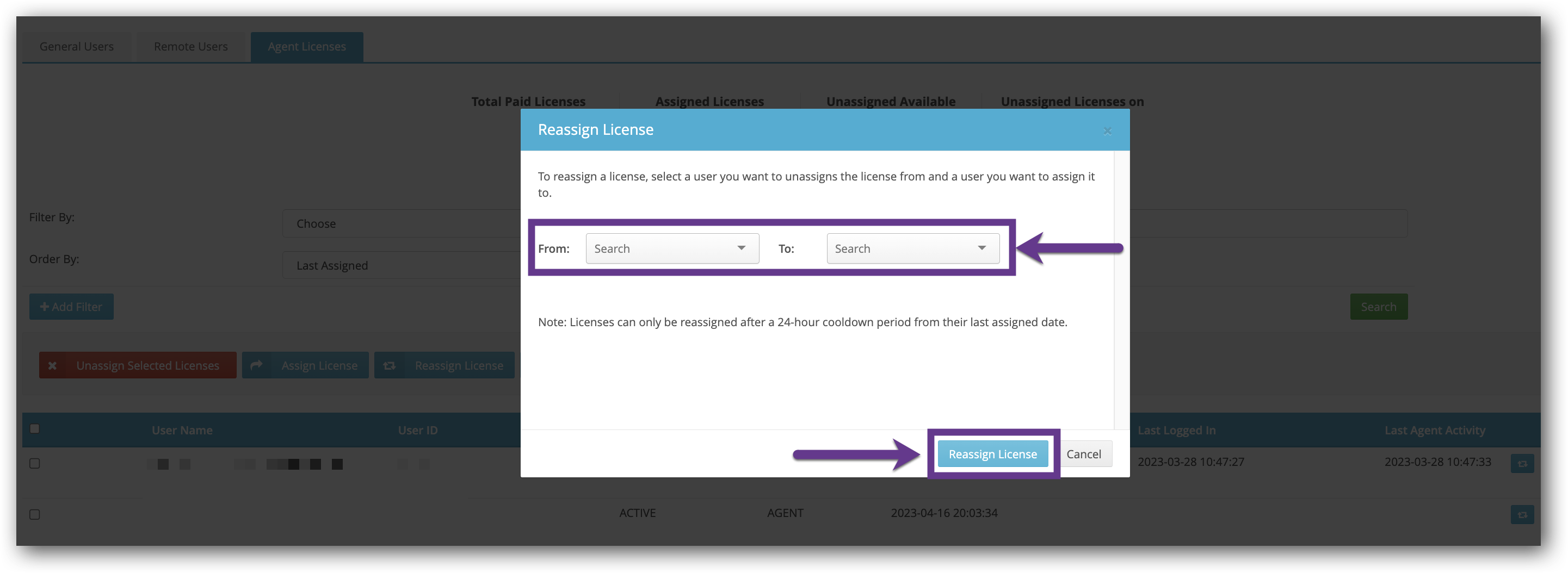 Note: Licenses can only be reassigned after a 24-hour Cooldown period from their last assigned date.