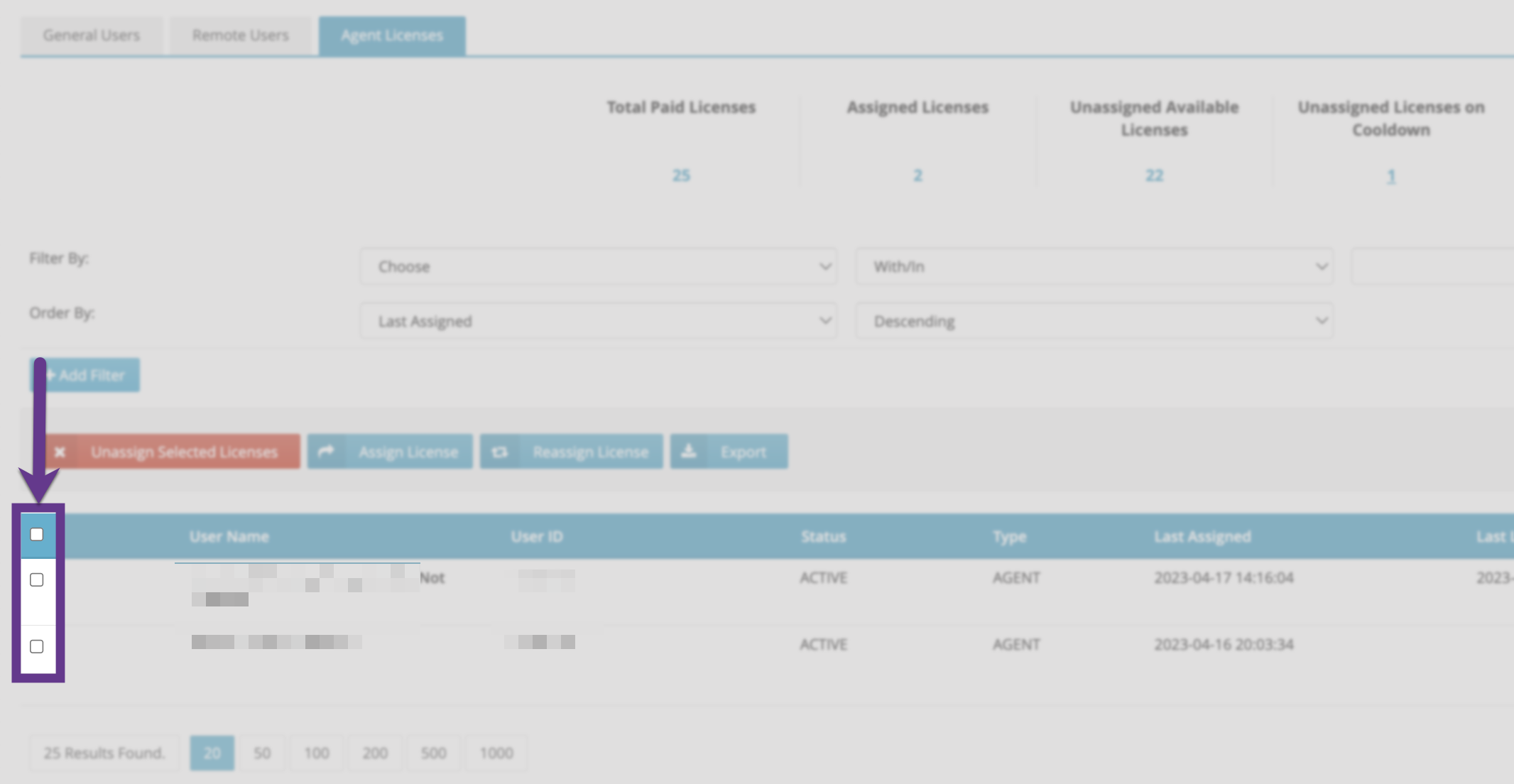 - You can also click the checkbox at top of the checkbox column to select all Users on that page. If you want to select ALL Licenses, click the link that appears below the action button.