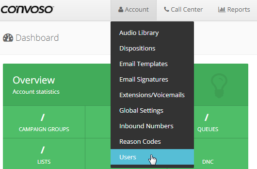 From the dashboard, click on Account and select Users from the drop down.