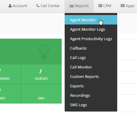 From the Dashboard, click on Reports and select Agent Monitor from the drop down. The agent will now be able to view the Agent Monitor page.