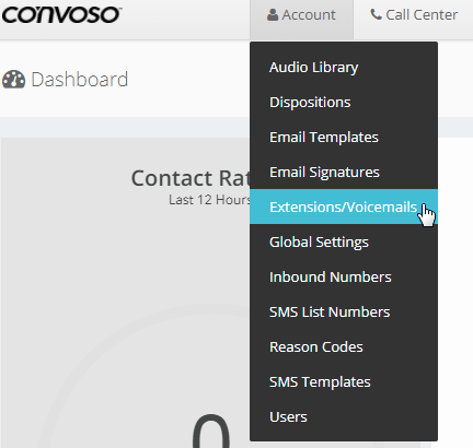 From the Dashboard, click on Account and select Extensions/Voicemails from the drop down.