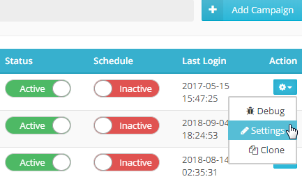Under Show Campaigns, Click on the Action Button and select Settings.