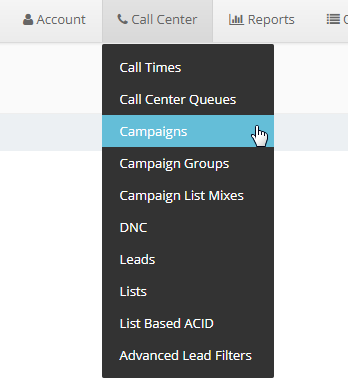 From the Dashboard, click on Call Center and select Campaigns from the drop down.