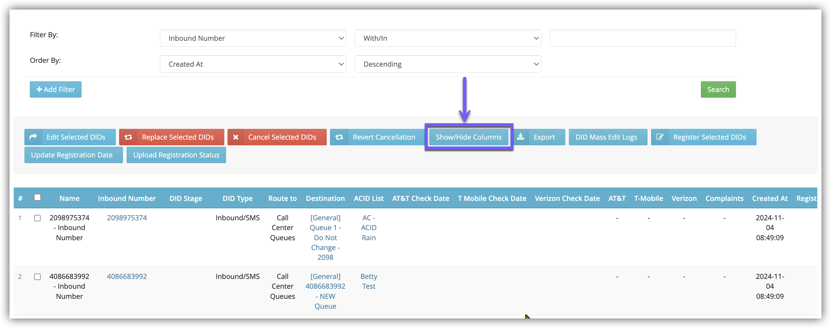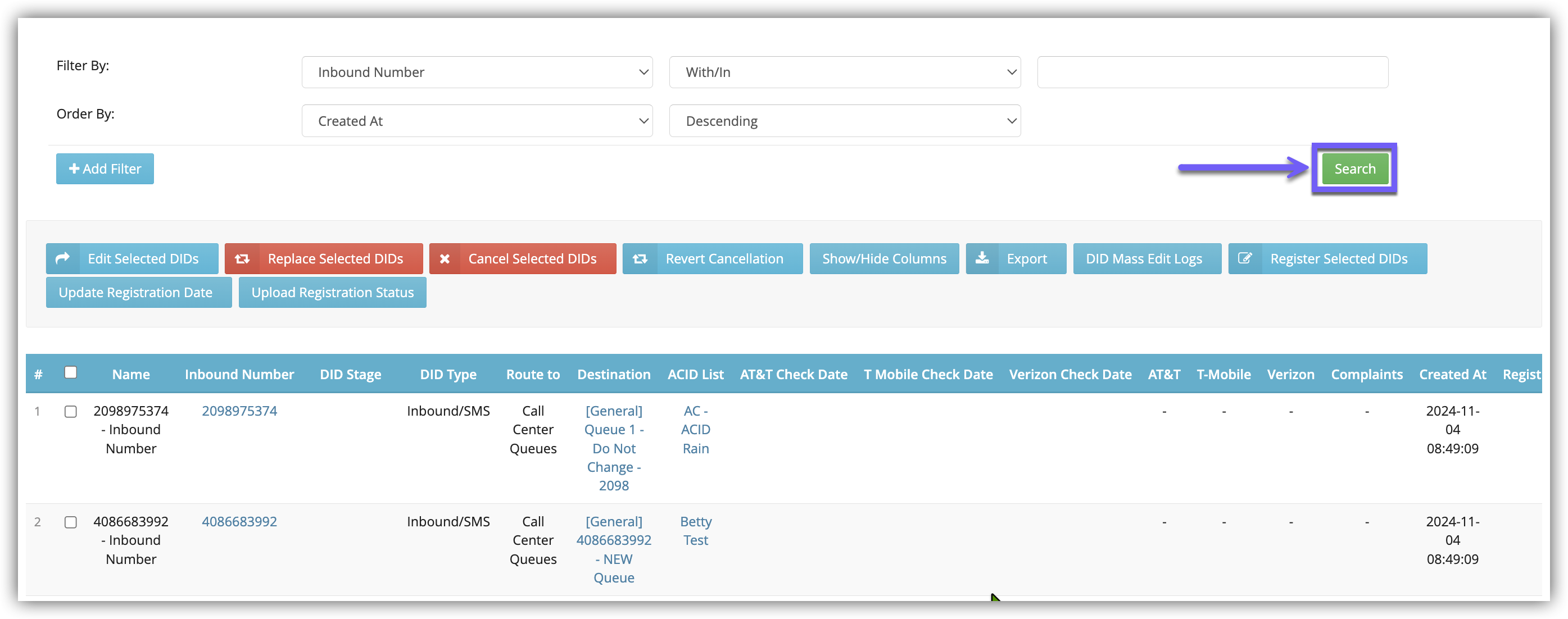 - Inbound Number: Filter or search the DID number.