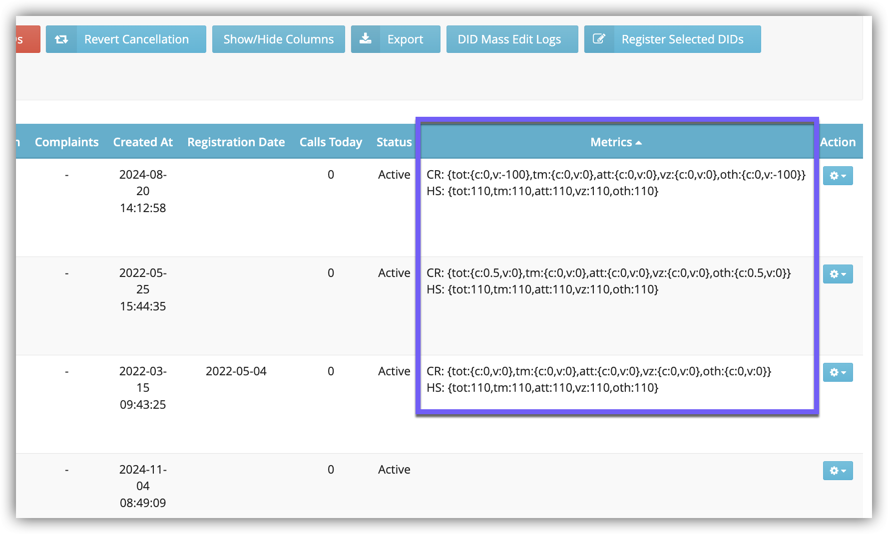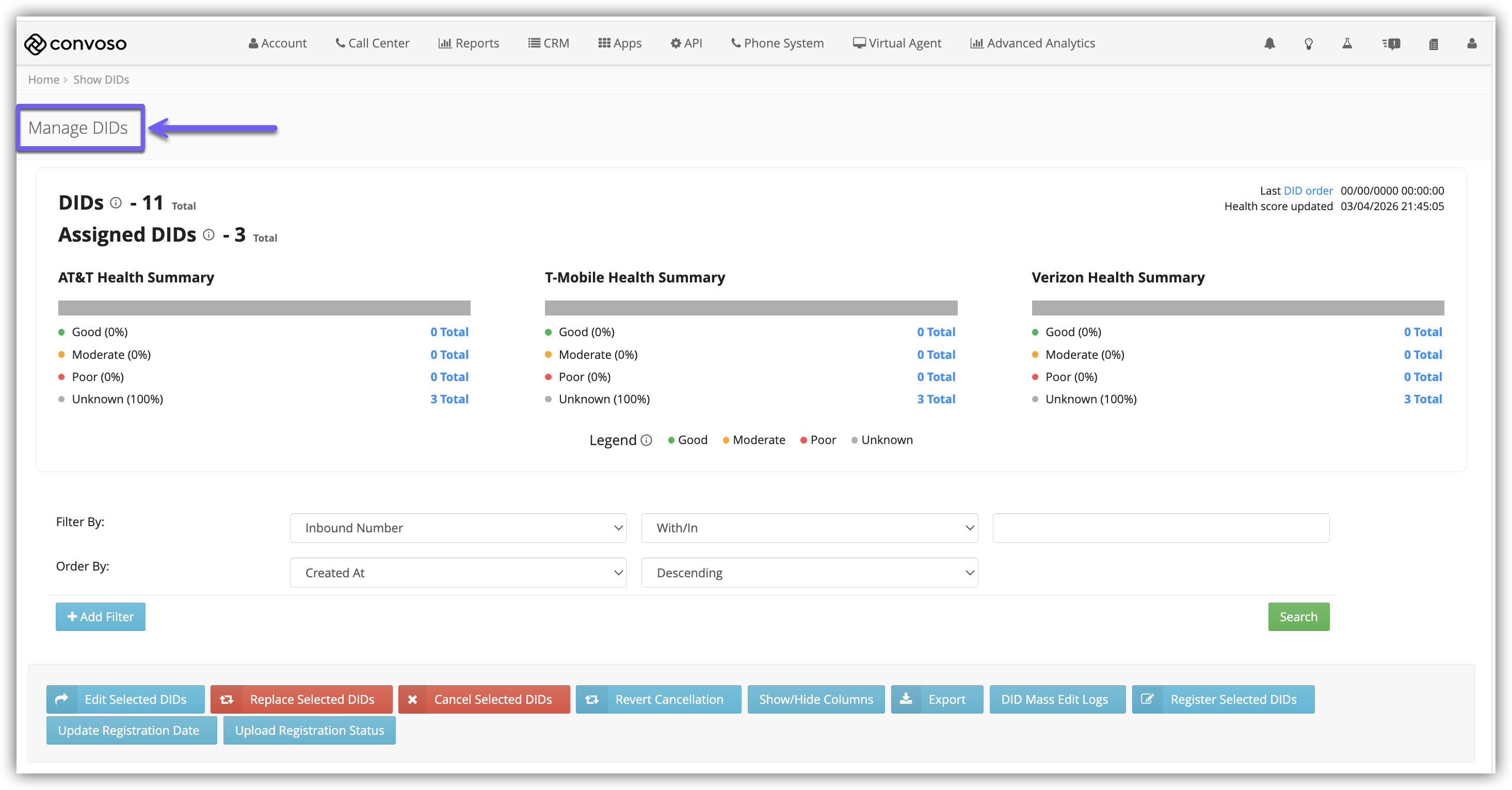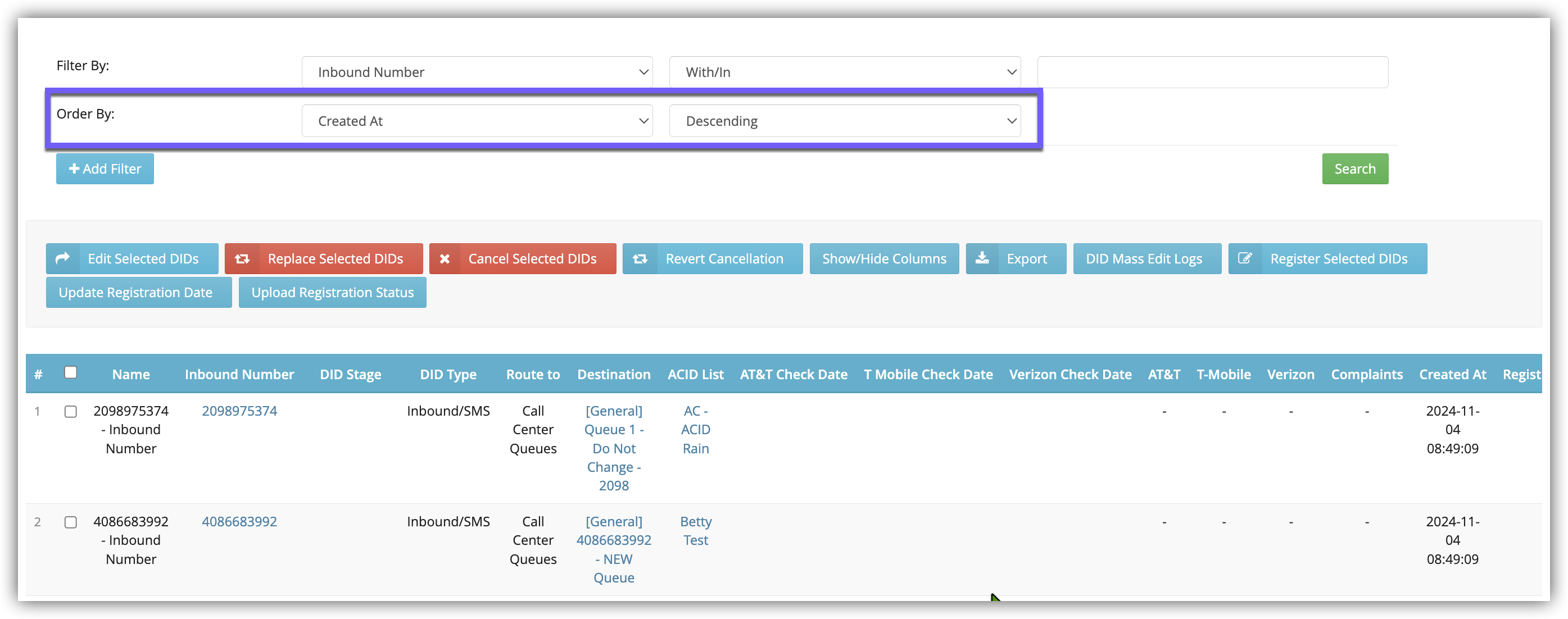 - DID Stage: Filter numbers by their stage for cancellation, replacement, or release.