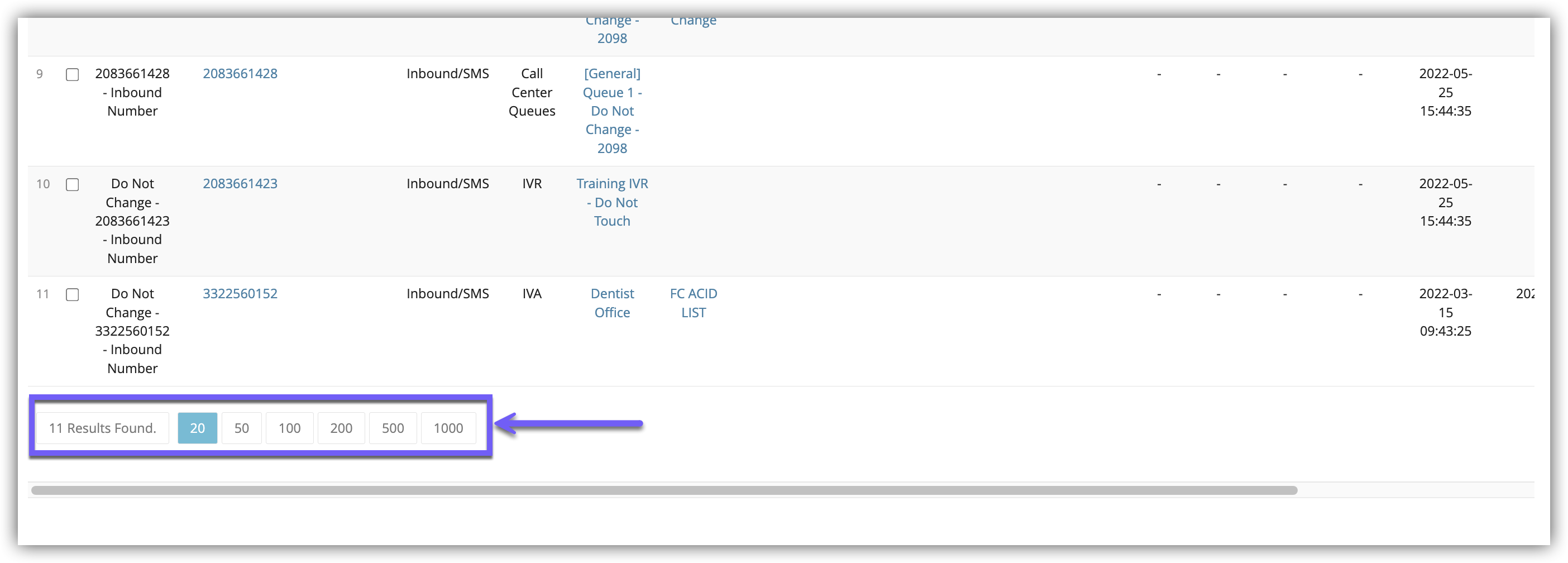 Note: To increase the number of DIDs shown on a single page, click the numbered buttons to the left below your table.