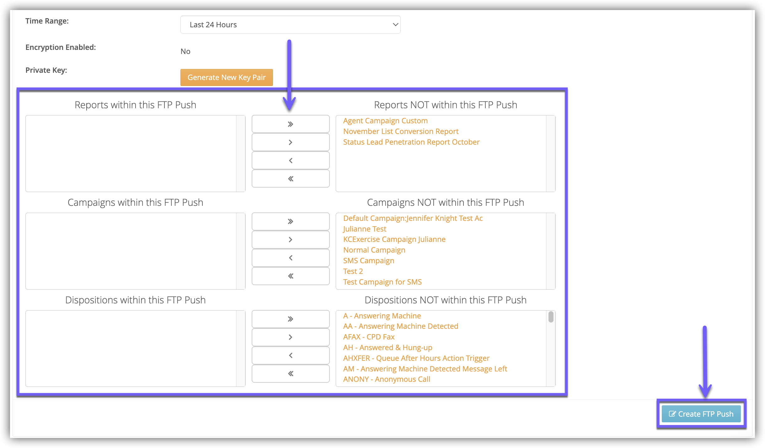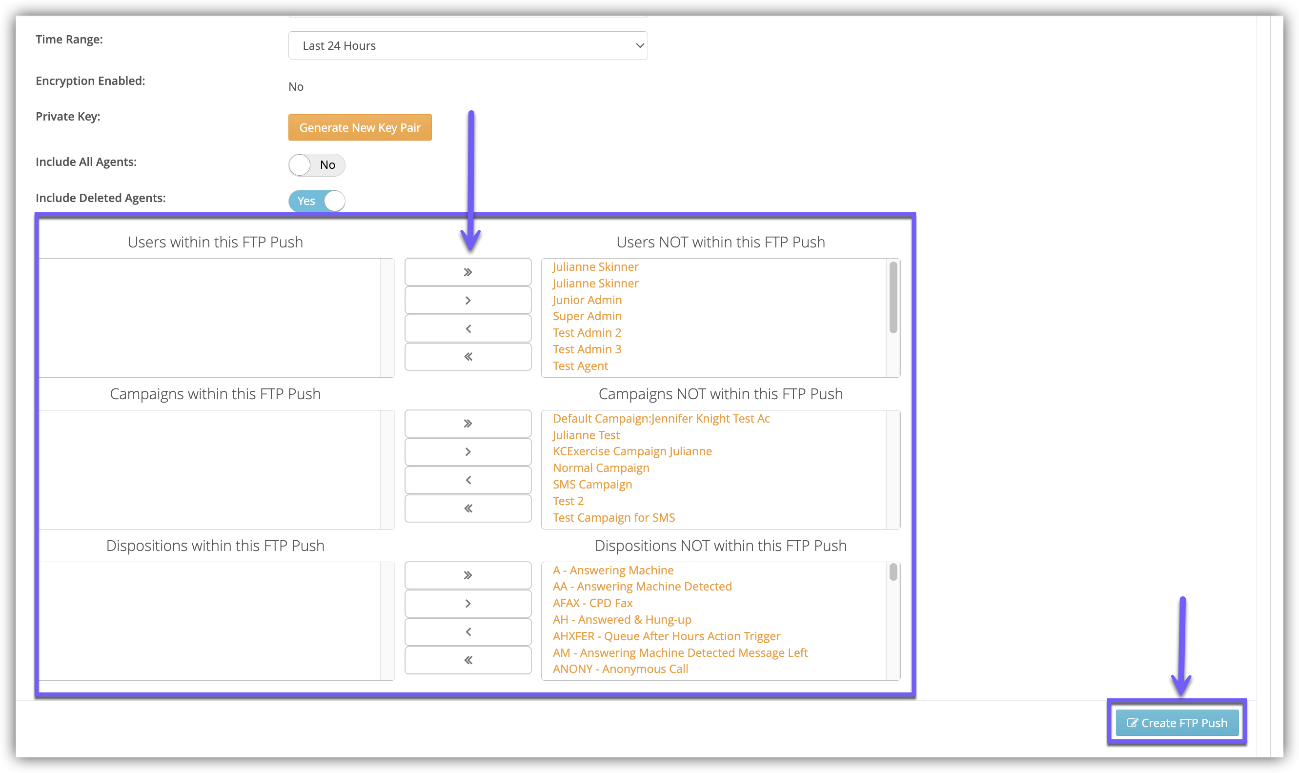Highlight Dispositions with your mouse and move them to the Dispositions within this FTP Push group.- Move Individual Dispositions by clicking the < or > buttons.