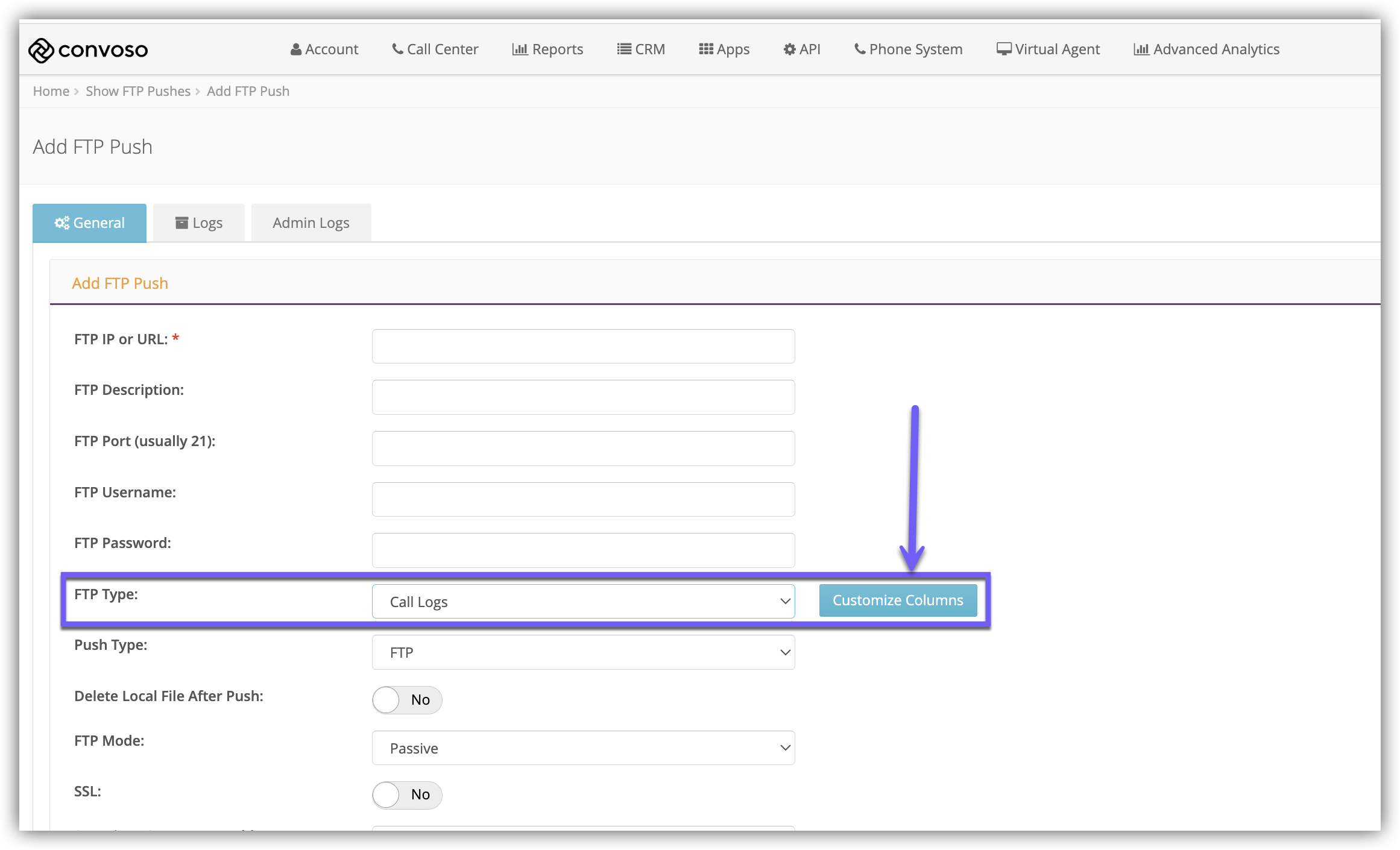 The settings for the Call Logs option for FTP Type includes a Customize Columns button.