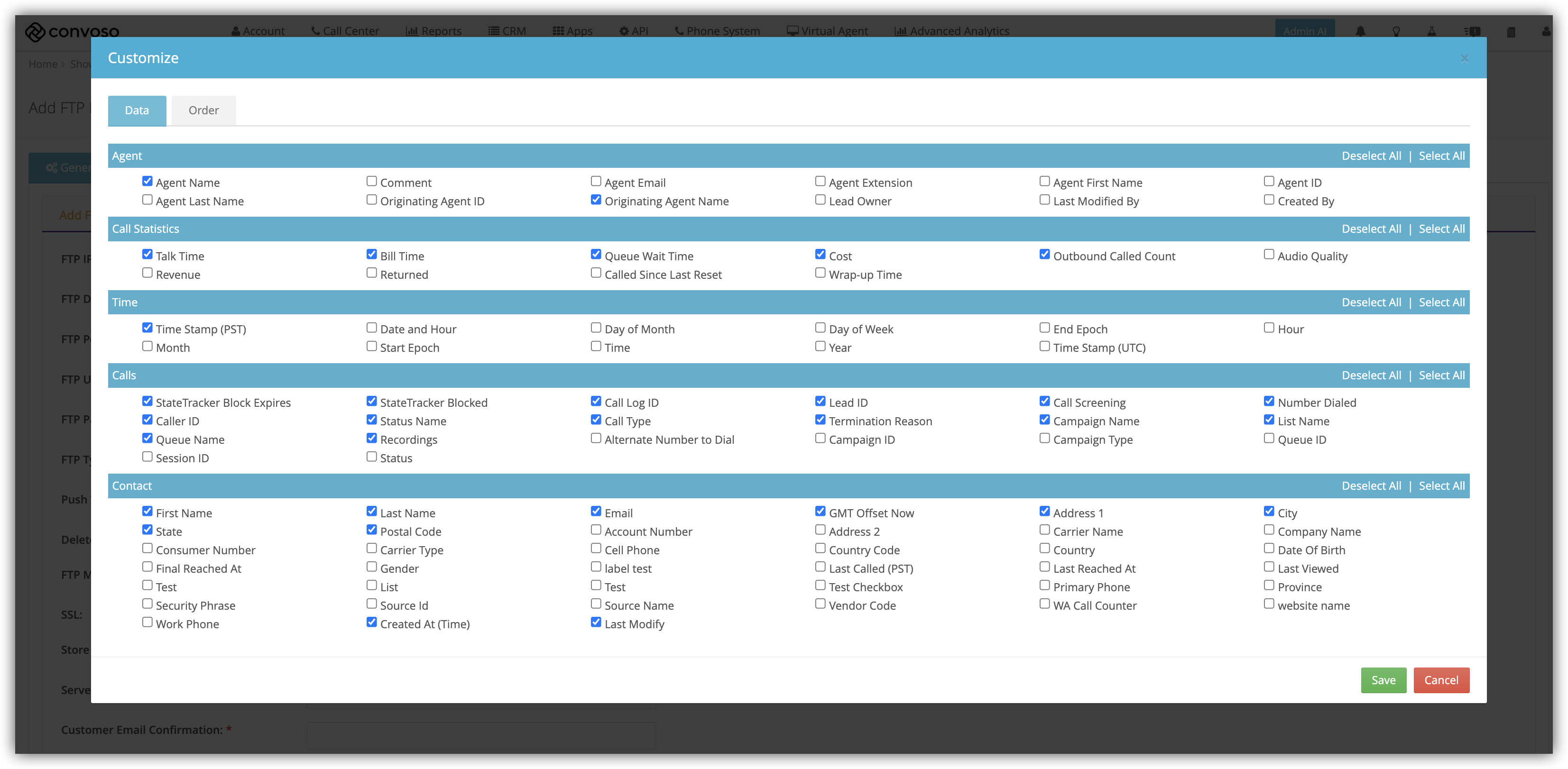 The Customize Column button opens a modal window for selecting which columns will appear in the exported Call Logs FTP.