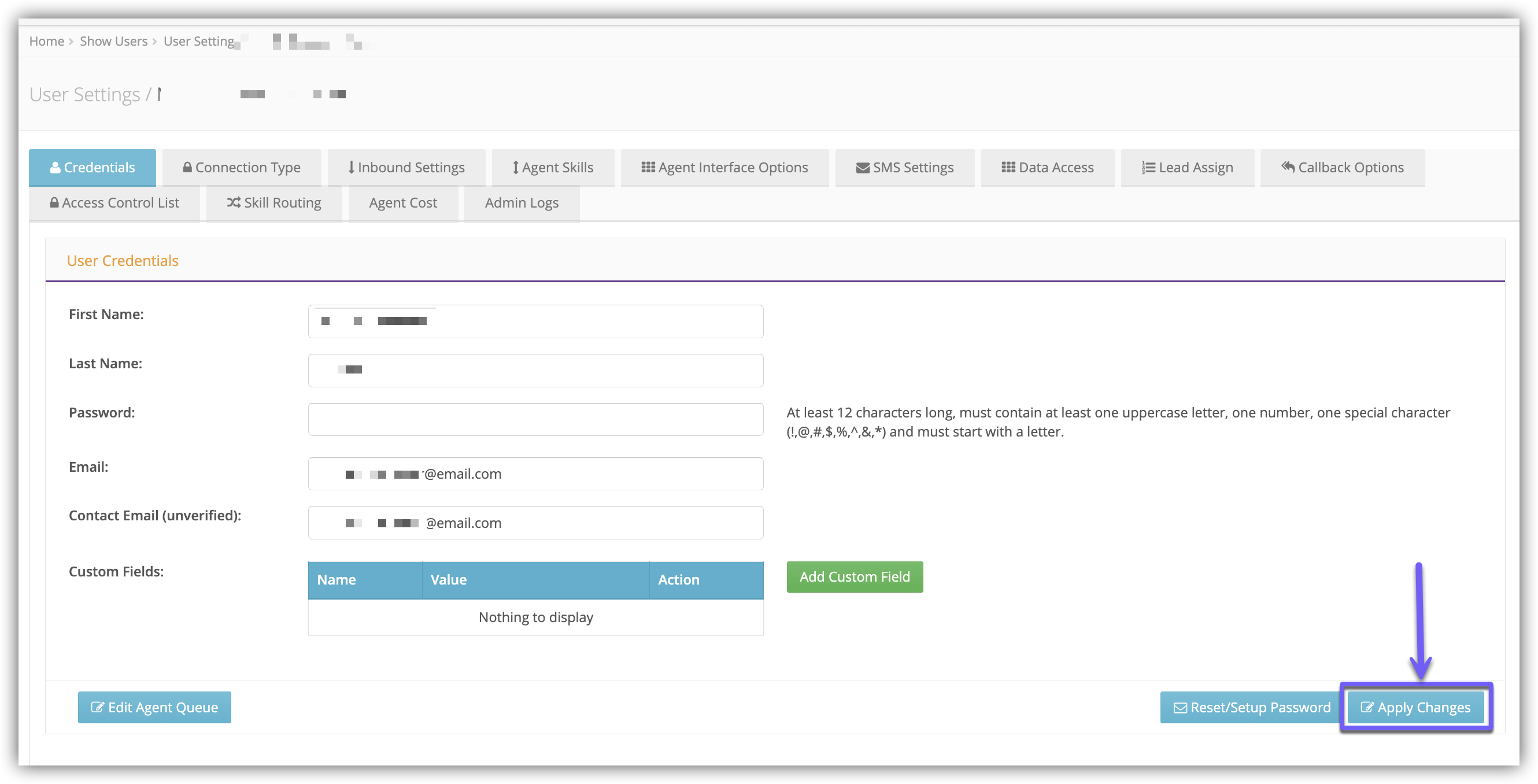 This is the password that the User will use when logging into the Agent Interface or Admin app.- Must be letters and numbers only, no symbols, and a minimum of 6 characters.