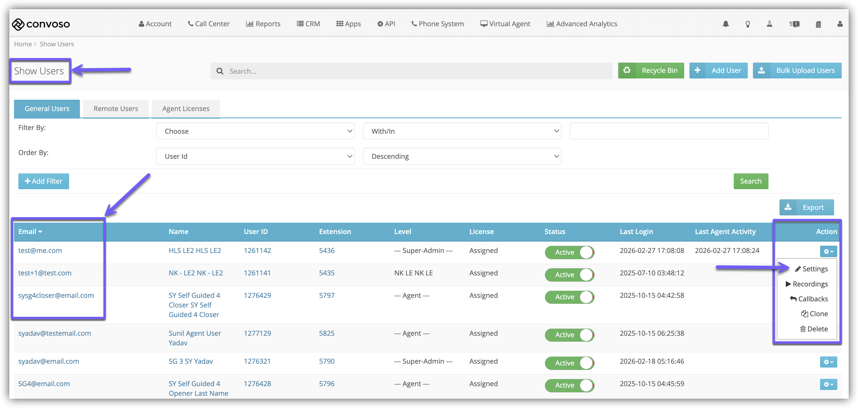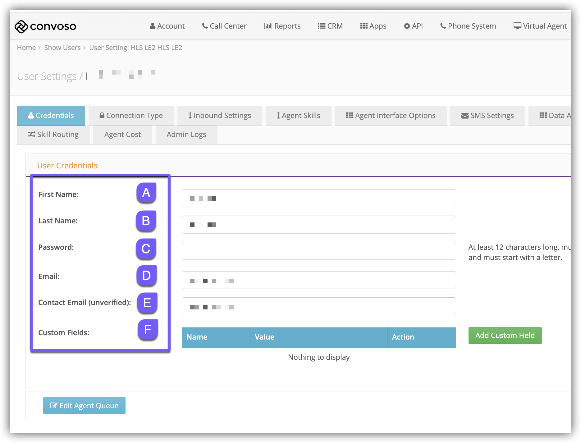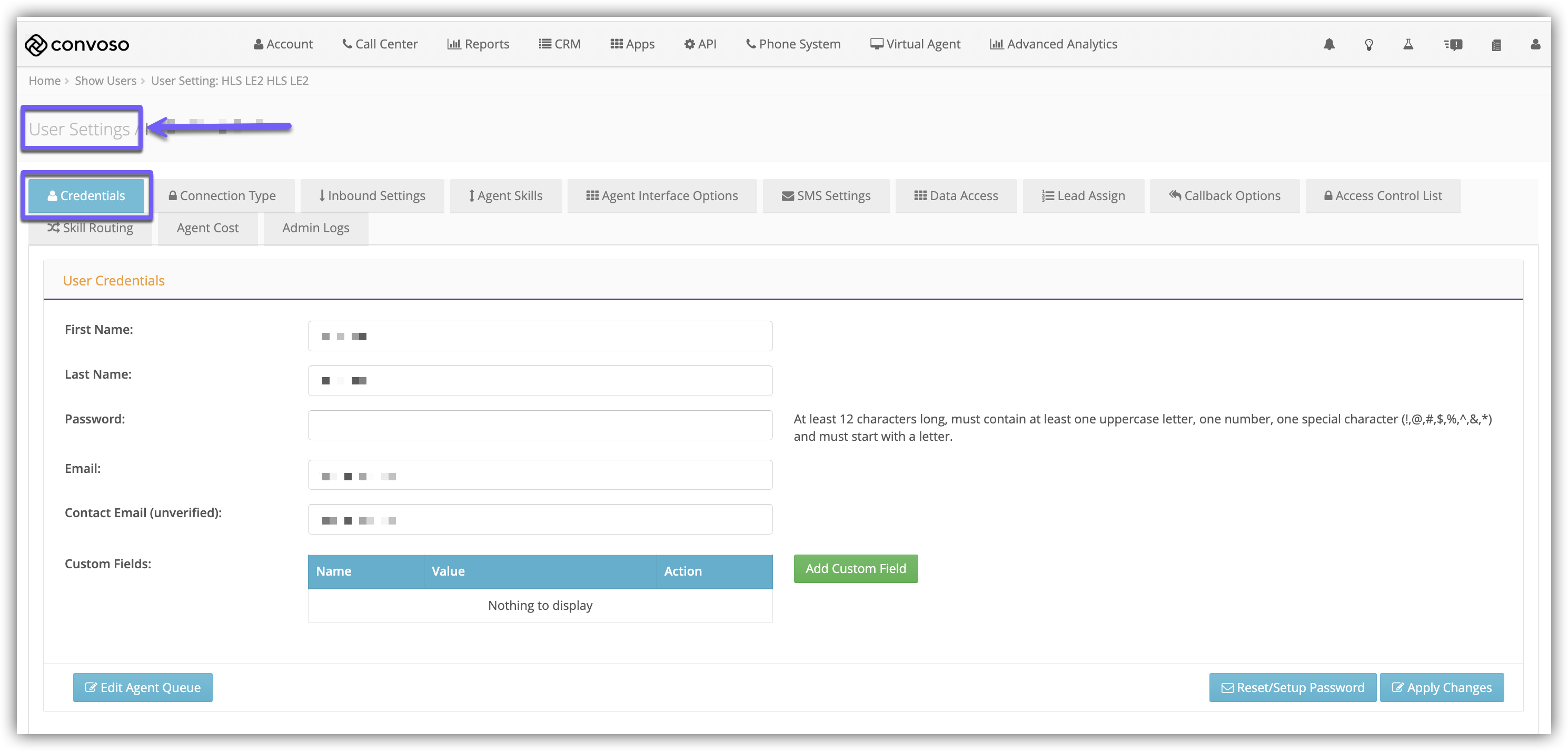 After creating a User, you can edit the User Credentials. These are the basic details used to identify and sign in as a Convoso User. This is helpful when there is Agent turnover, you can change the credentials of an existing user in order to maintain the same settings without configuring a new user.