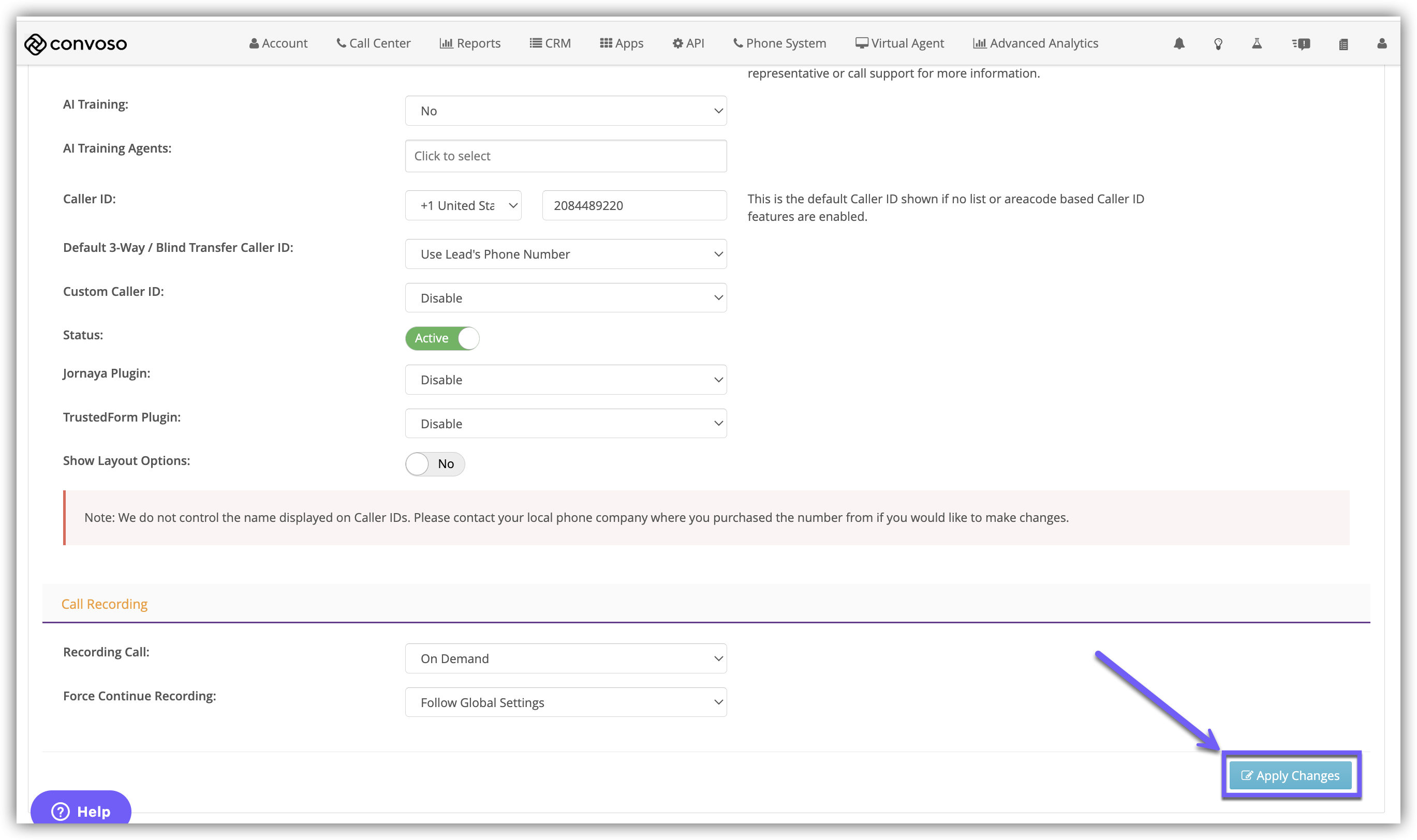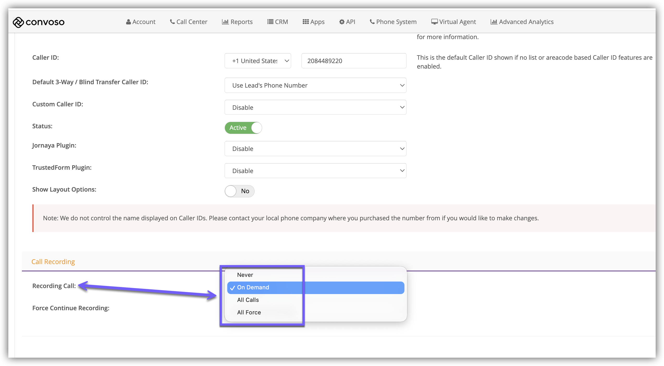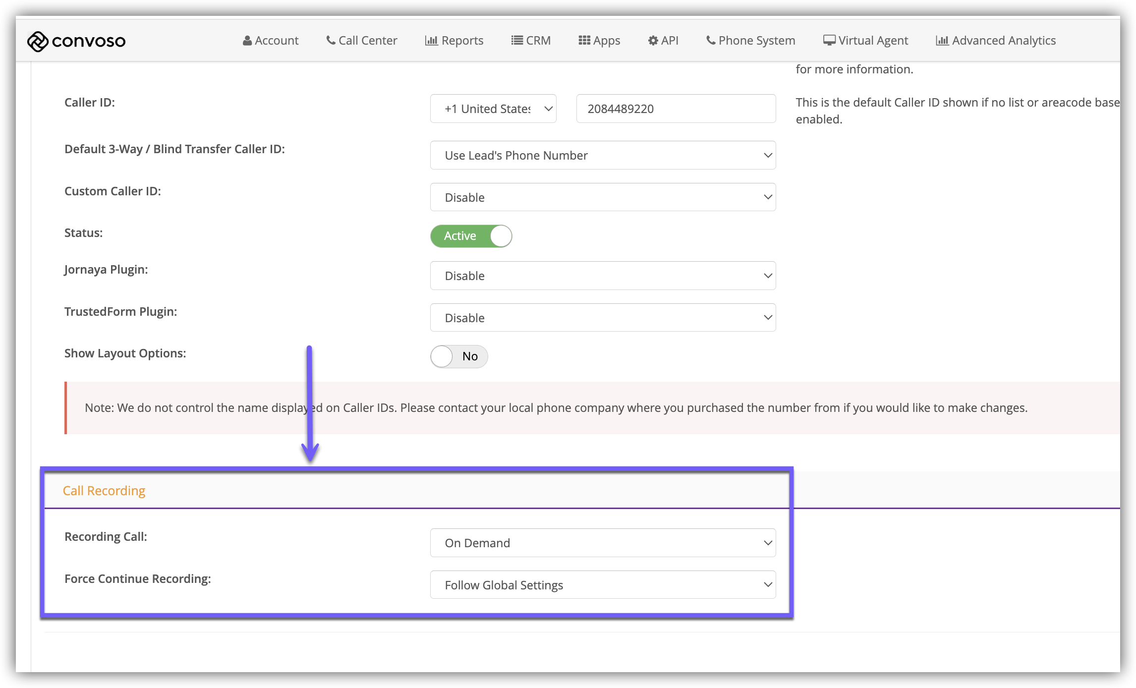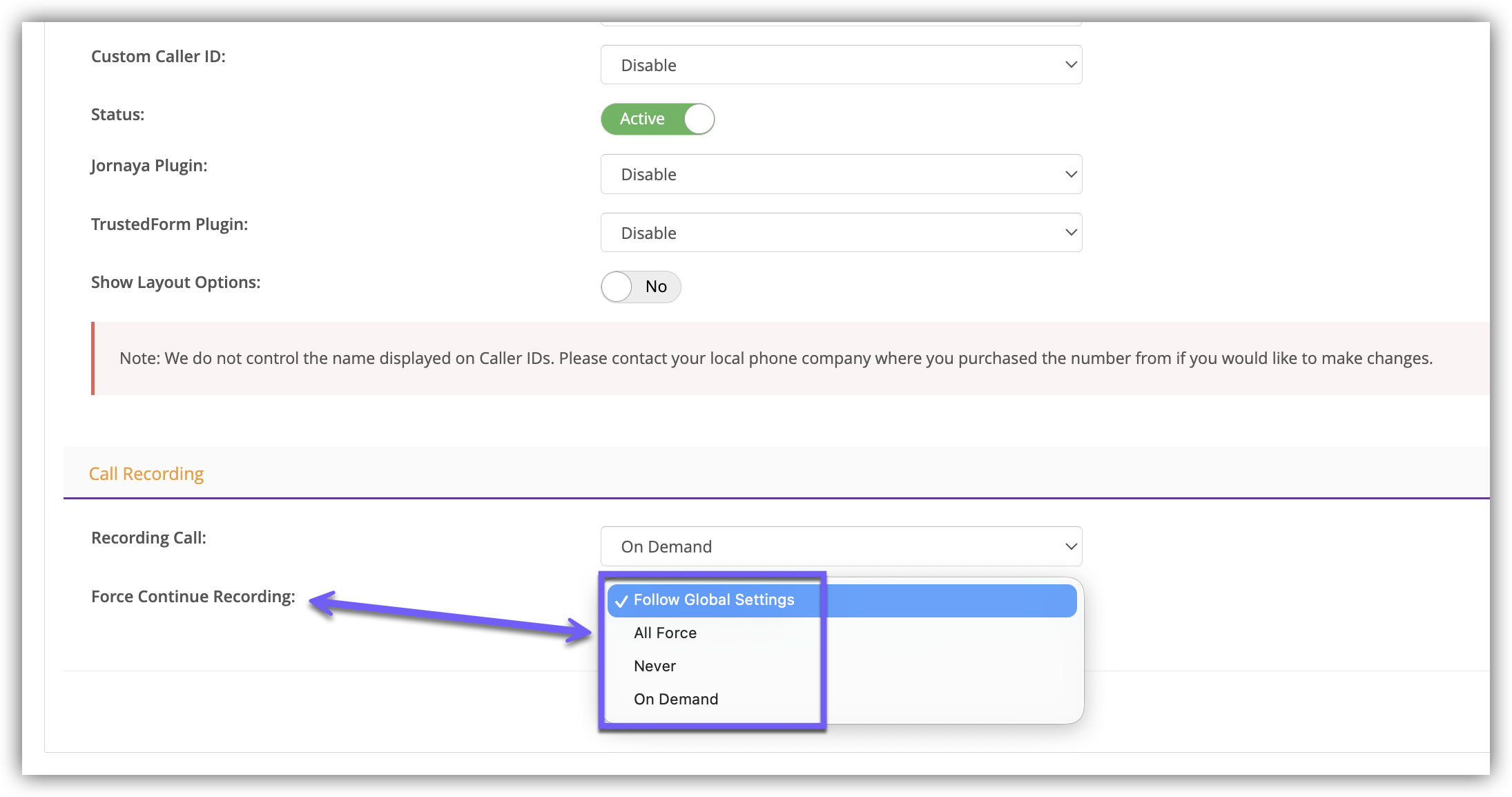 4.) Scroll down to the Call Recording section and select one of the options in the Recording Call drop-down.