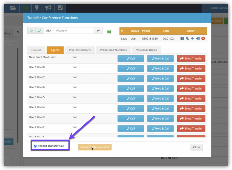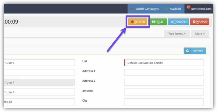 Note: The Recording Call setting only applies to the Lists assigned to the specific Campaign. If an Agent logged into Campaign A dials a Lead from a List assigned to Campaign B, then Campaign B's Recording Call setting will be applied.