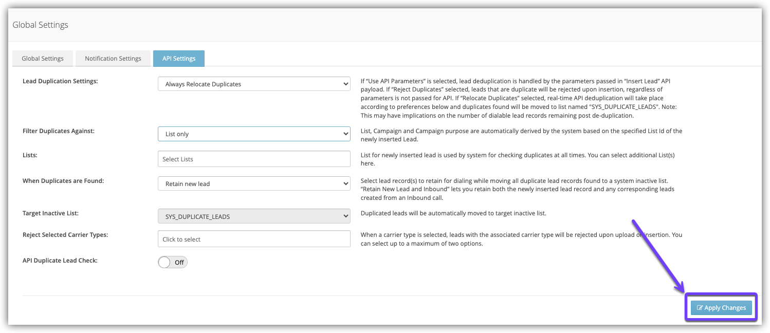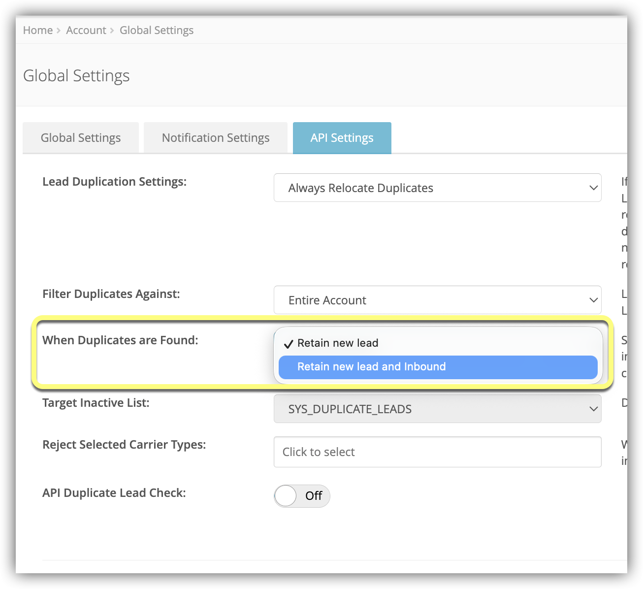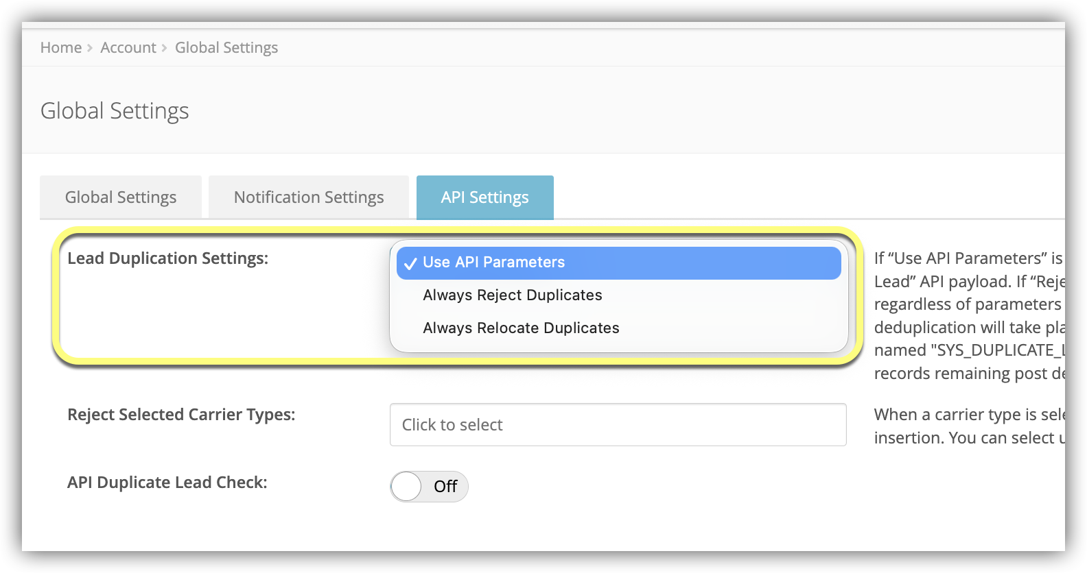 - When set to Yes, this setting will check for duplicate Leads in third-party CRMs designated by the Admin. To learn more, see API Duplicate Lead Check for Third Party CRM.