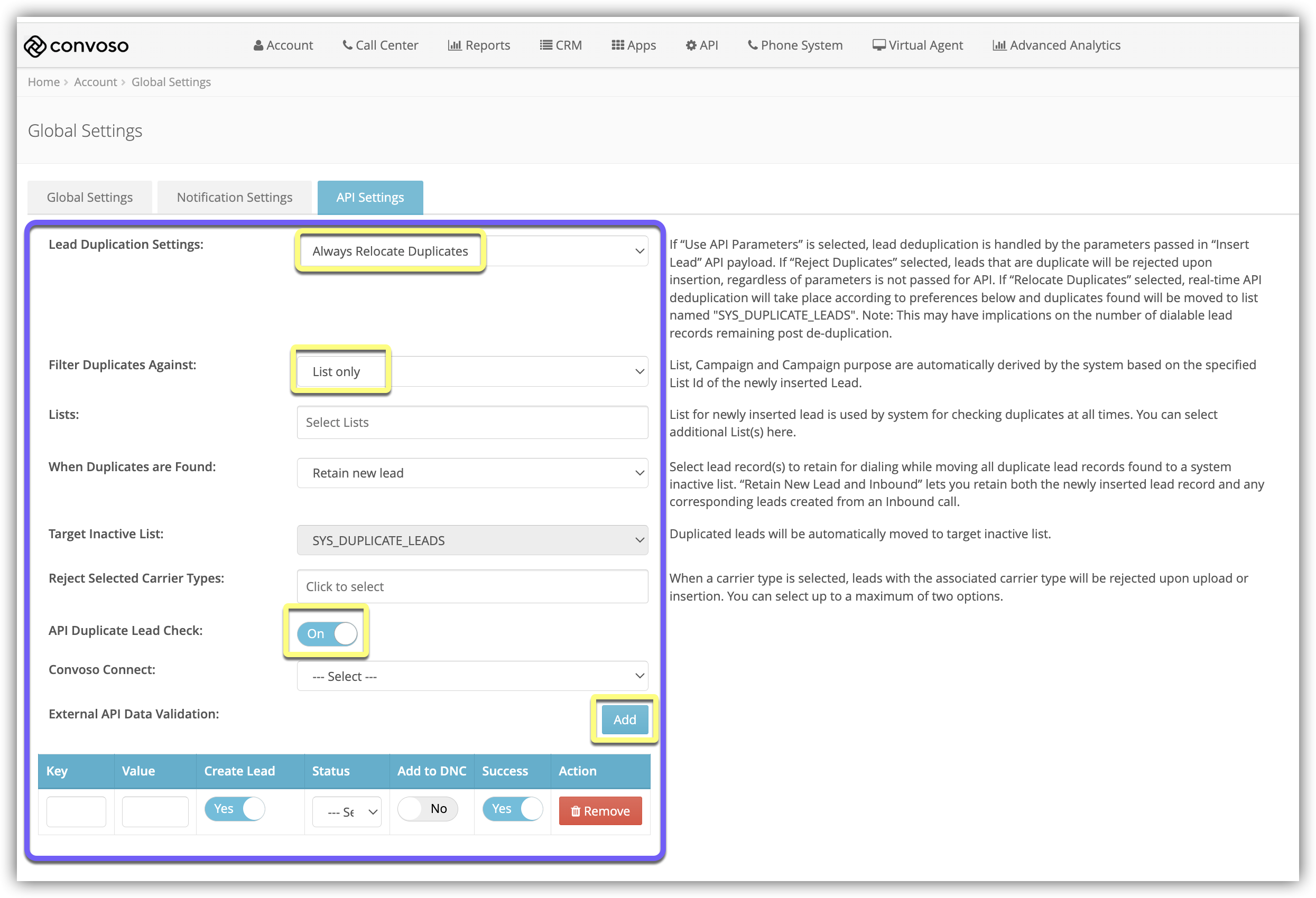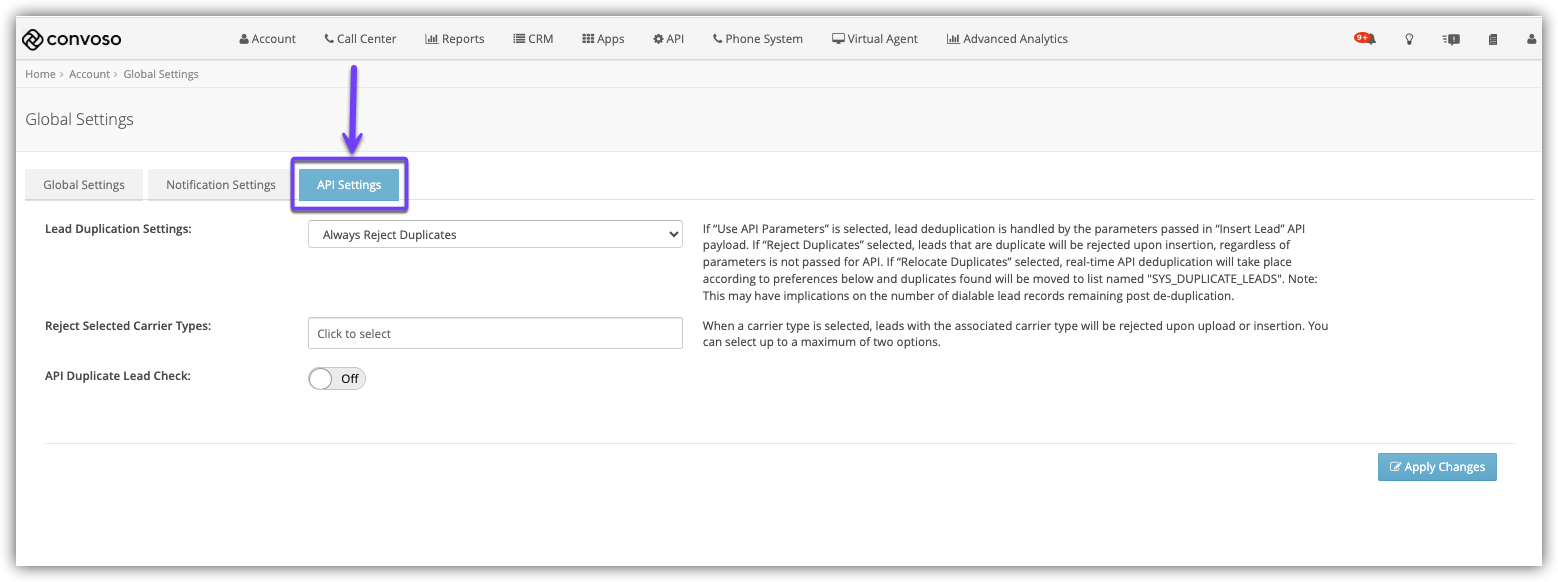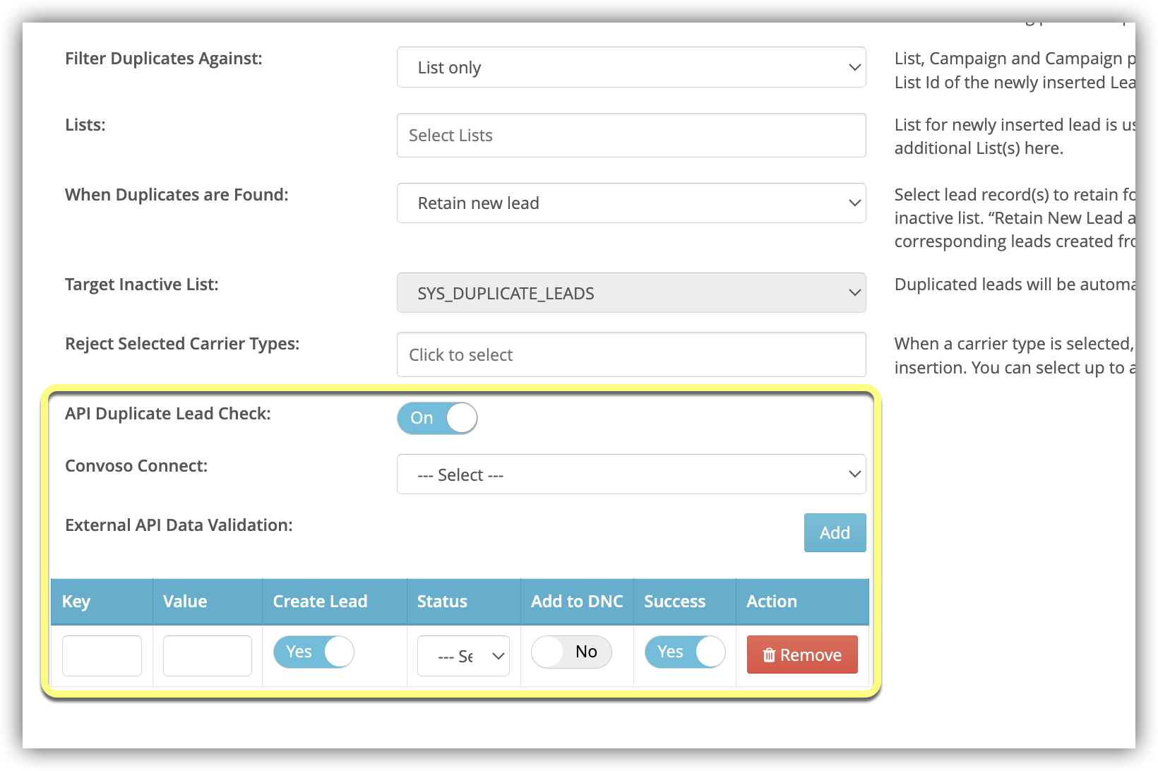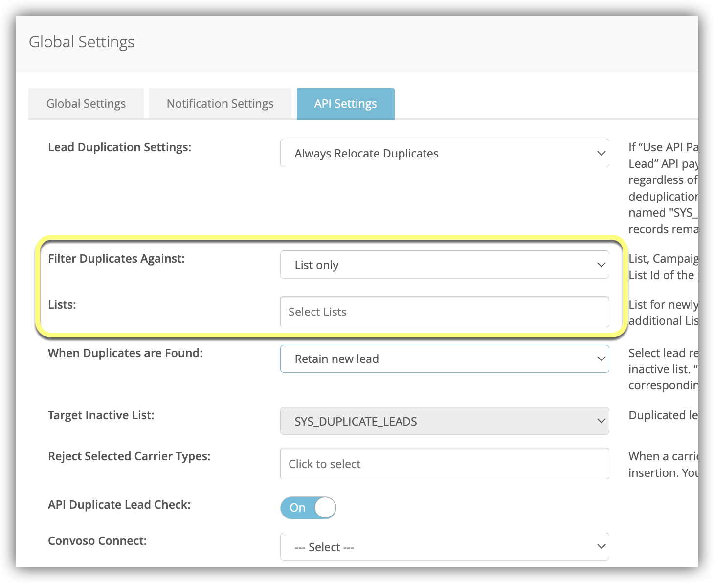 - When set to Yes, this setting will check for duplicate Leads in third-party CRMs designated by the Admin. To learn more, see API Duplicate Lead Check for Third Party CRM.