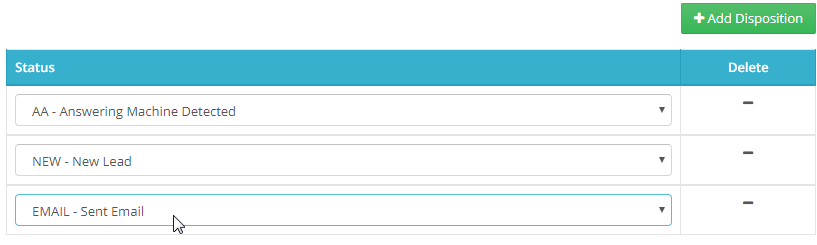The Dispositions Section shows the Statuses that the system will allow to send SMS Messages.