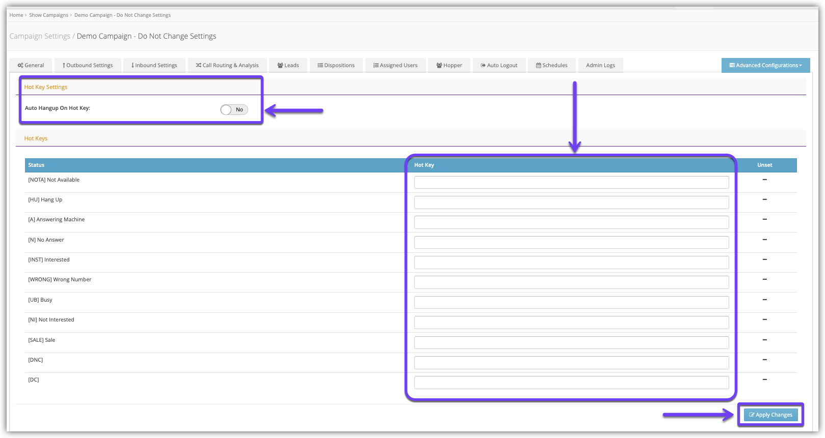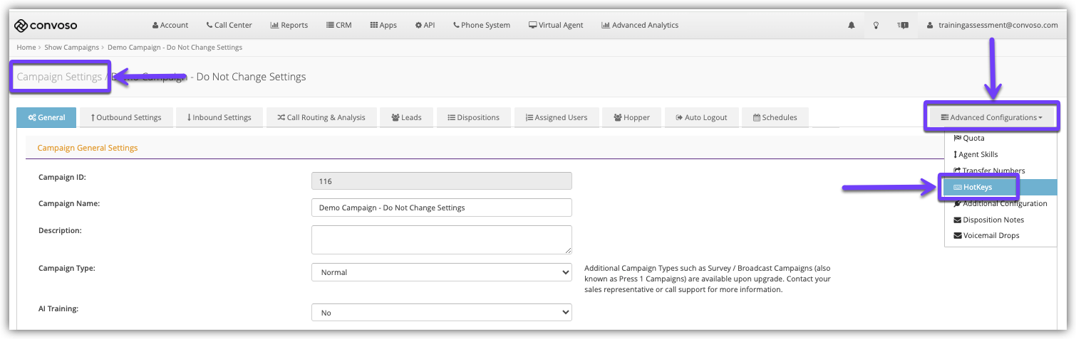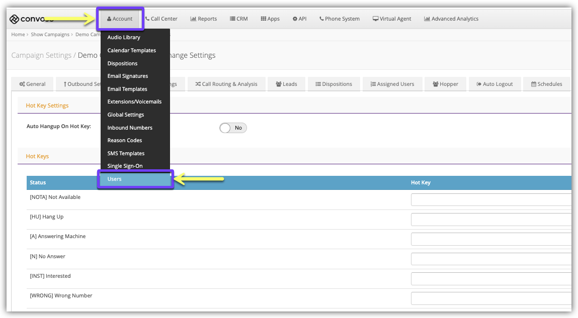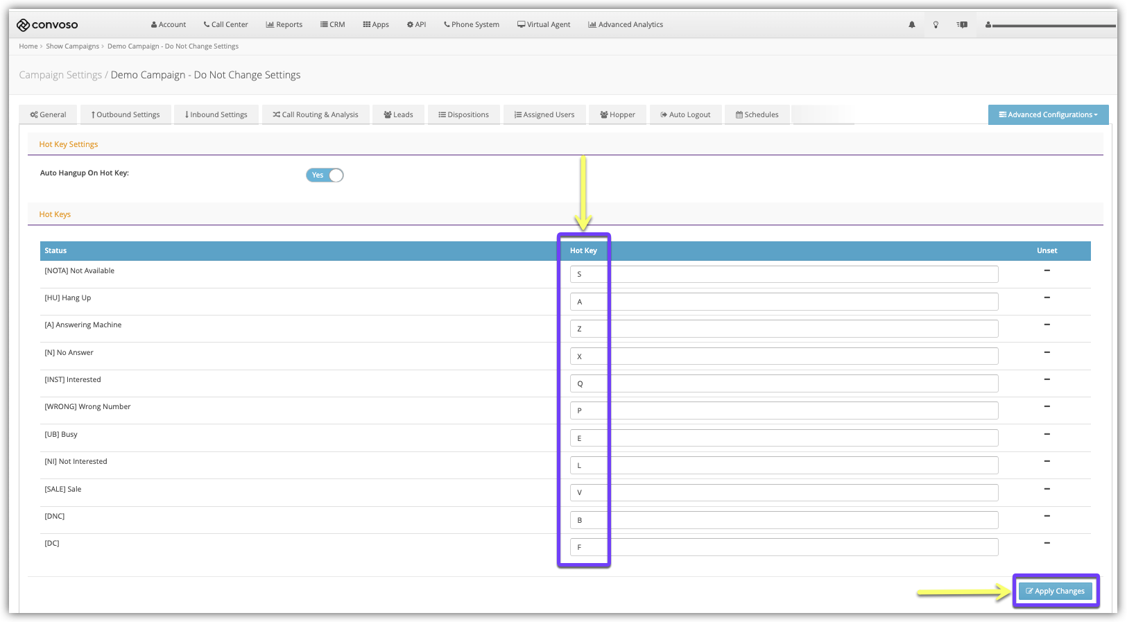 Hotkeys are a combination of keys providing quick access to a particular function. In Convoso, keys on the keyboard can be assigned to certain Dispositions/Statuses to allow Agents to quickly assign a Disposition/Status to a call. This can help the Agents quickly assign frequently used Dispositions/Statuses using simple keystrokes as opposed to mouse selections.