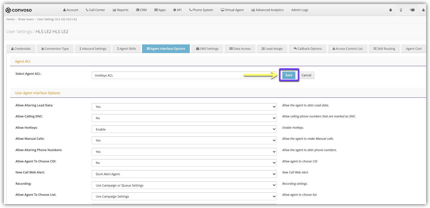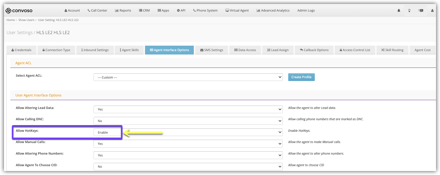 - In the User Agent Interface Options section, select Enable from the Allow Hotkeys drop-down.