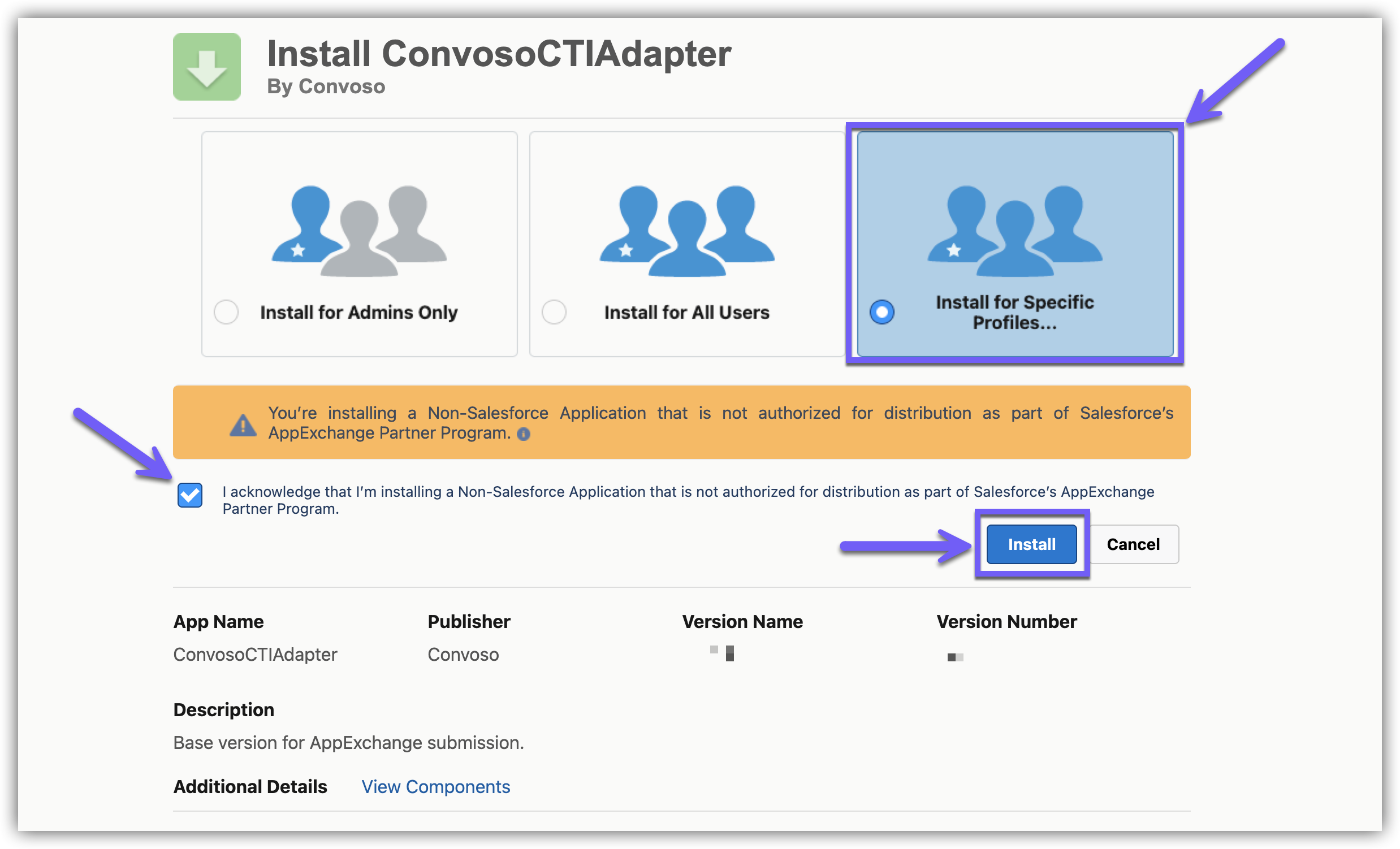 Once the Acknowledgment is checked, the Install button will become active and turn blue.