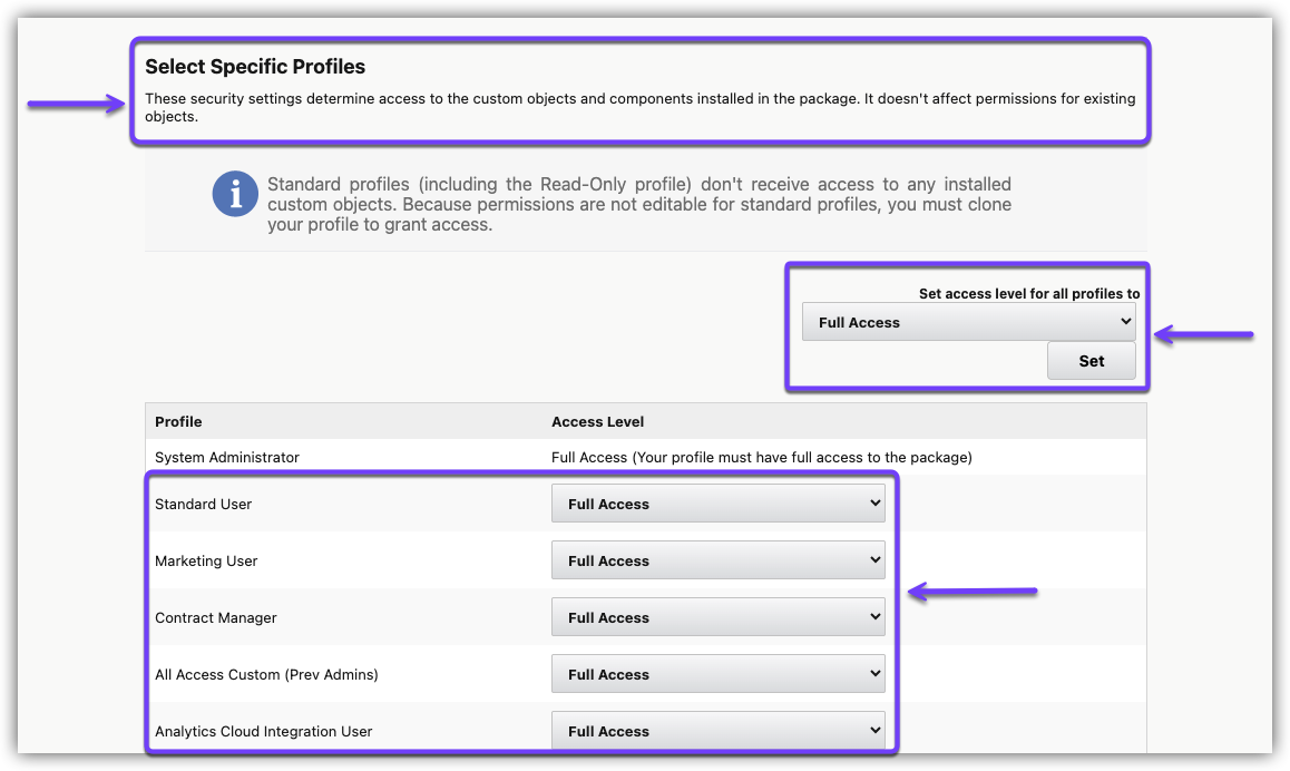 When using the Set all profiles action, click the Set button to save the access level selections for all profiles.