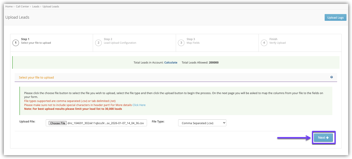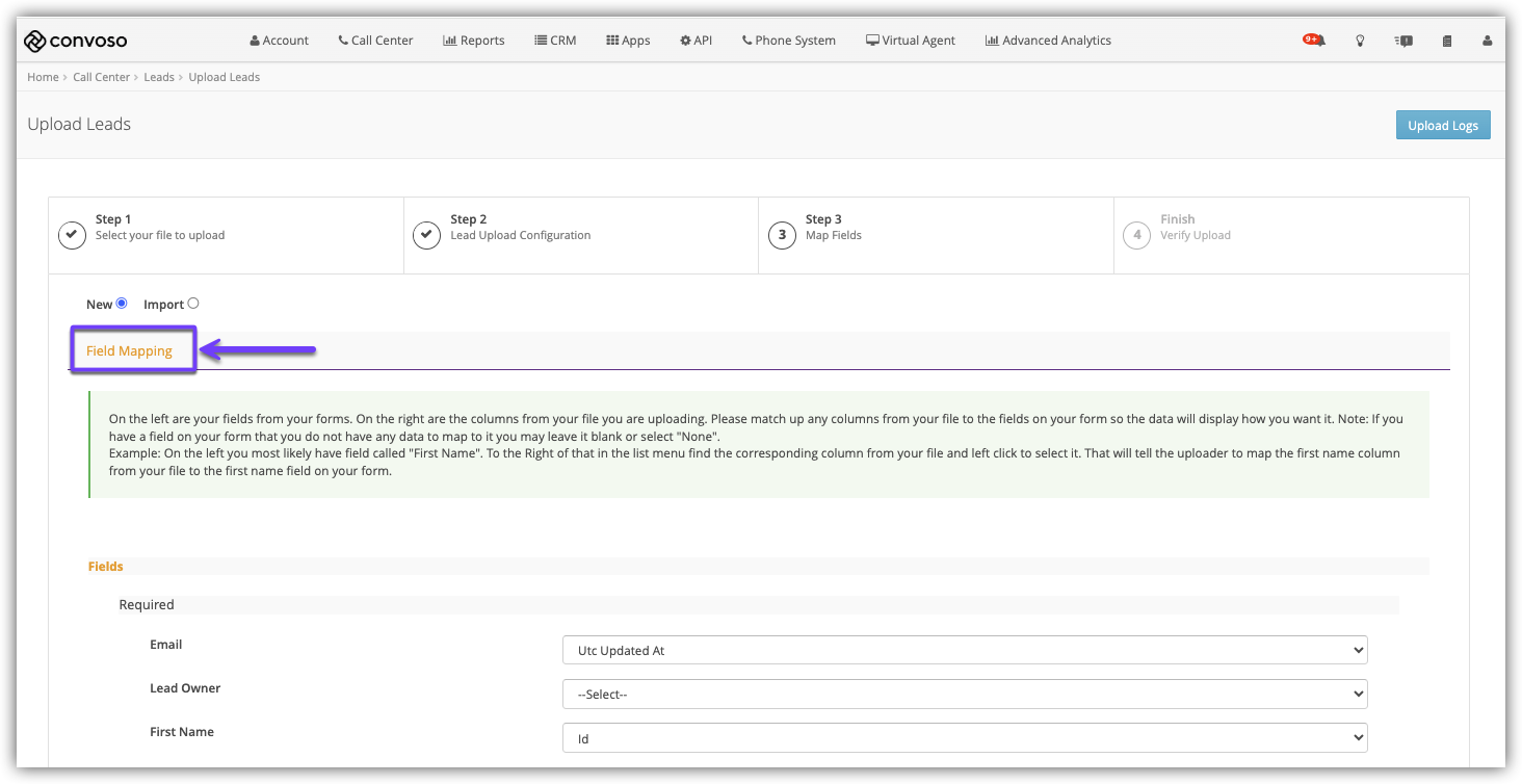 - Called Count: Select the column for Leads Call Count from the List you are uploading.