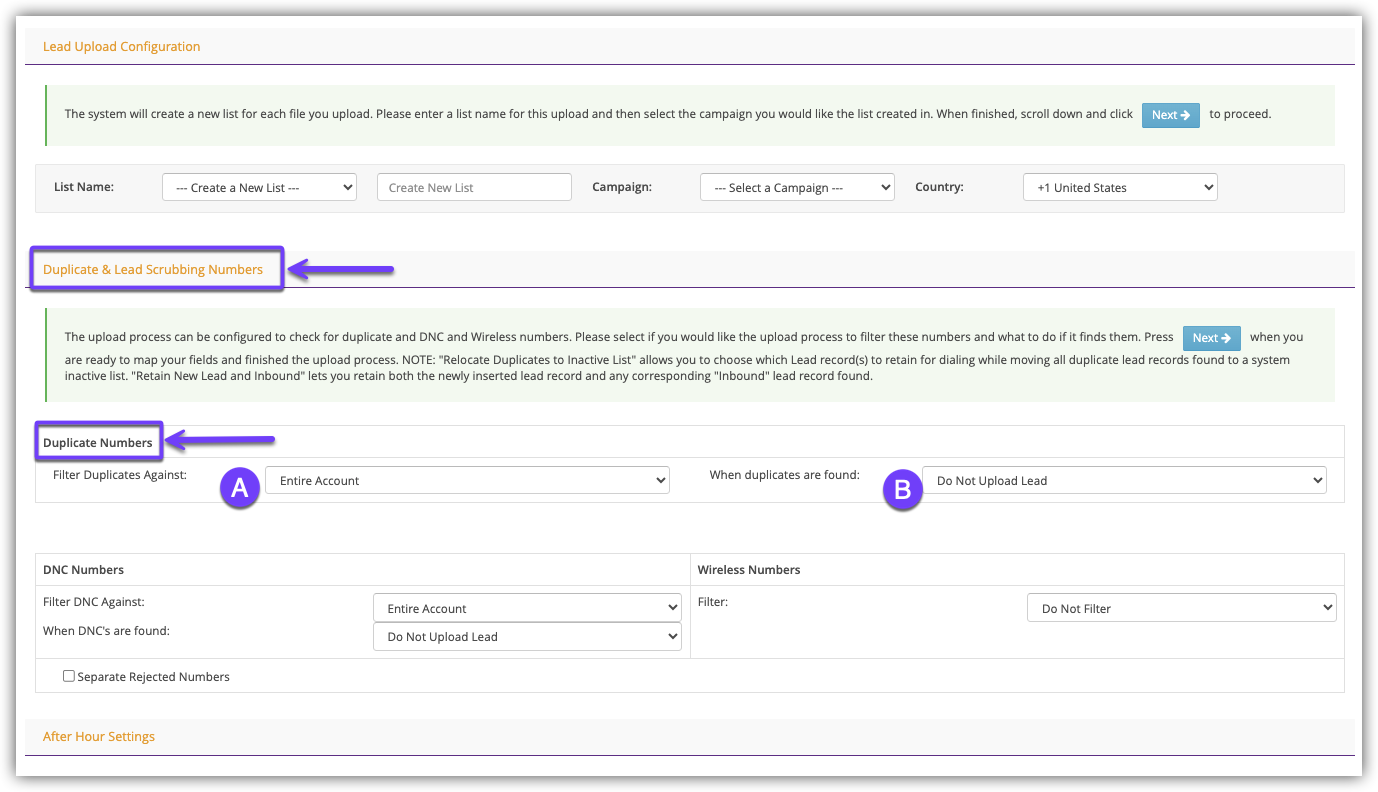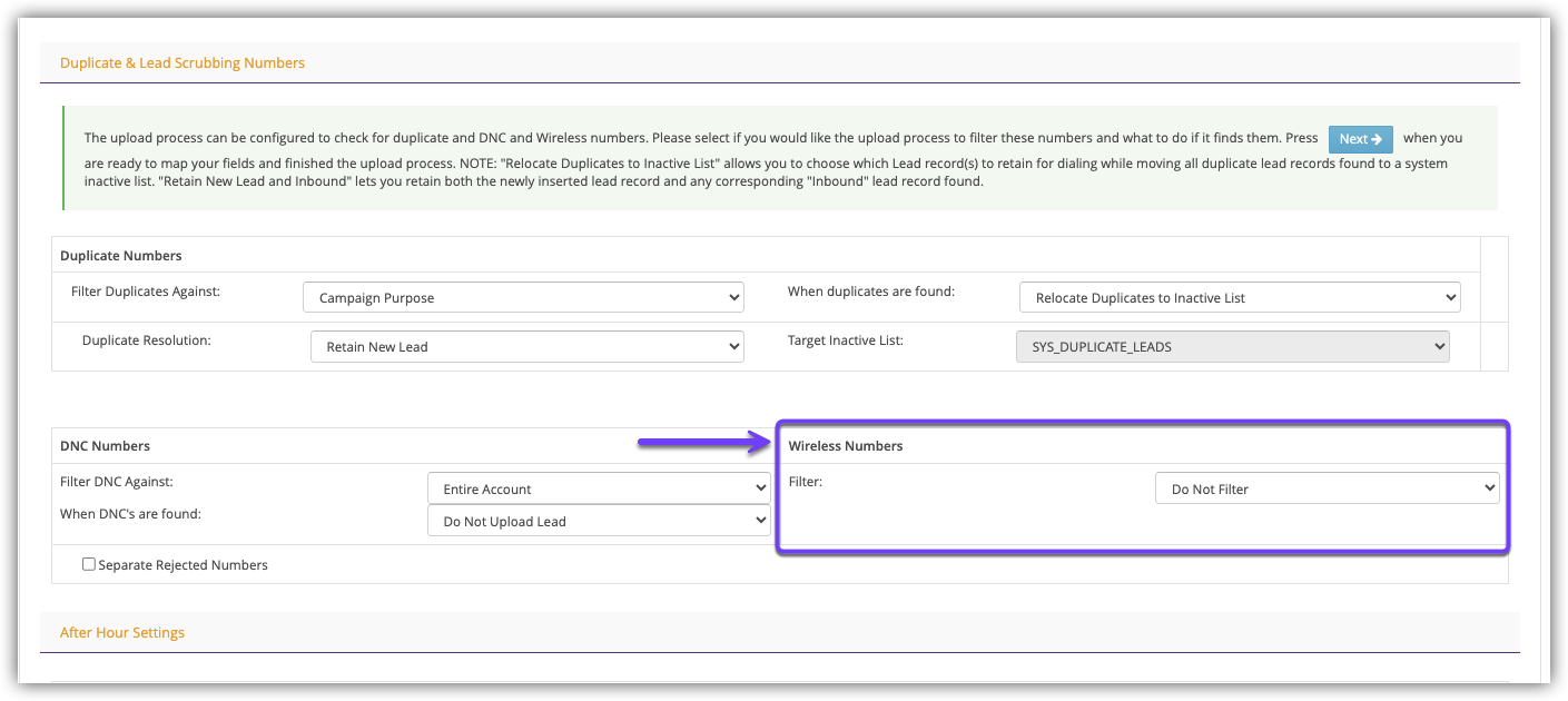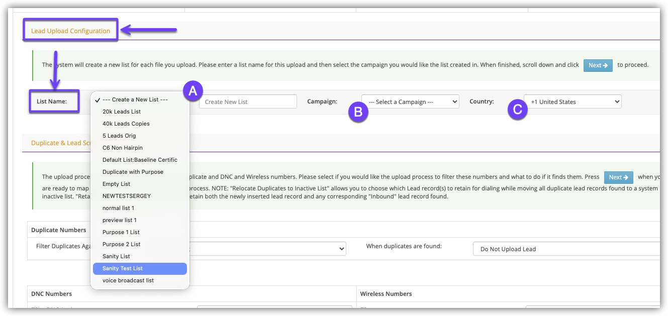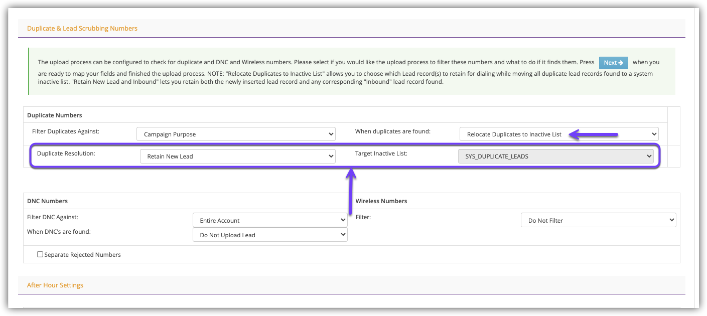 New Numbers will be uploaded but but system will check for duplicates according to preferences below and any duplicate lead records found for that phone number will be moved to a list named "SYS_DUPLICATE_LEADS".- When Relocate Duplicates to Inactive List is selected two extra fields open: