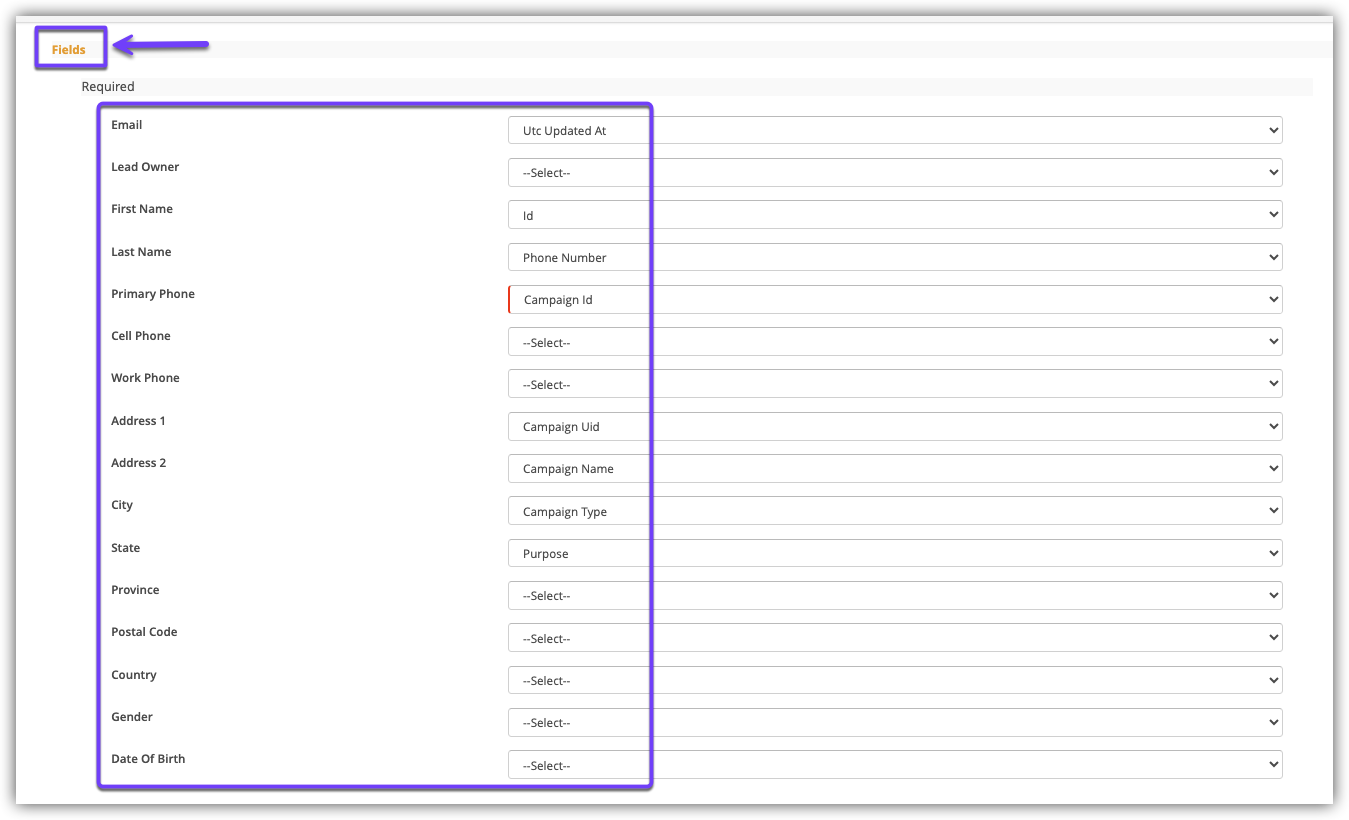 For each Form Field on the left, select the corresponding column in your file from the drop-down menus on the right.- The only required field is the Primary Phone number.