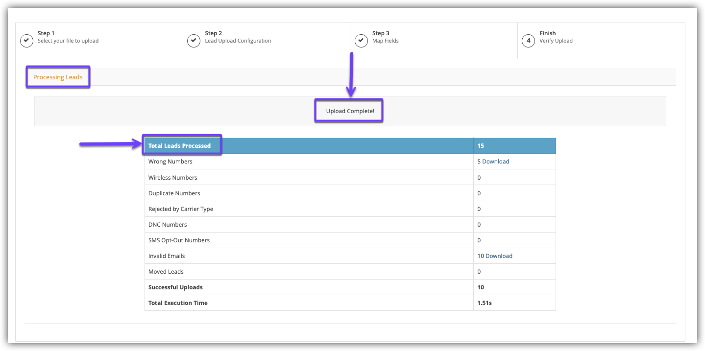 Duplicate numbers will be uploaded with a Status of Duplicate Lead Upload. -
