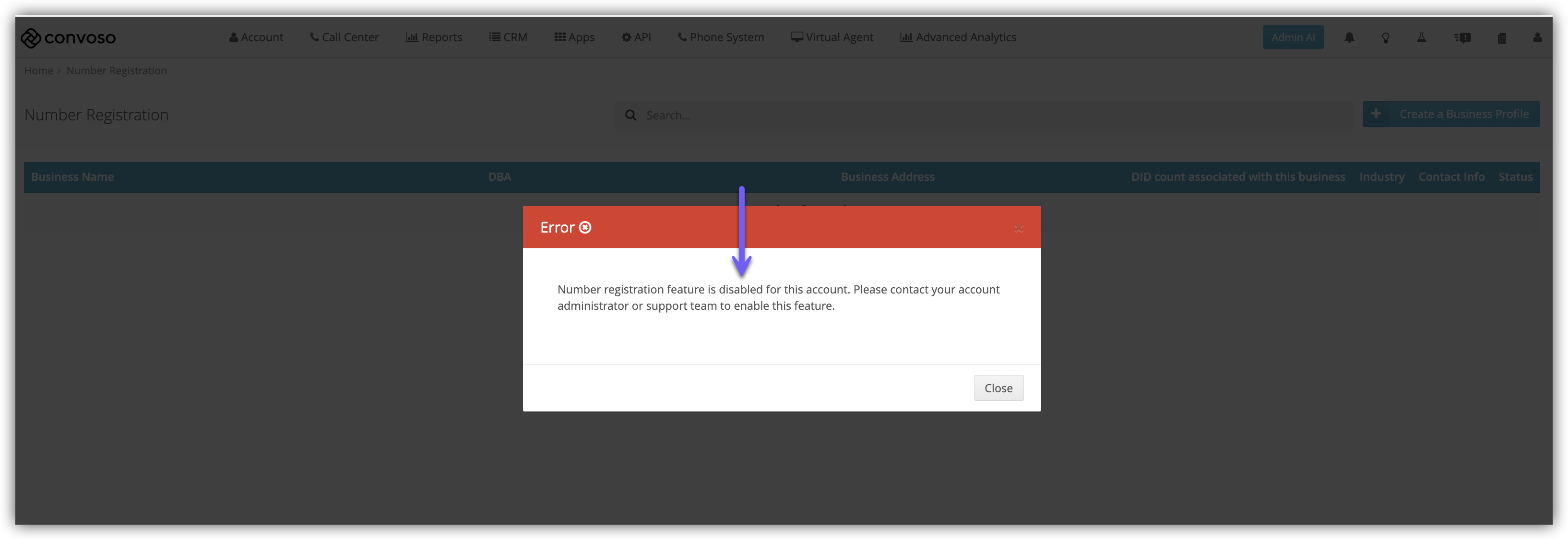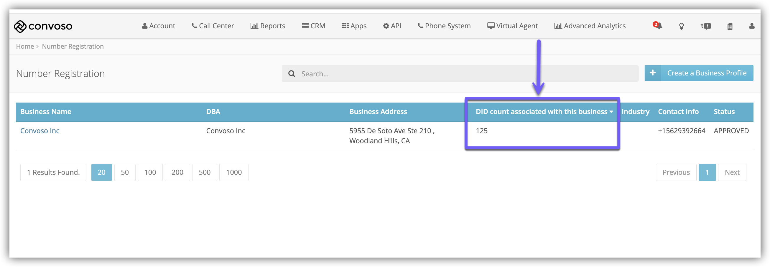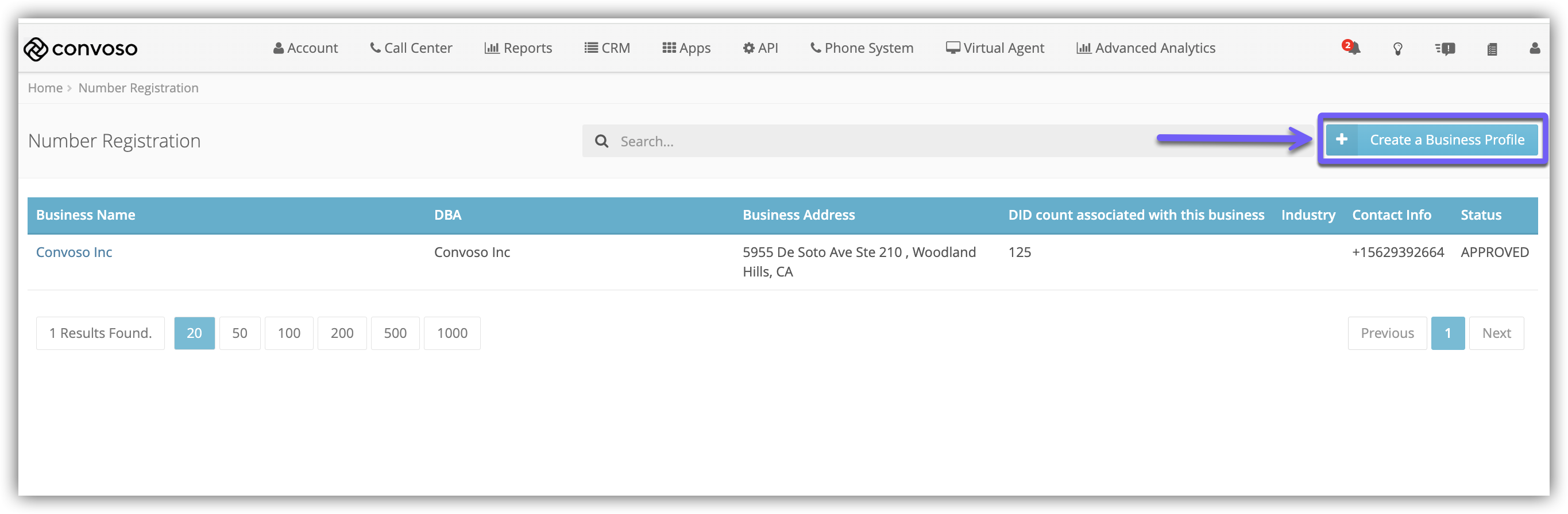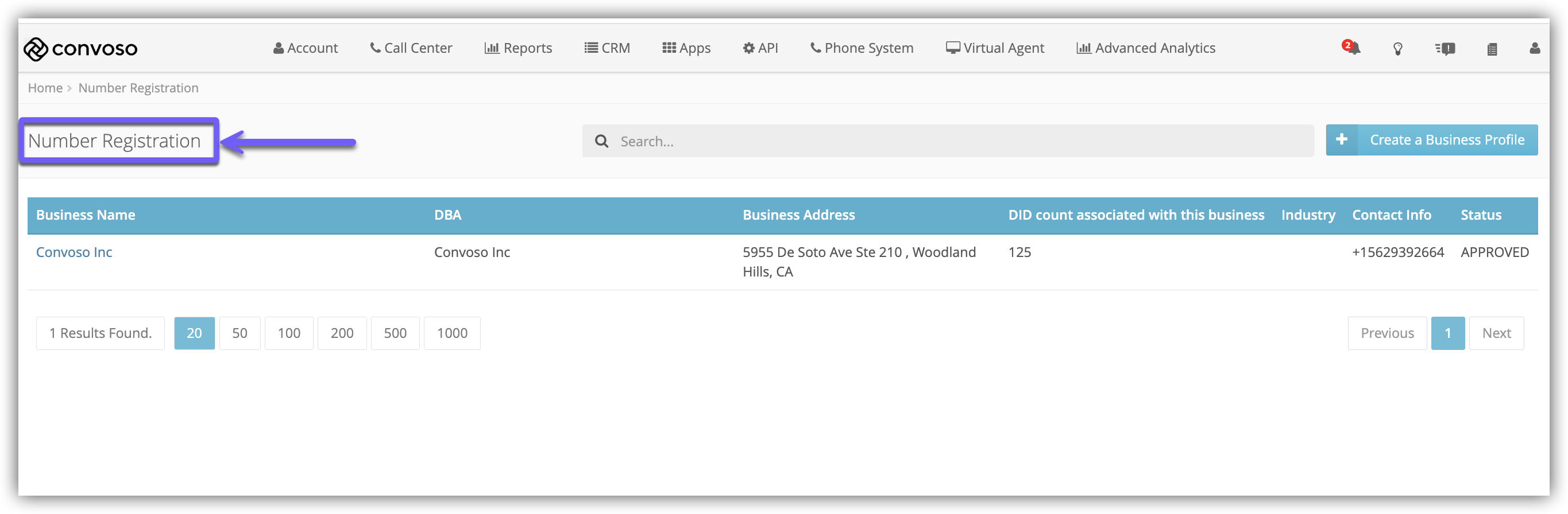 The Number Registration page is where Admins can create Business Profiles that DIDs are then registered to via the Inbound Numbers page.
