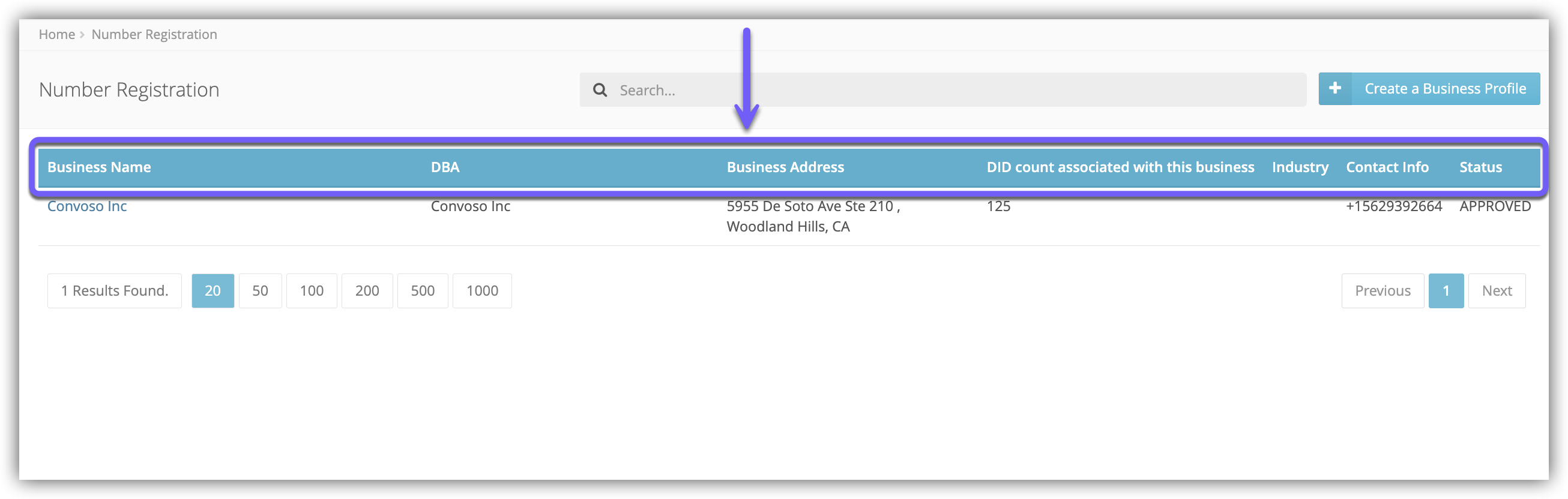 Once there are numbers registered to a Business Profile they will be listed in a table.