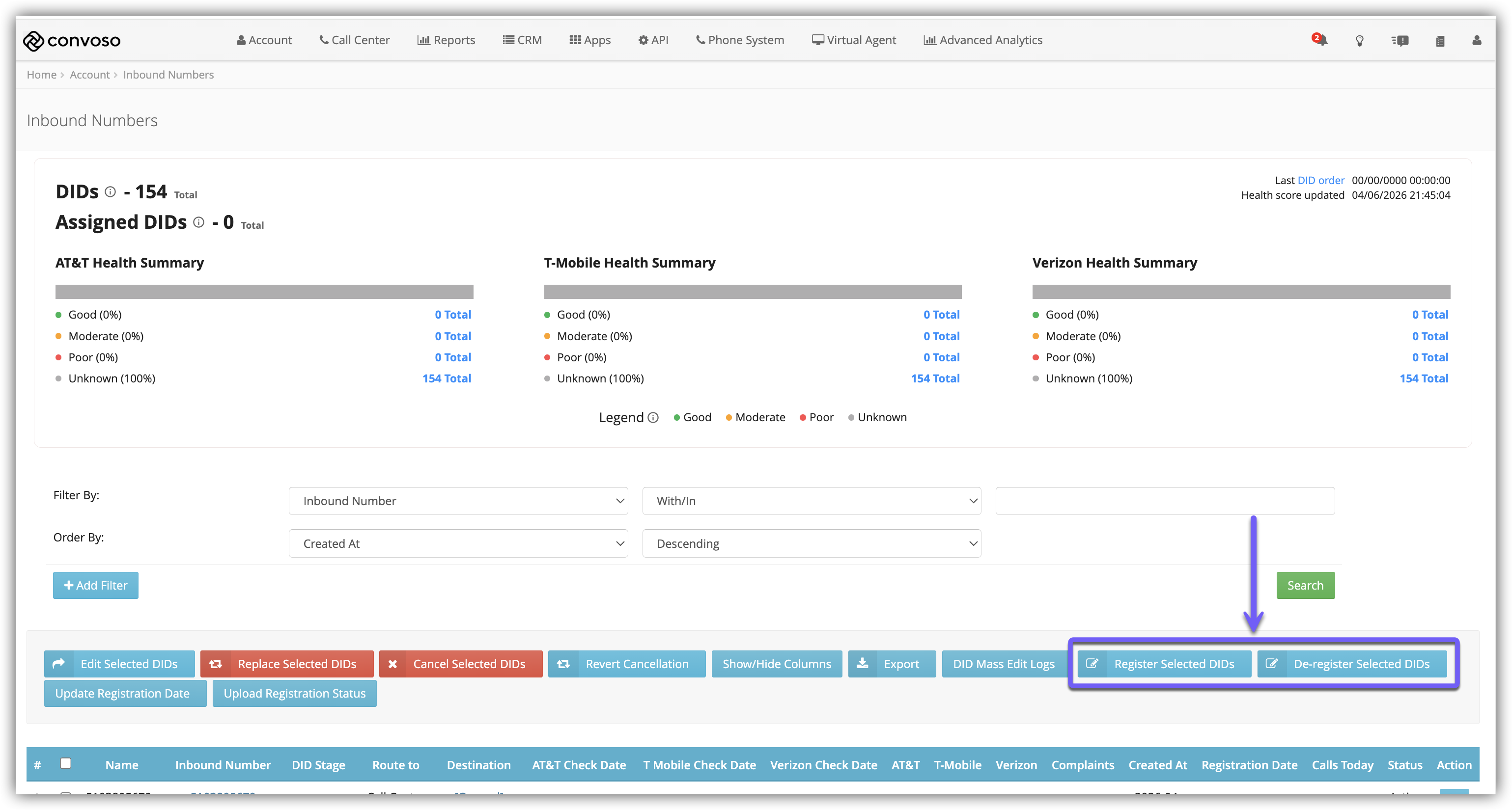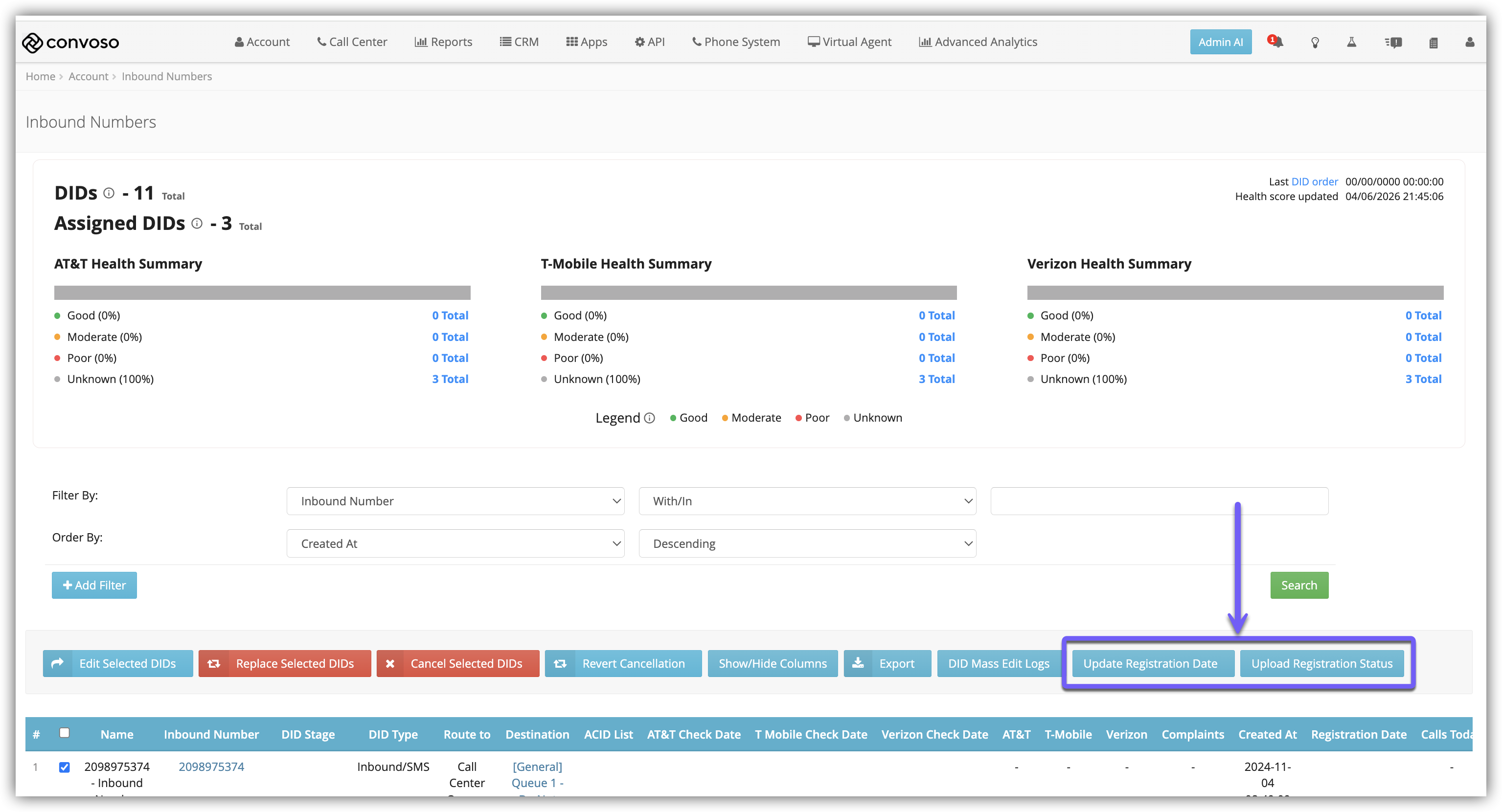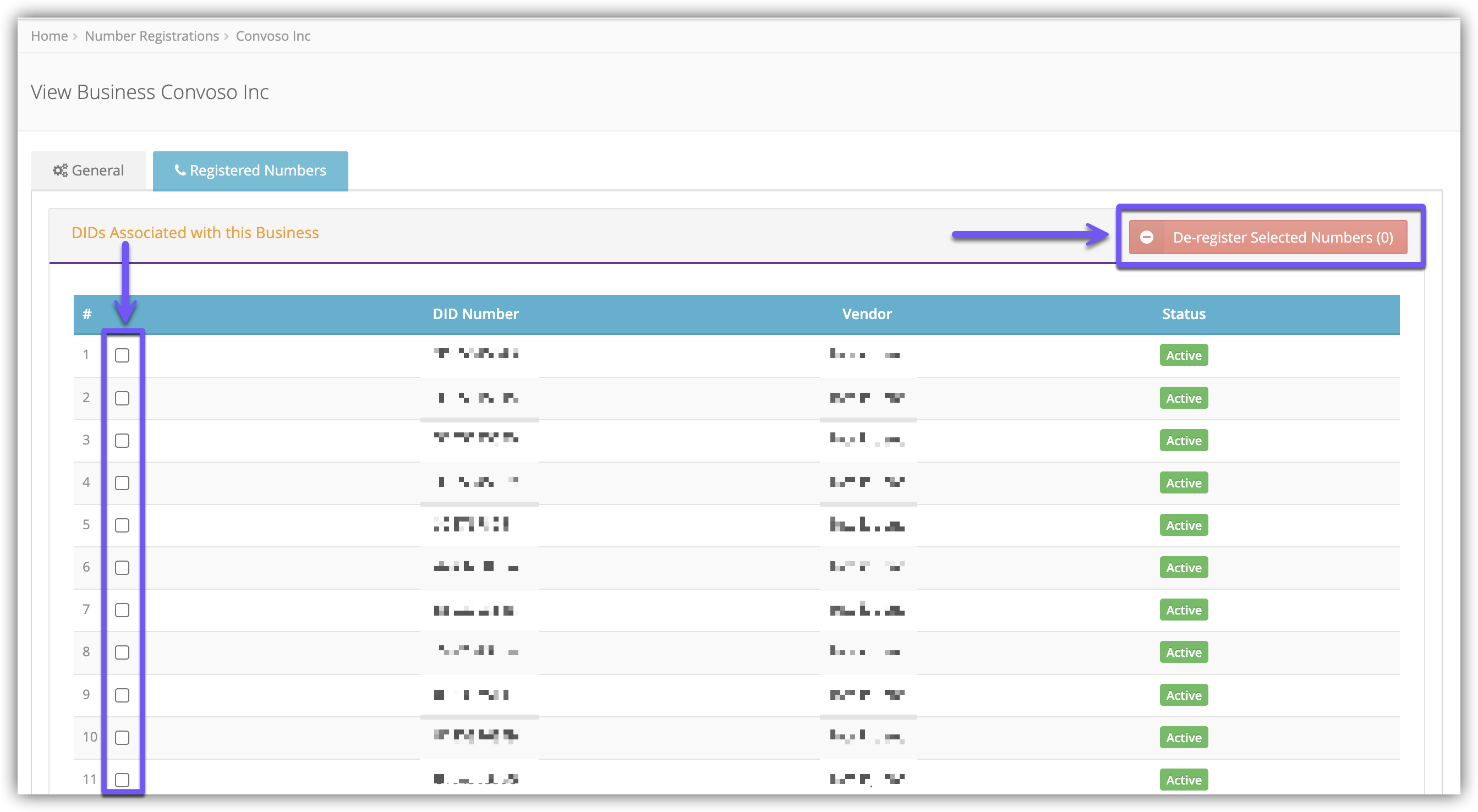 With Number Registration enabled, you will see the Register Selected DIDs and De-Register Selected DIDs buttons, as well as the Update Registration buttons.