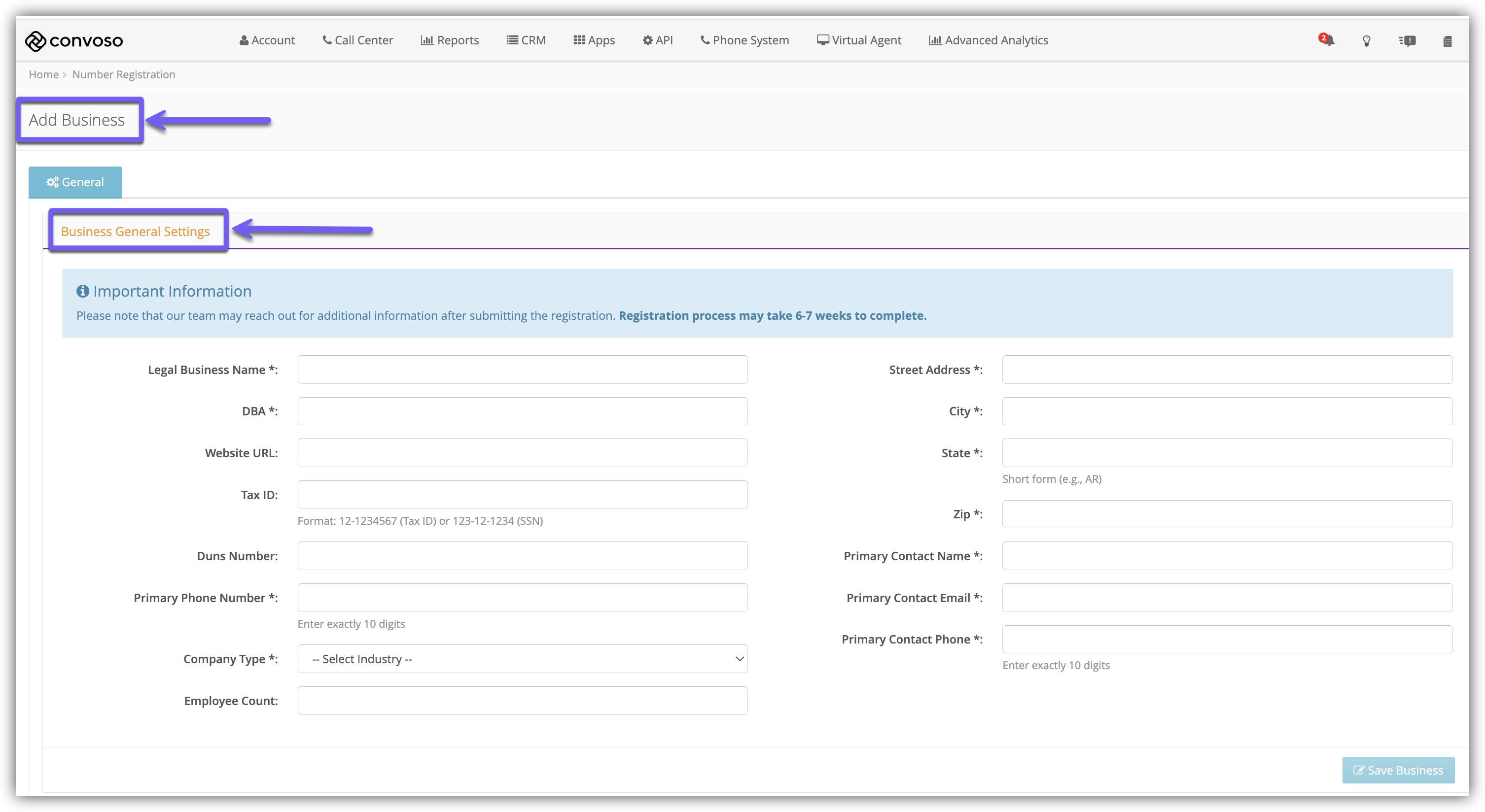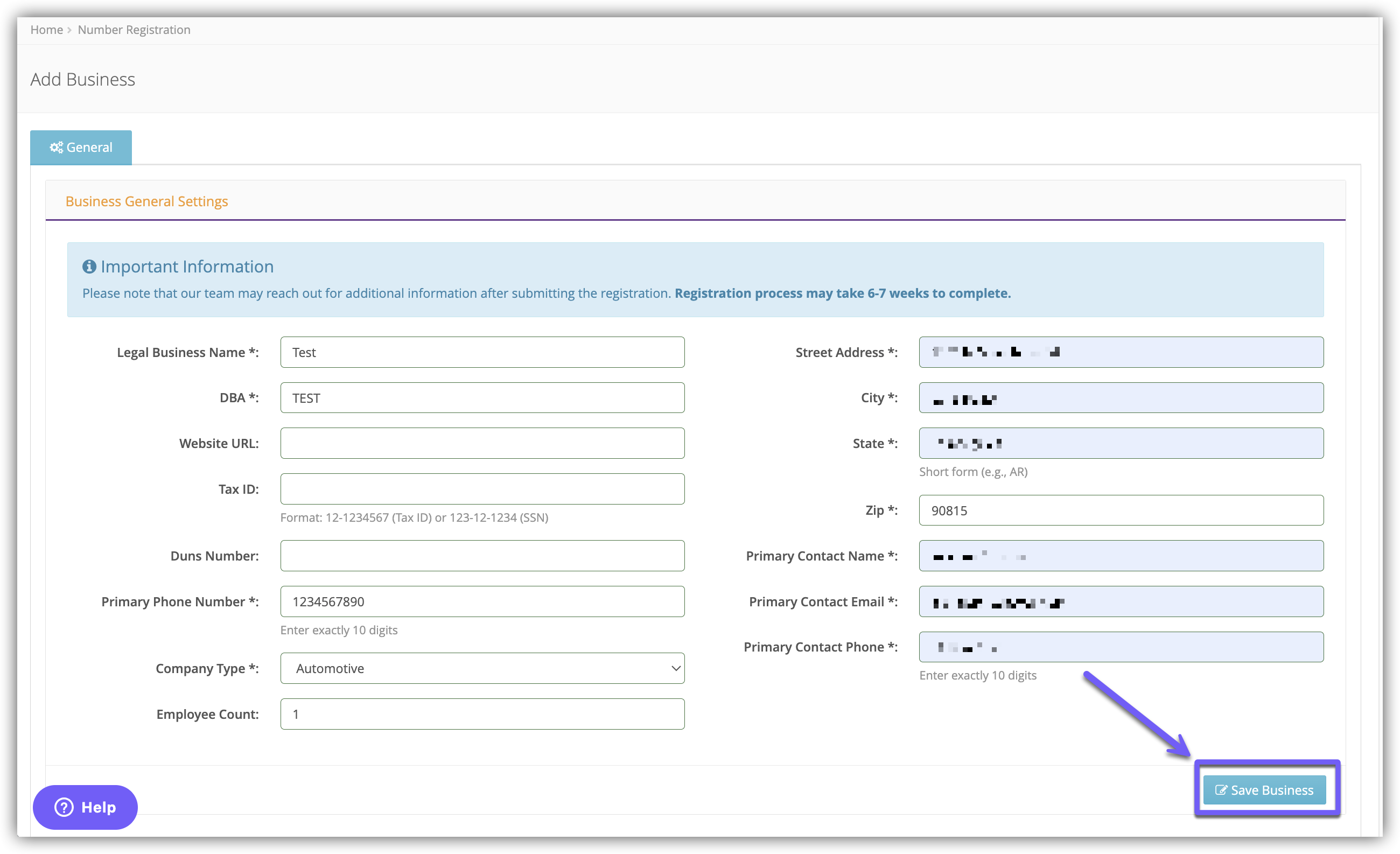 Fill in the fields in the Business General Settings section.