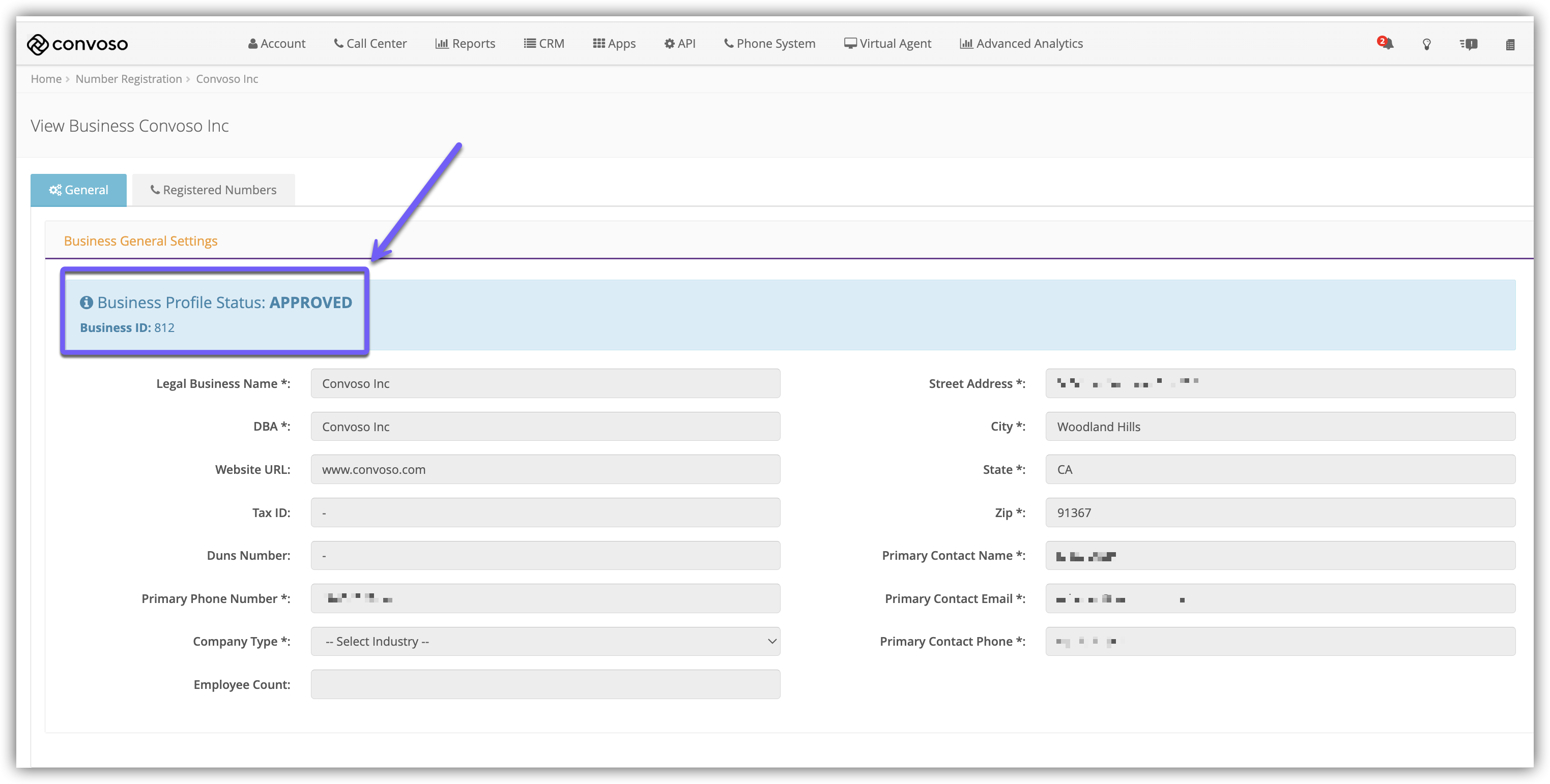 After saving, you will see the View Business page on the General tab.