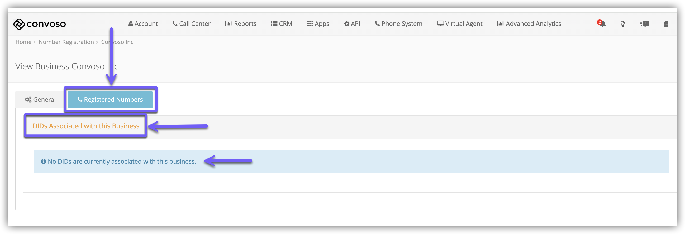 The Registered Numbers tab will show a list of DIDs that have been registered to this Business Profile.