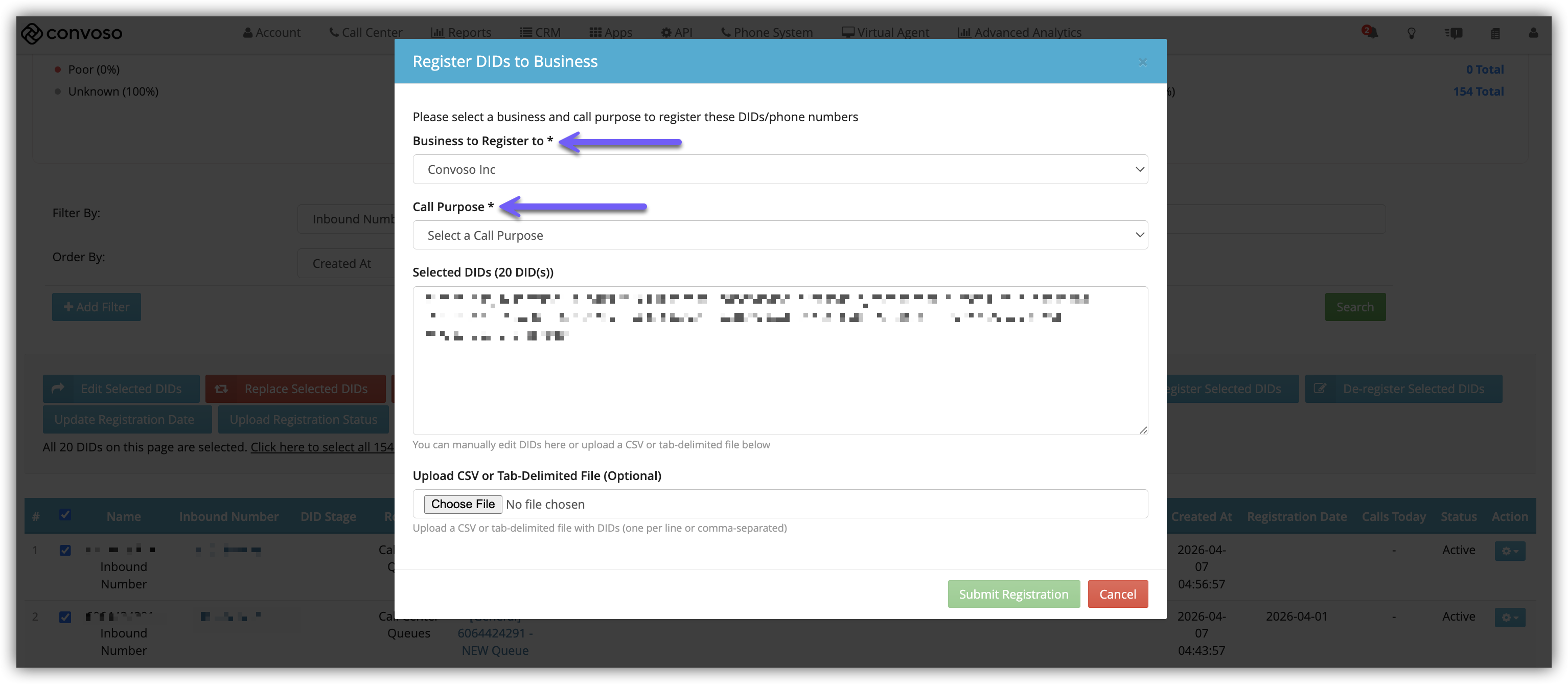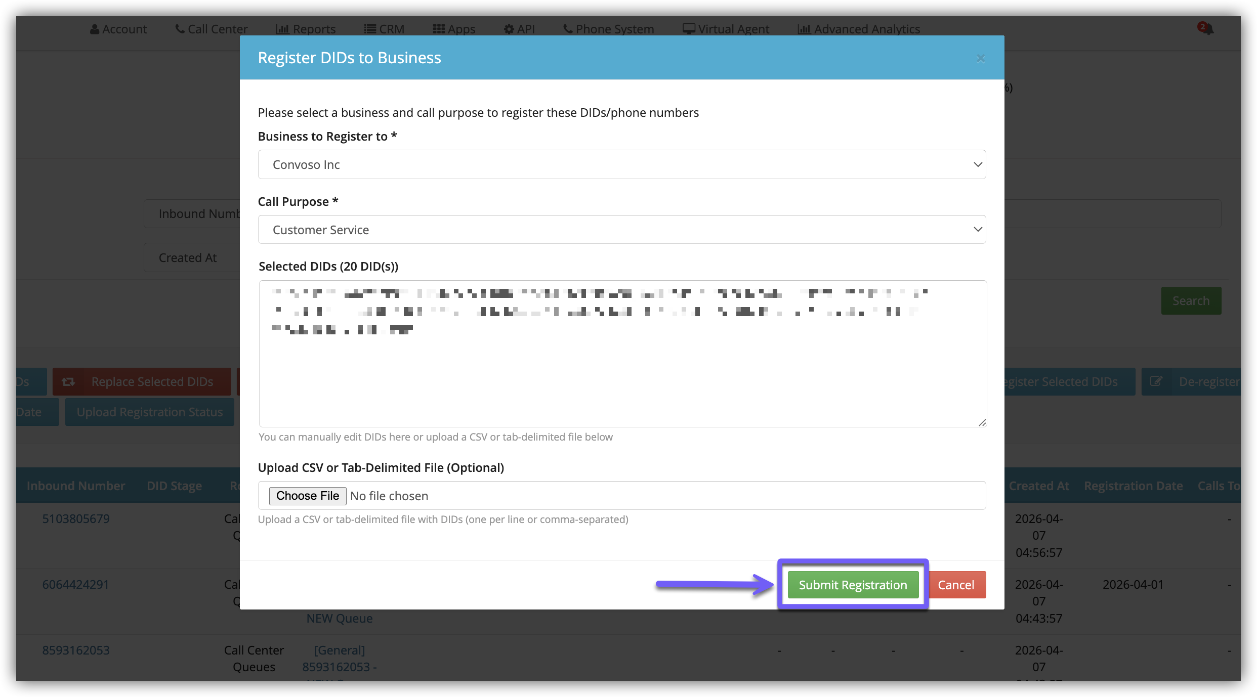 When Registering DIDs, clicking the Register Selected DIDs button will open the Register DIDs to Business modal window.