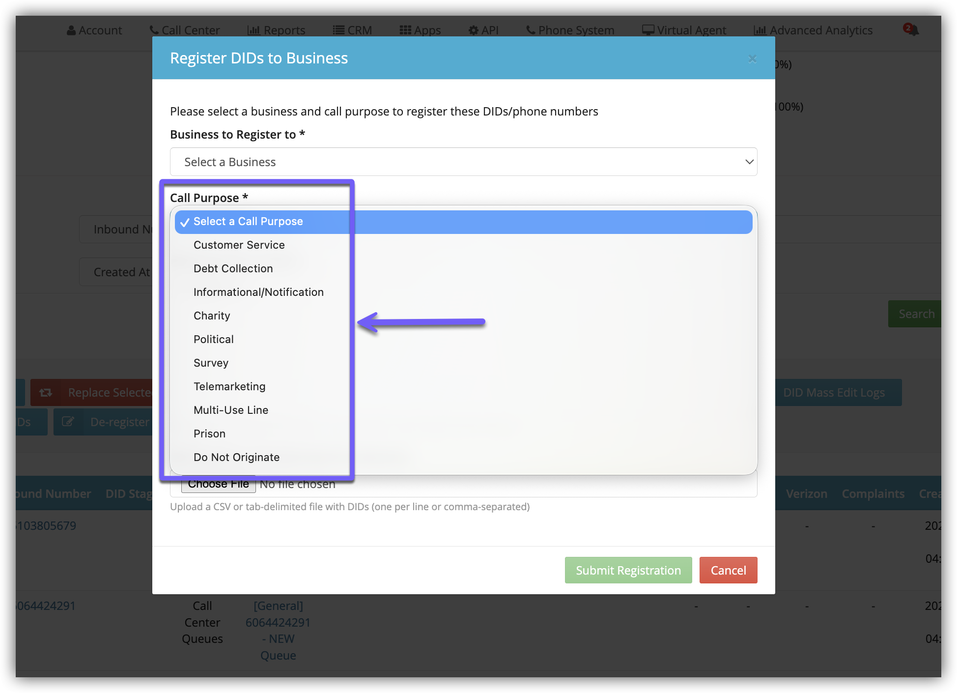 - Select a Purpose from the Call Purpose drop-down. This is the business purpose the numbers are being used for.