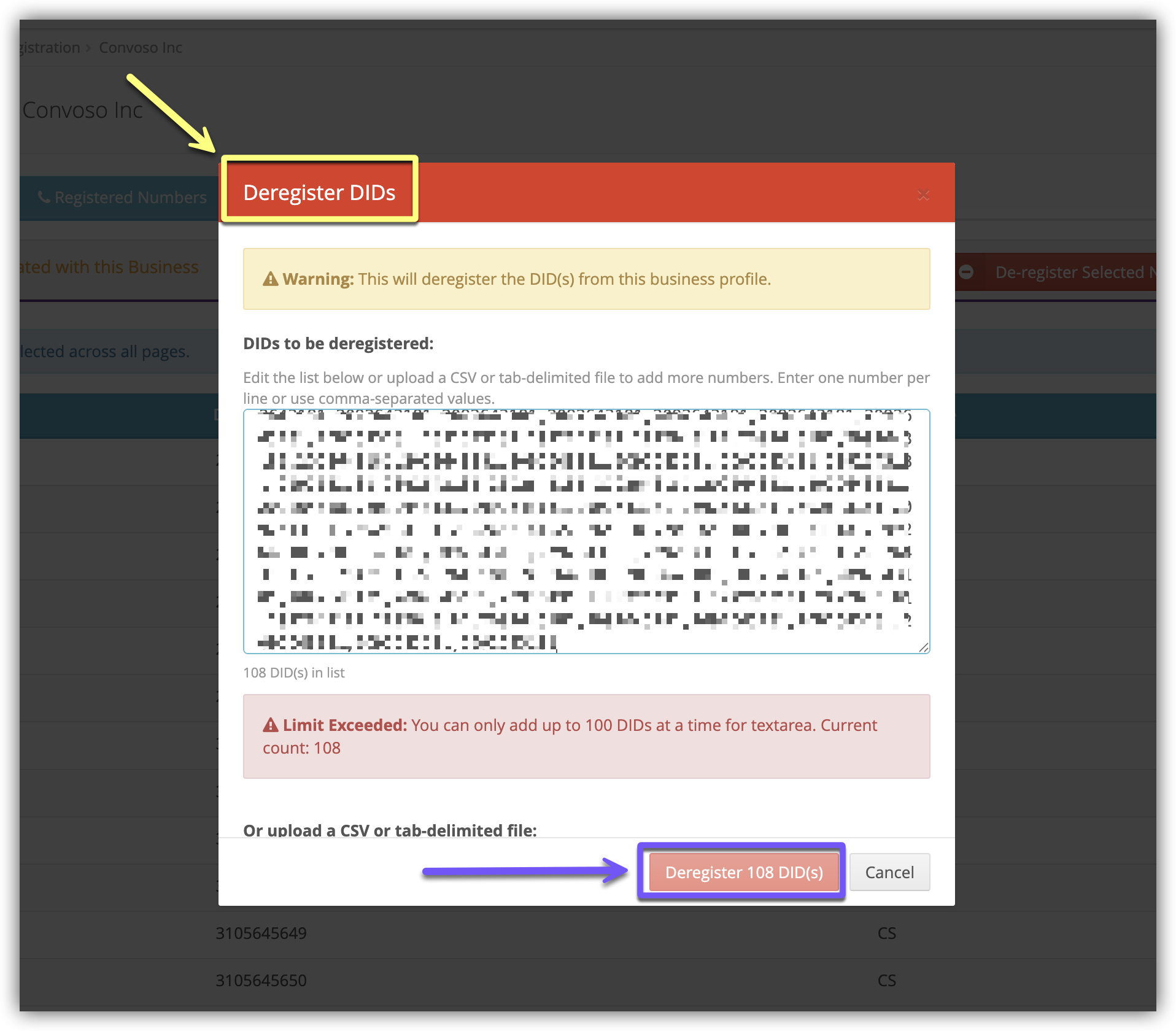 Once you have confirmed the DIDs you want to de-register, click the Deregister (##) DIDs button.