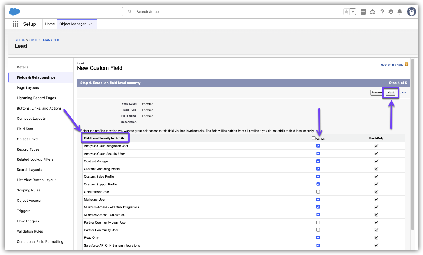 16.) Check the necessary boxes in the Visible column of the Field-Level Security for Profile section to establish Field-Level Security.