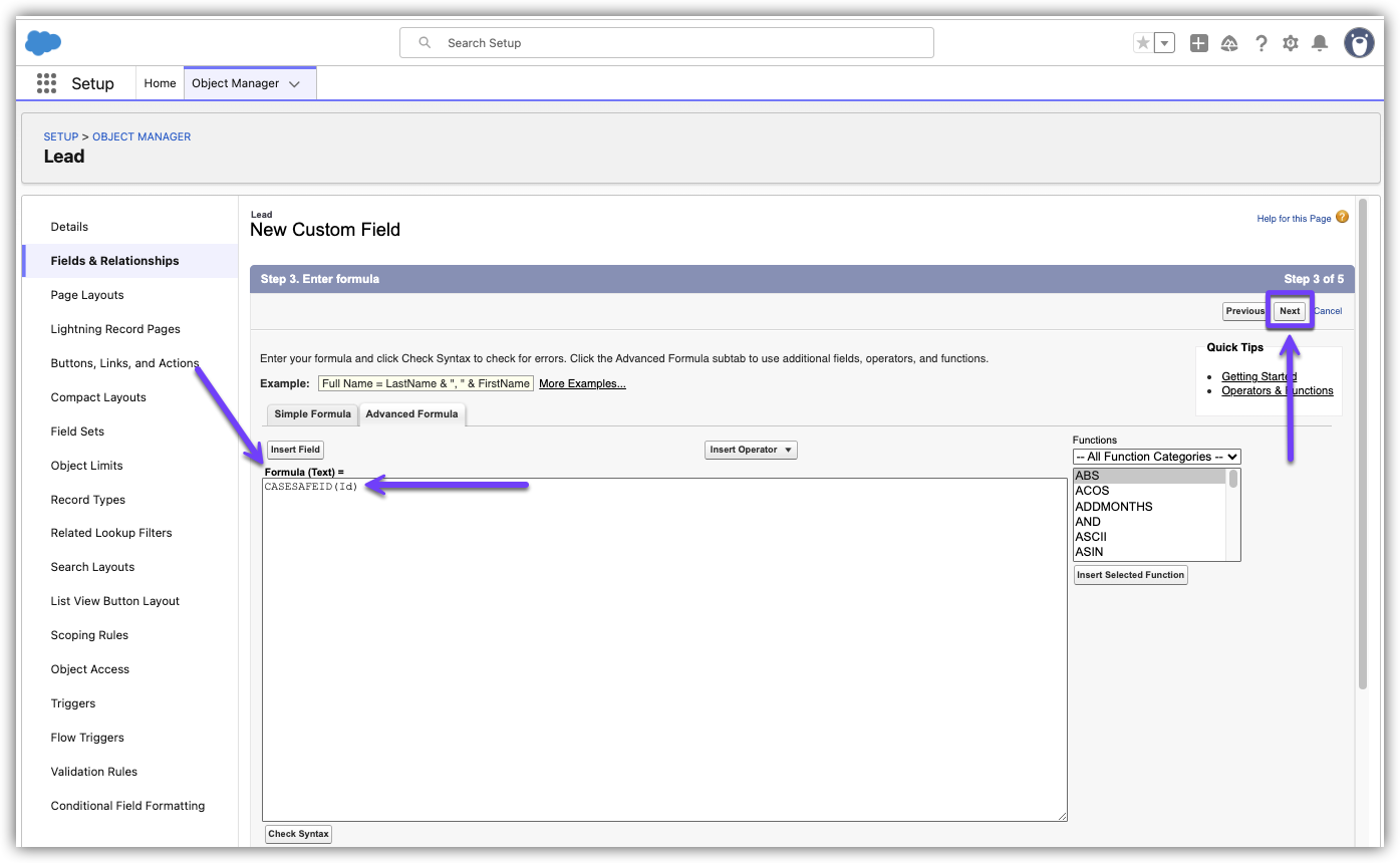 14.) In the text field, insert the following: CASESAFEID(Id)