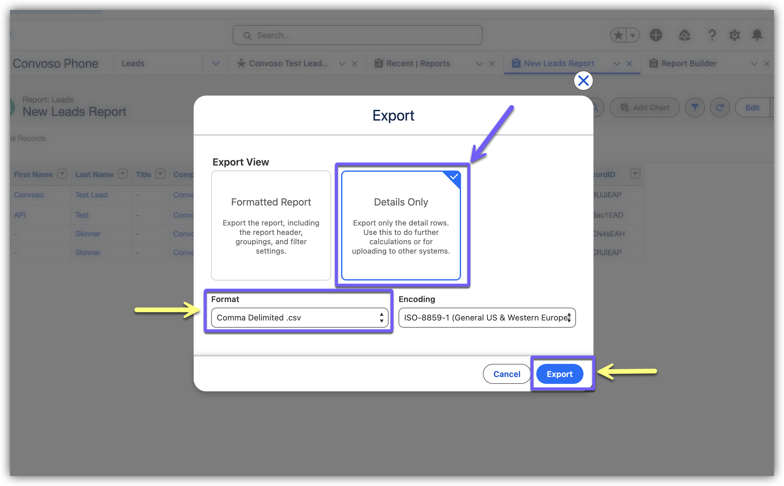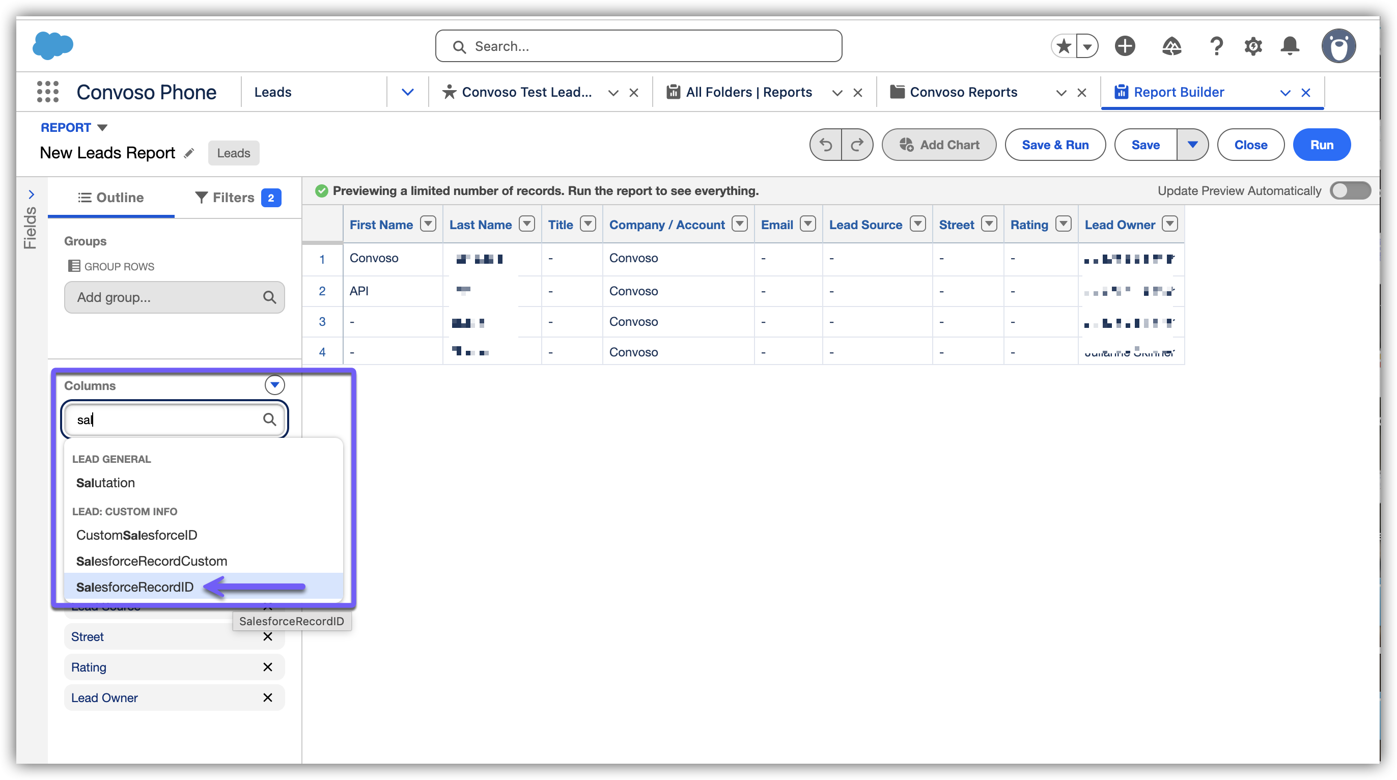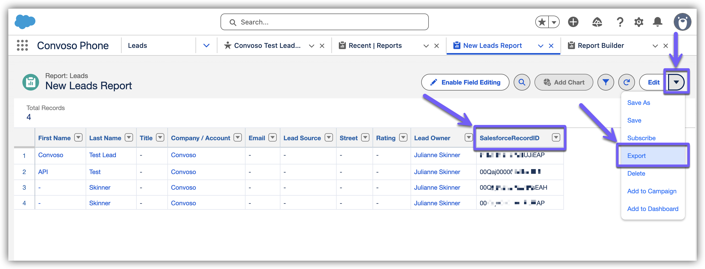 This guide walks Salesforce administrators through preparing Salesforce data for use in Convoso. You’ll create a custom formula field that exposes Salesforce’s 18-character Record ID, add that field to a Salesforce report, and then export the report to a CSV file. The exported CSV can then be used for tasks like uploading a dial list into Convoso.