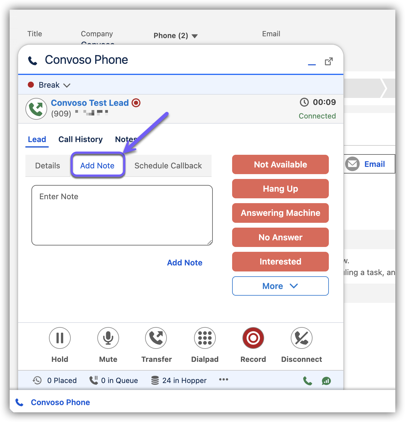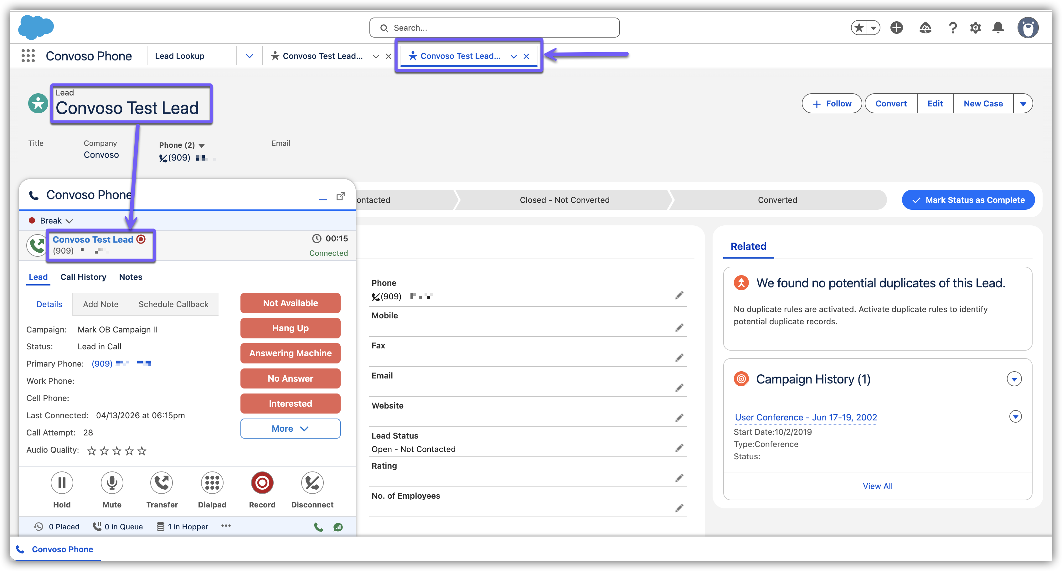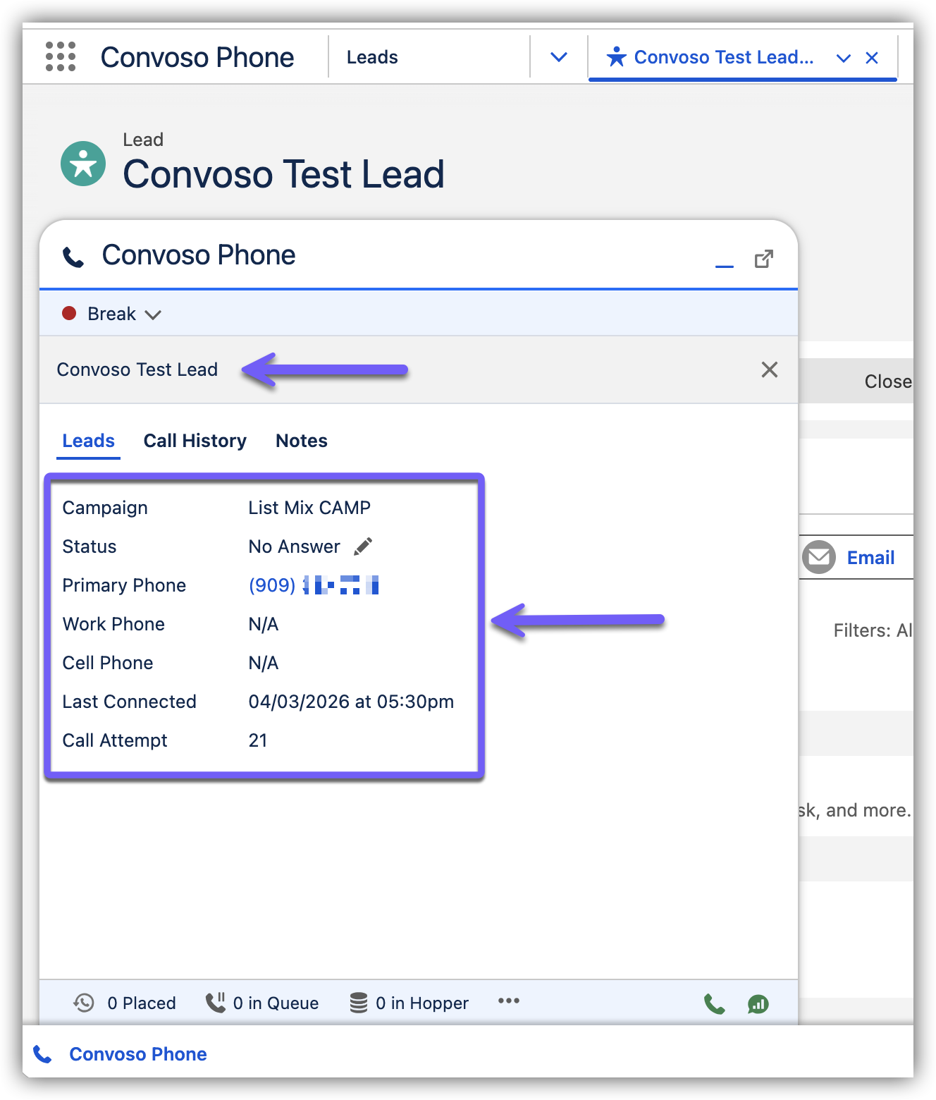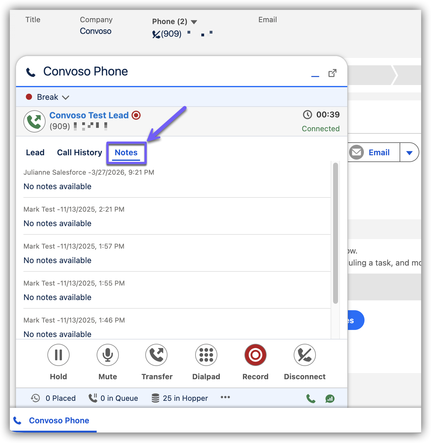 In-Call Tabs on Lead Record The same Call History and Notes tabs are shown on the Lead Record during a call. There are additional Tabs on Lead Records during a call: