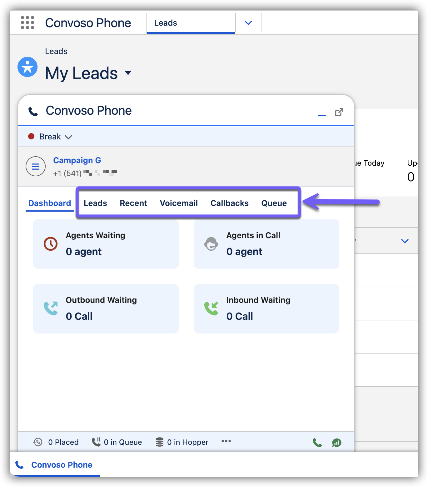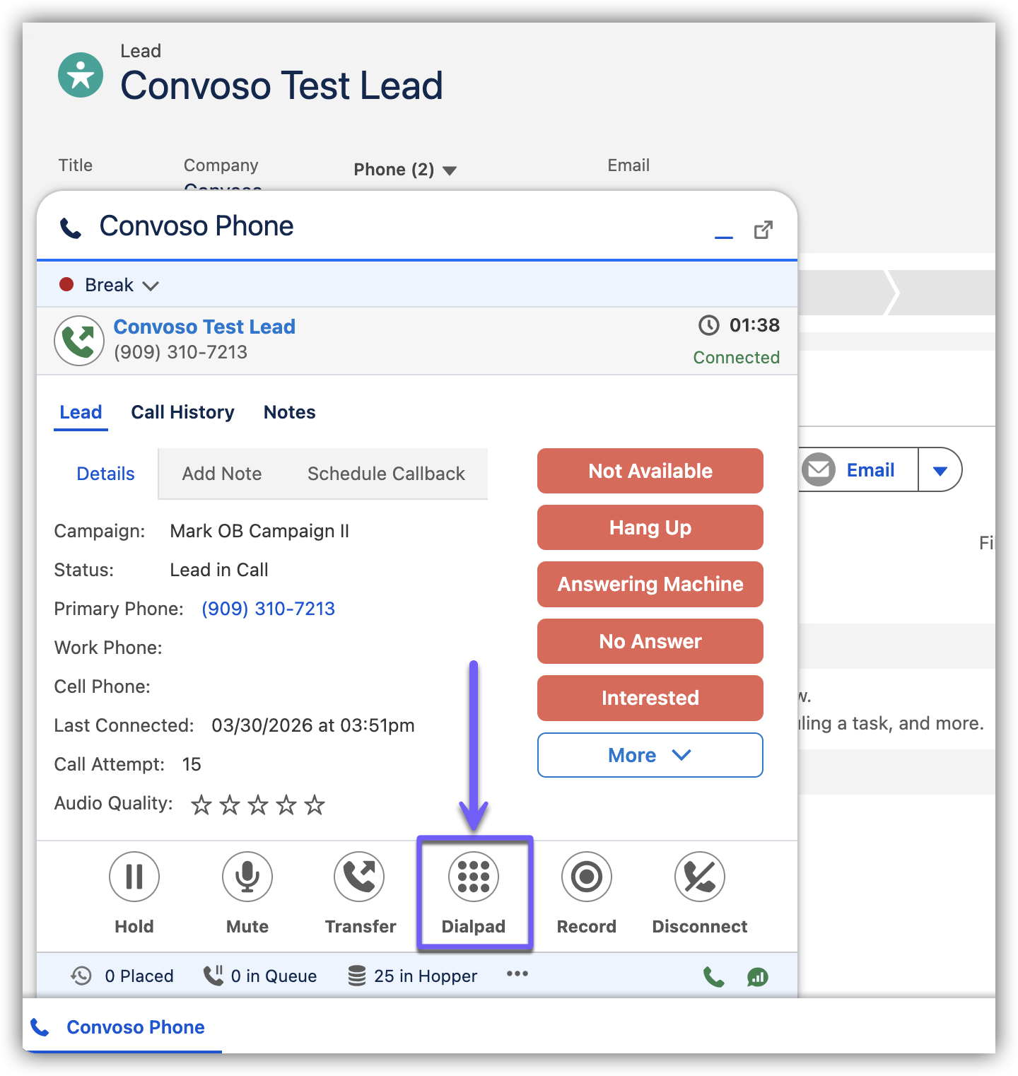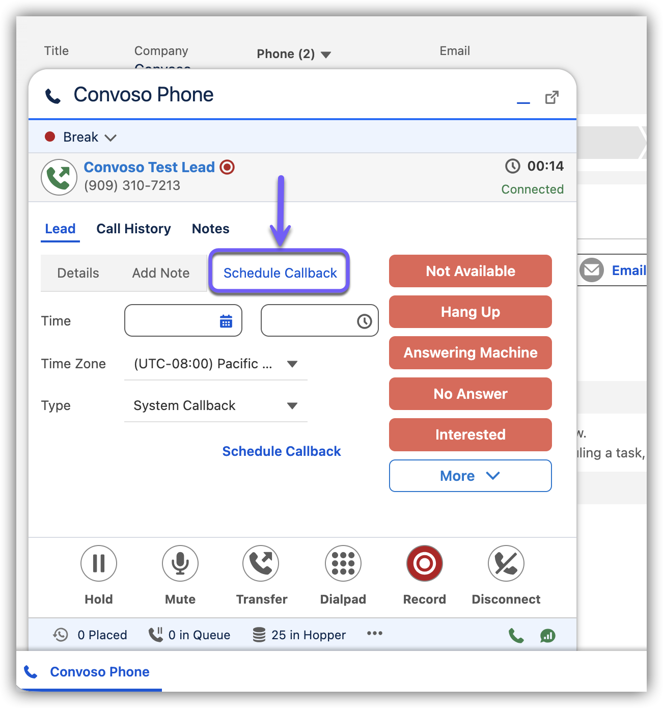 In-Call Tabs on Lead Record The same Call History and Notes tabs are shown on the Lead Record during a call. There are additional Tabs on Lead Records during a call: