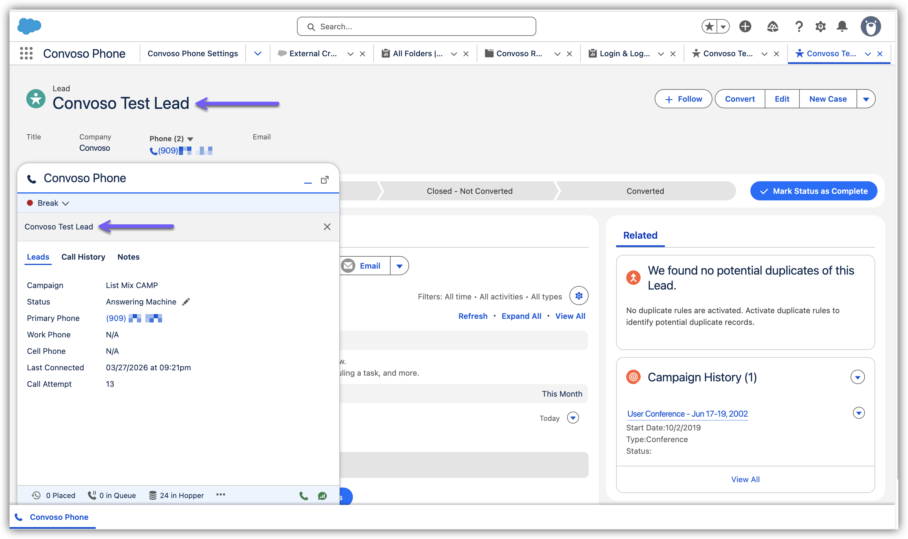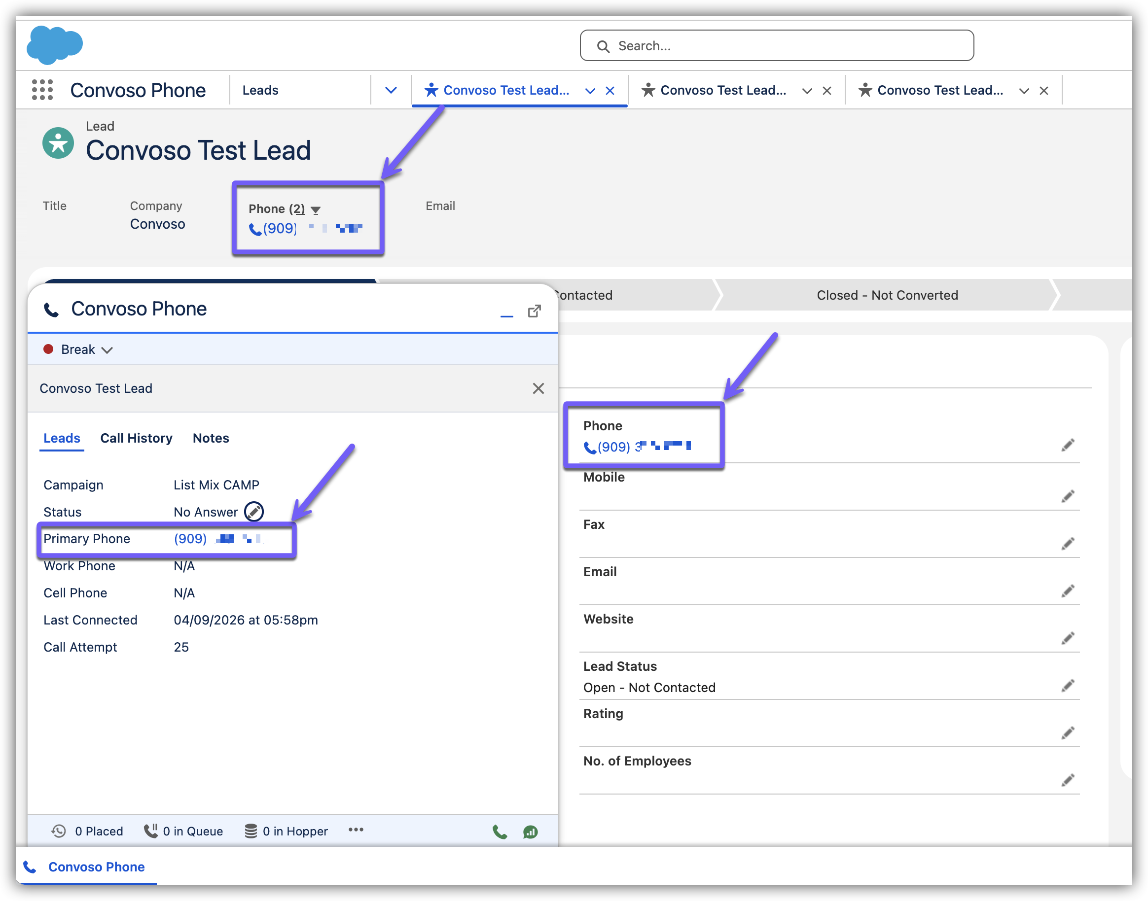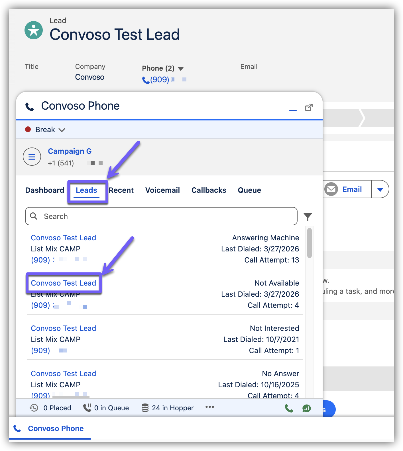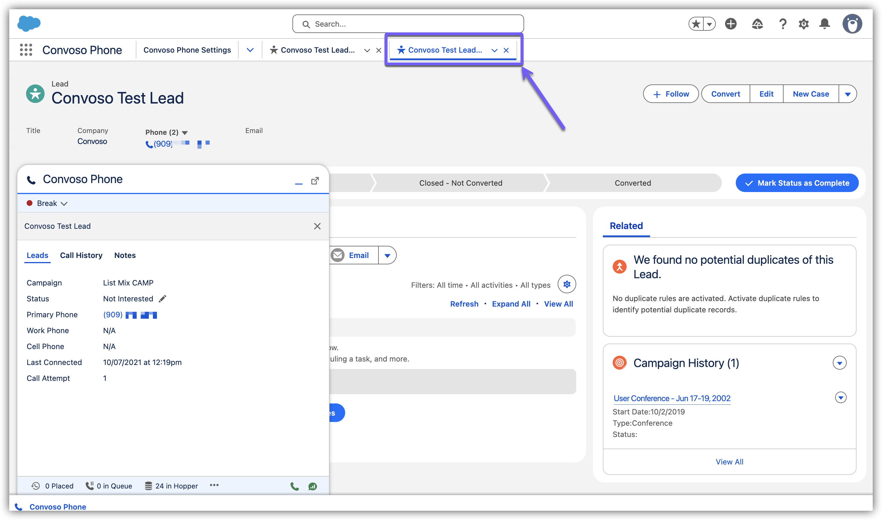 In-Call Tabs on Lead Record The same Call History and Notes tabs are shown on the Lead Record during a call. There are additional Tabs on Lead Records during a call: