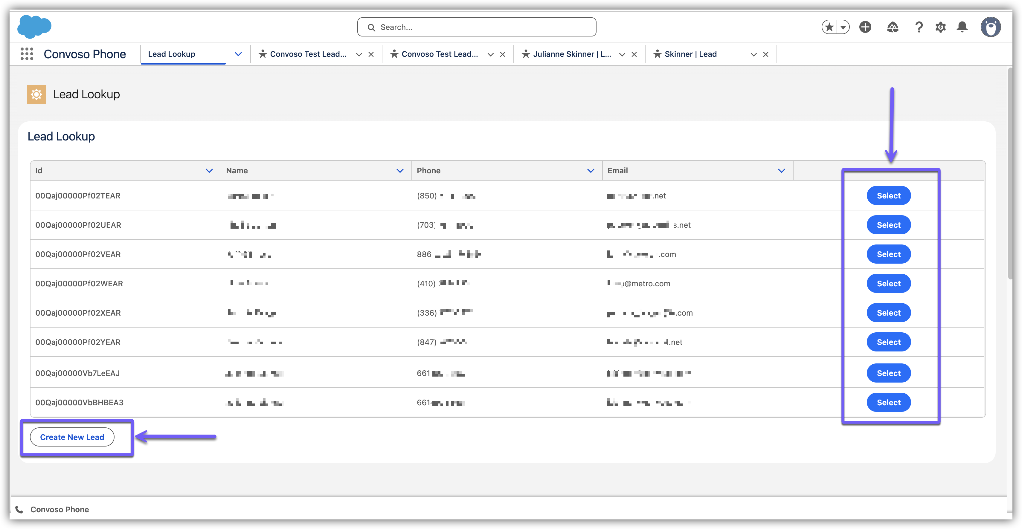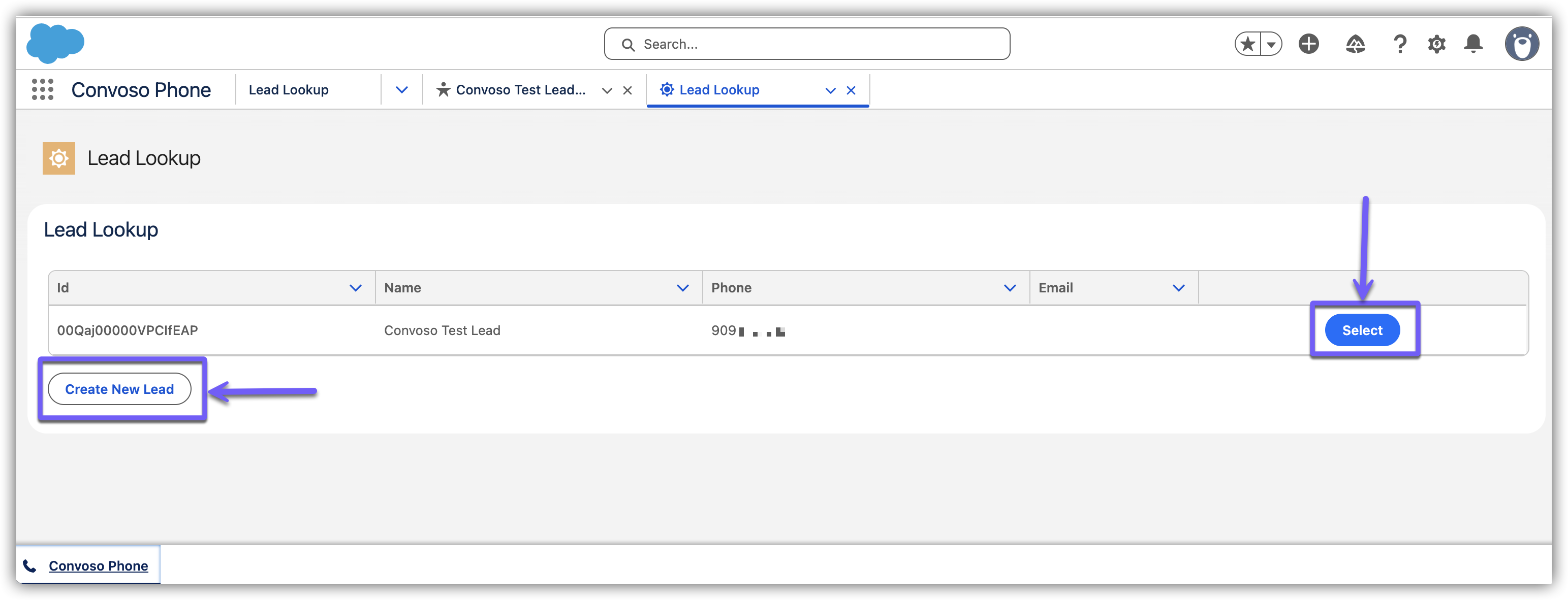 If the Salesforce Lead Identifier has not been provided as part of the Lead upload process, the user will be prompted to select the Lead to associate any call and agent activity.