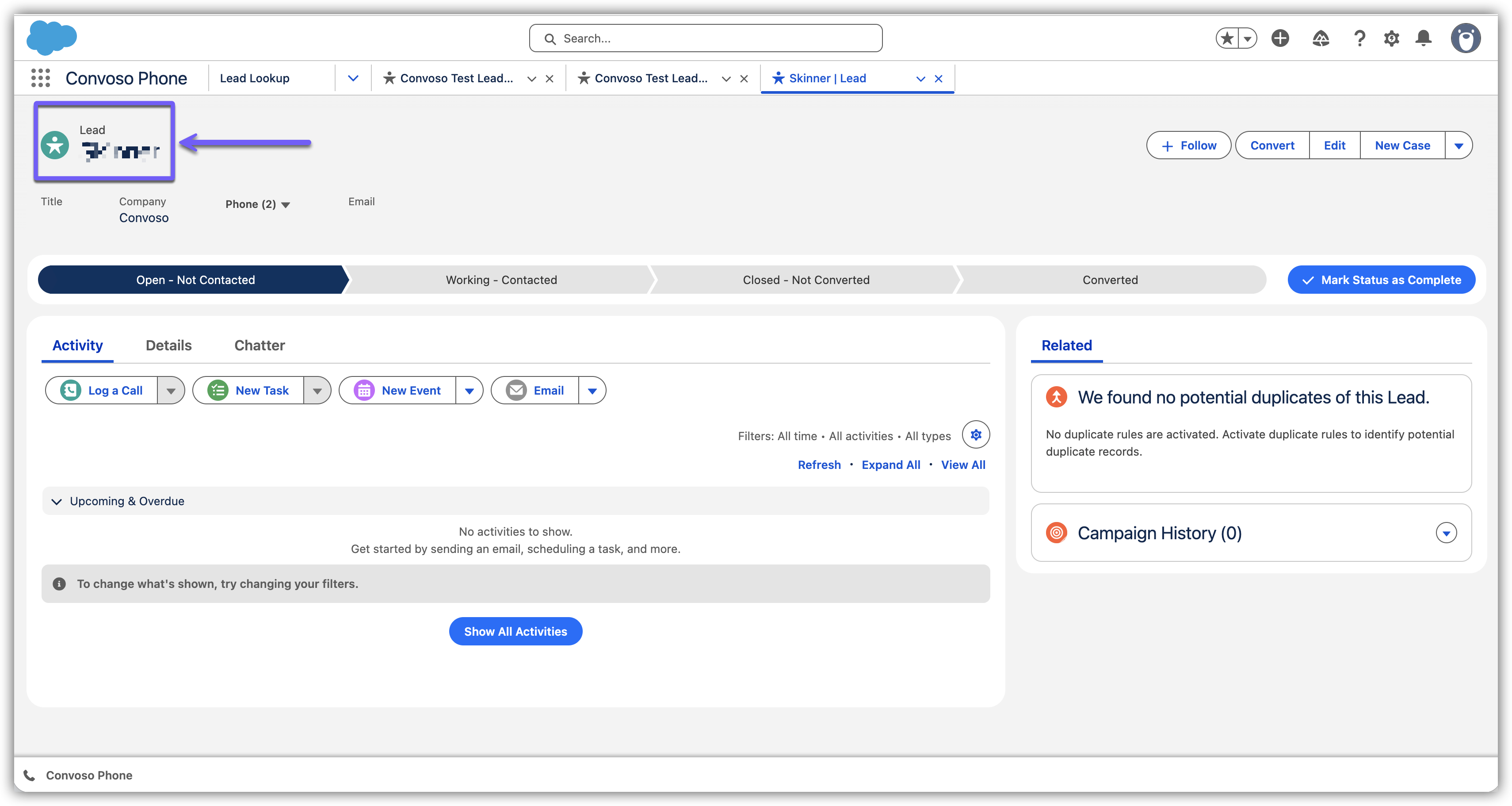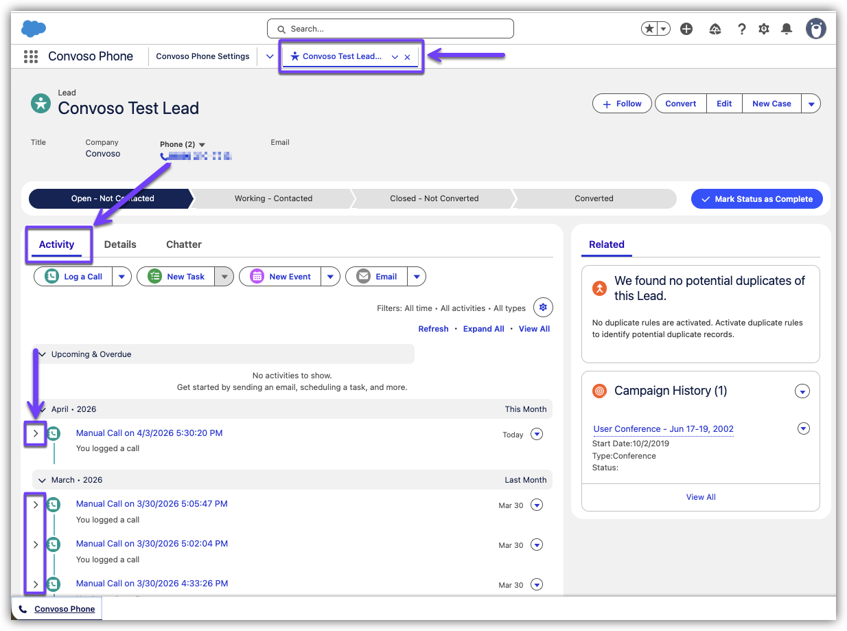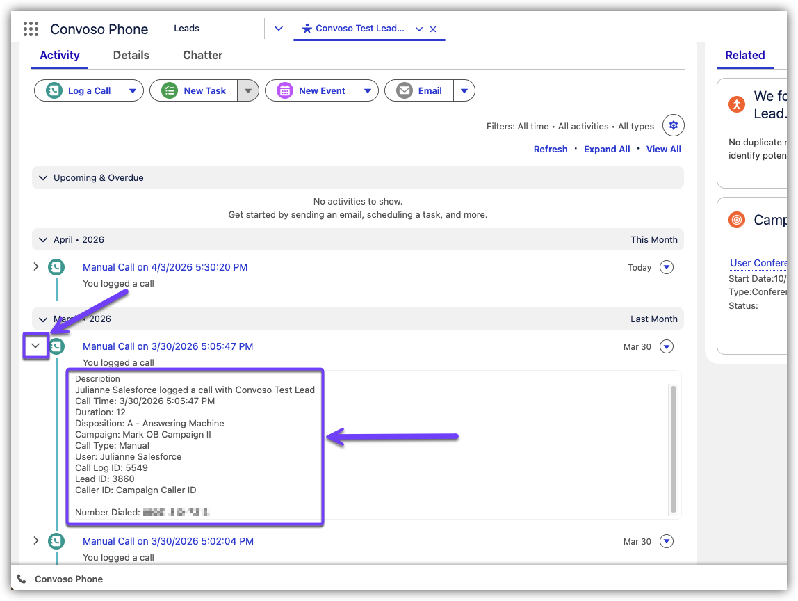 | After a call is wrapped-up, an Activity Record is created and the call activity details are stored in the Activity tab of the Lead Record. |
