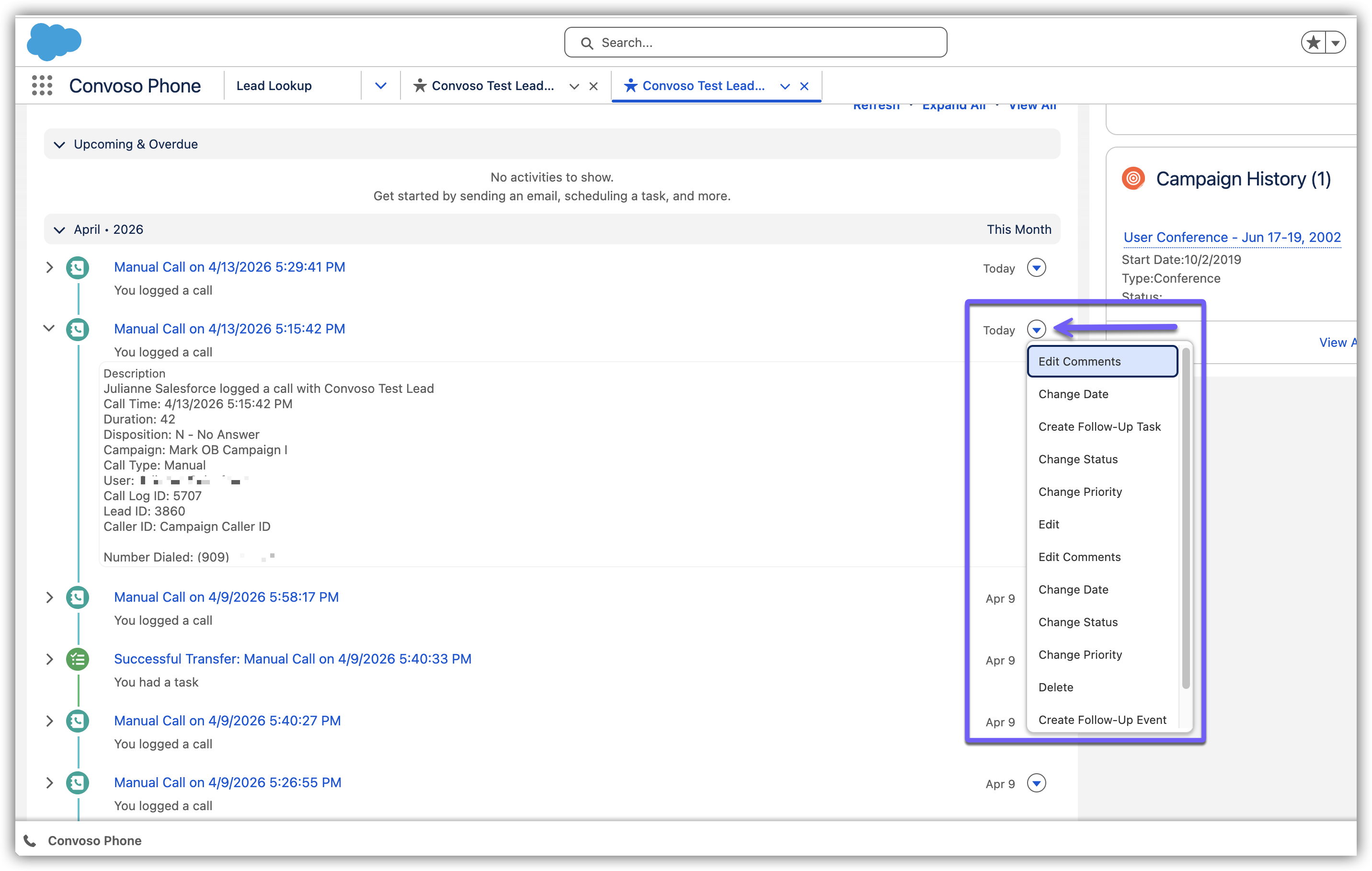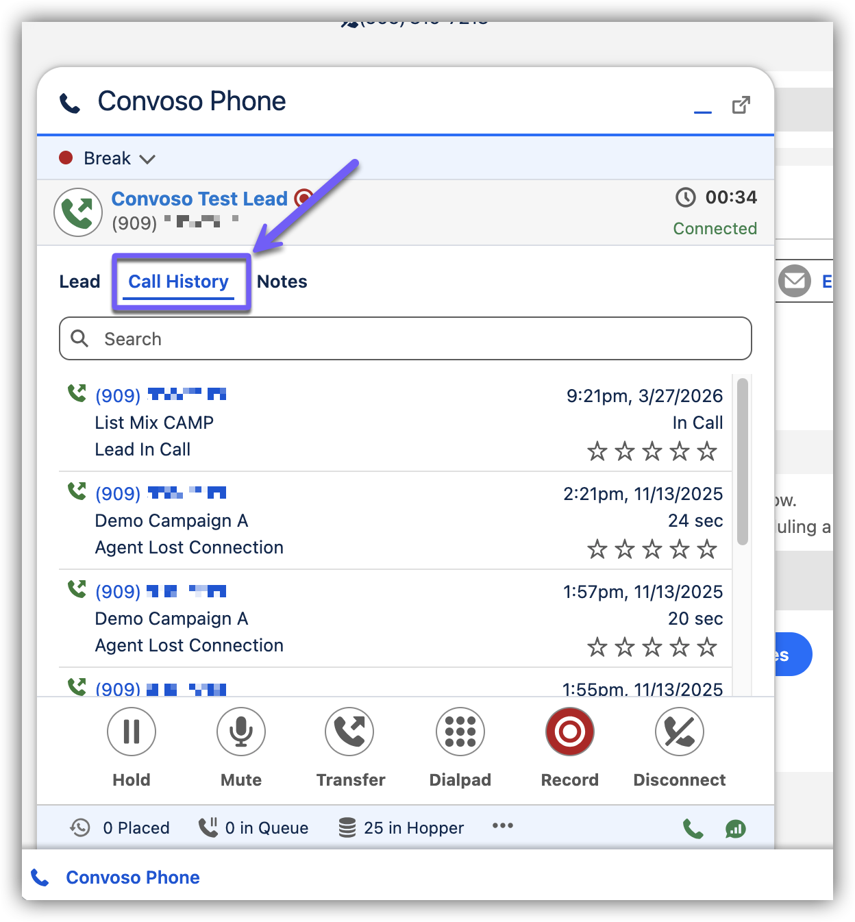 | Call History tab shows all contact attempts for that Lead including timestamps, call duration, Disposition, and Campaign/List. |