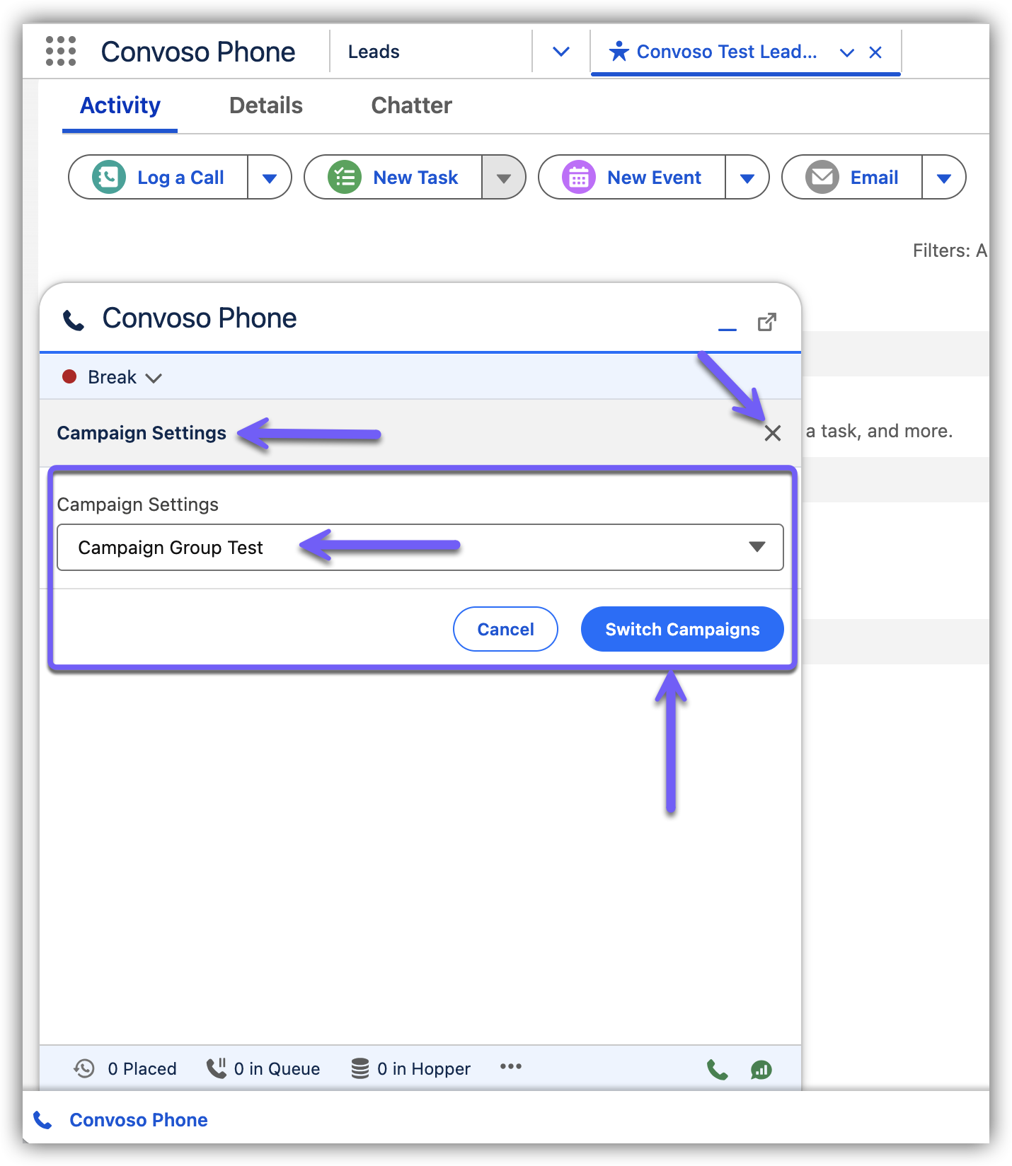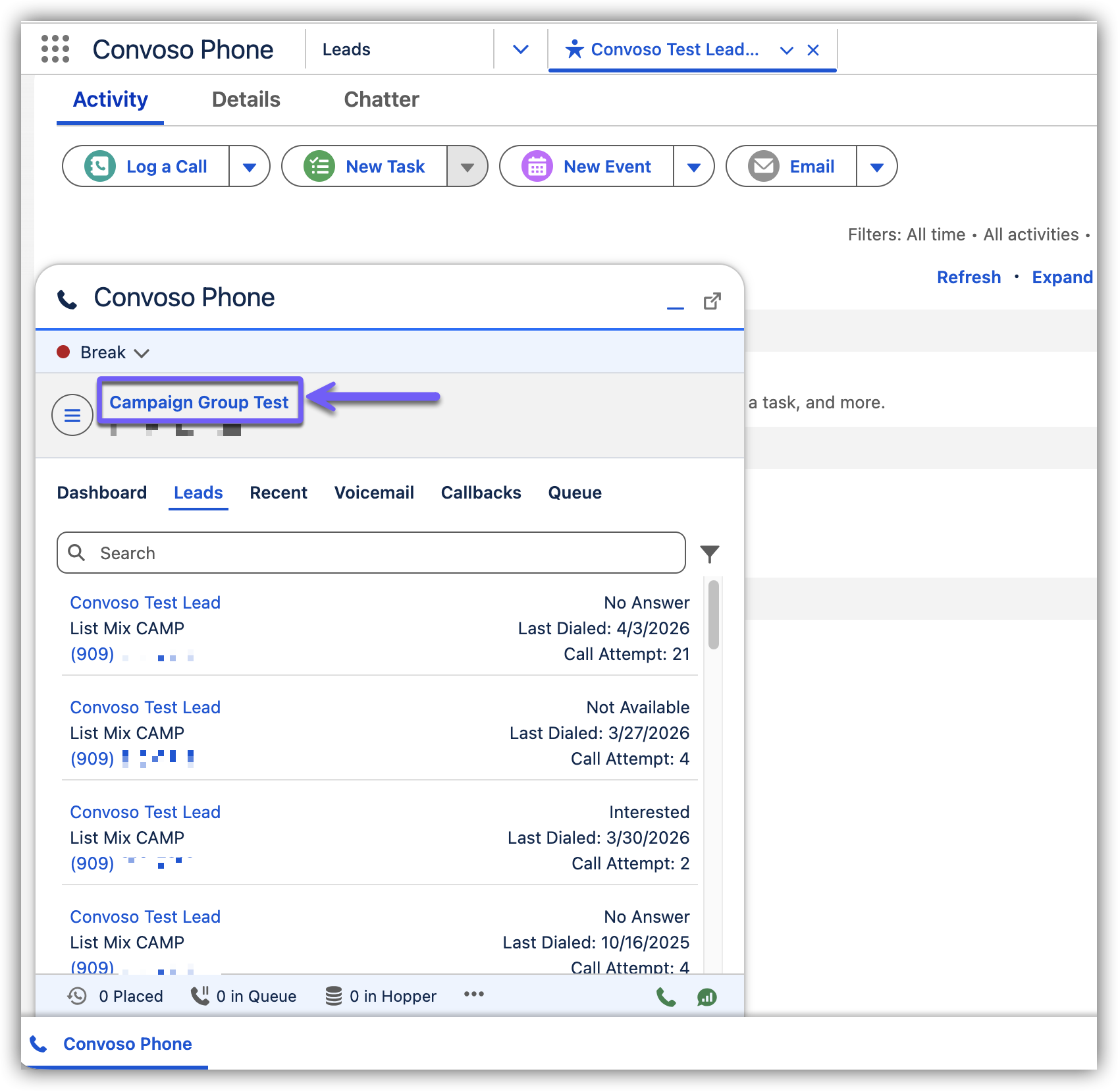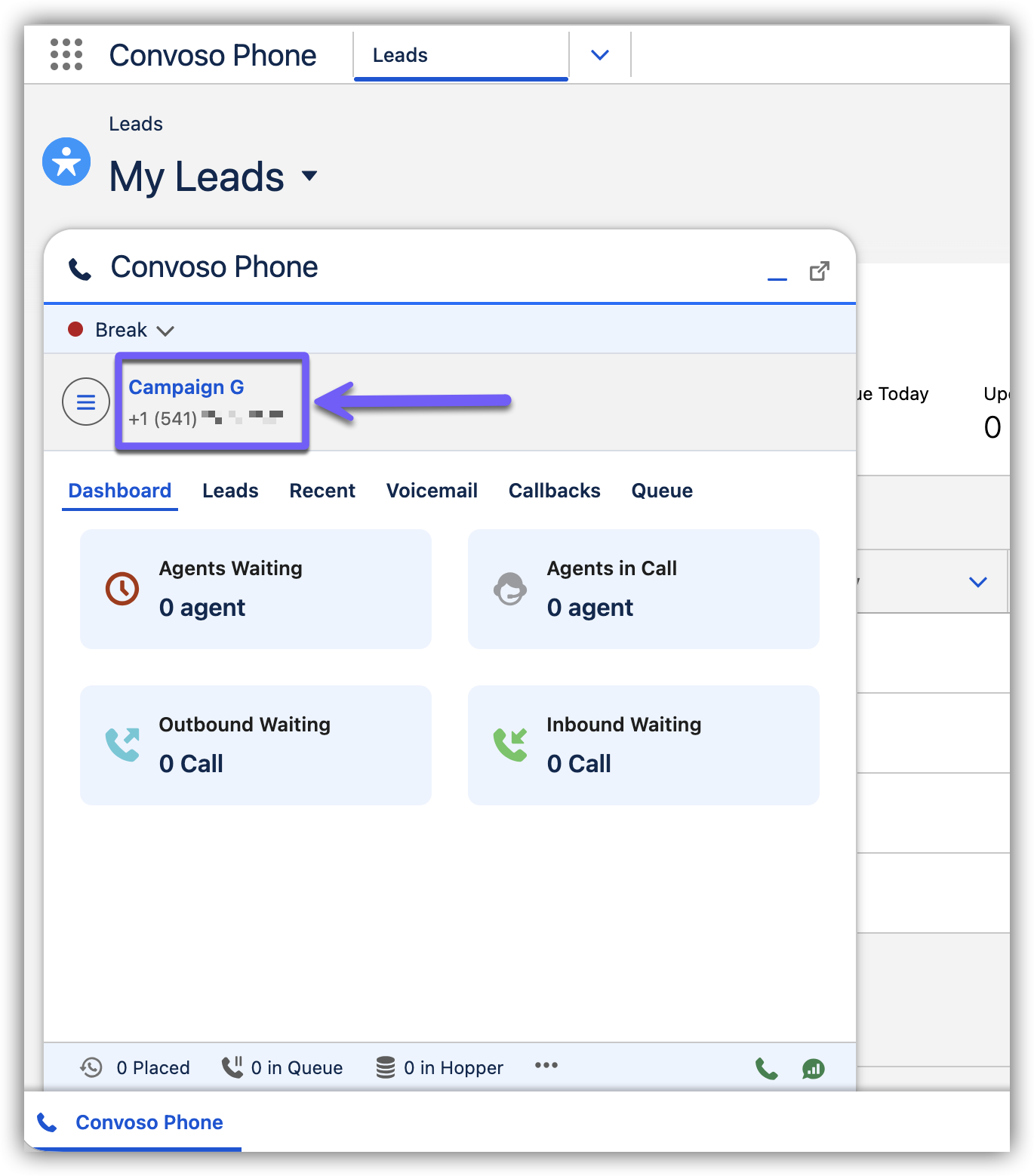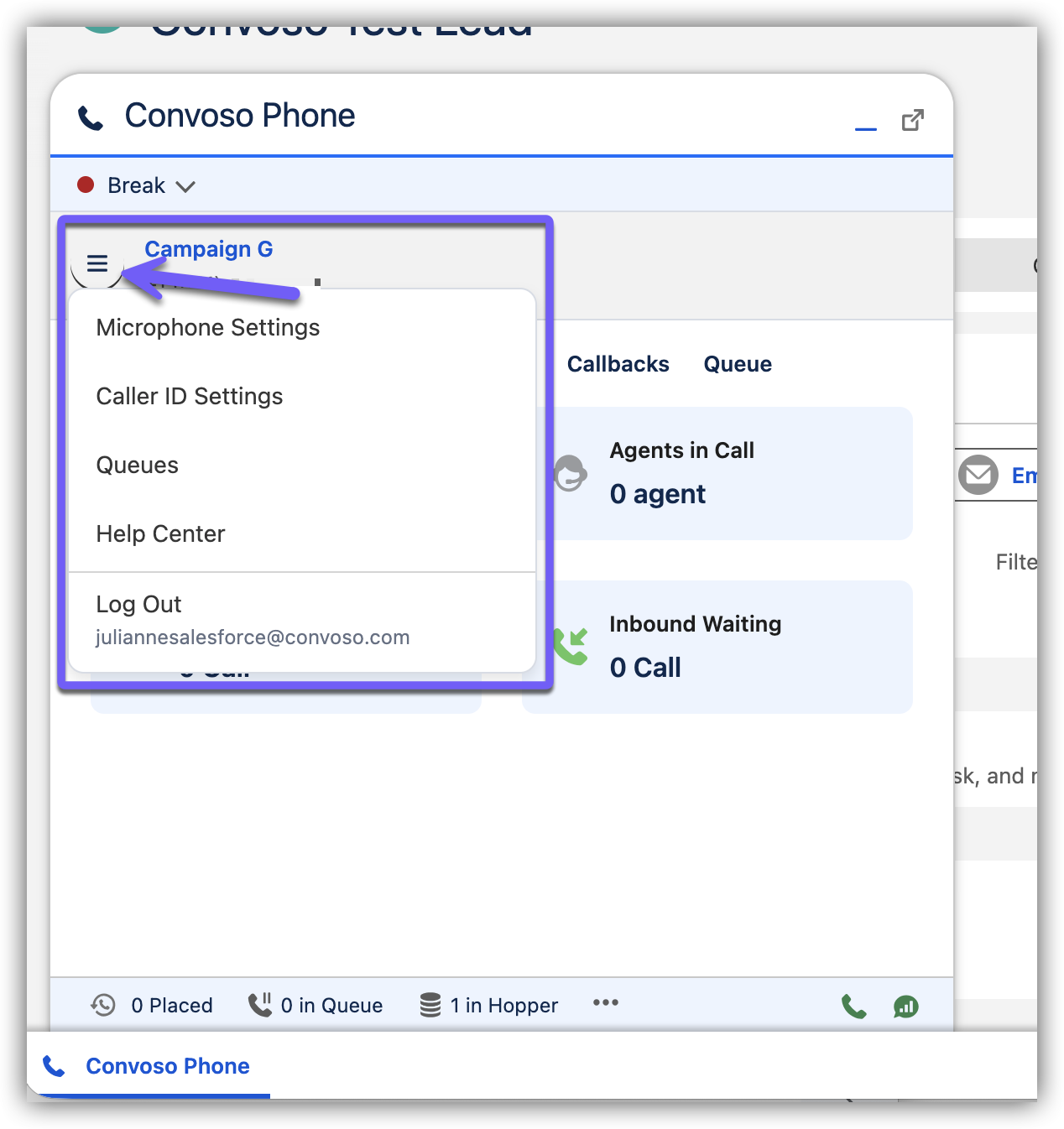 | From the Convoso for Salesforce CTI Adaptor, click on the current Campaign name. |