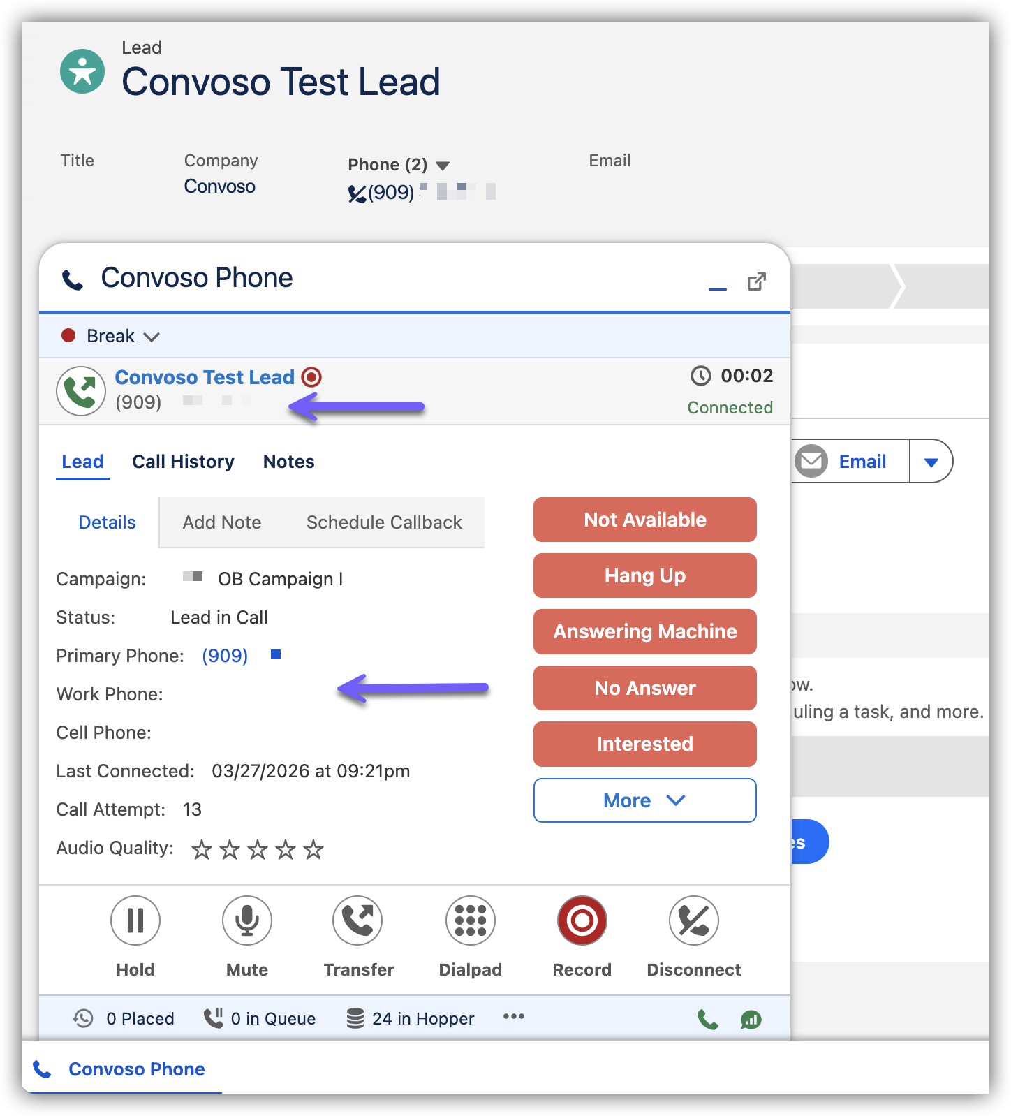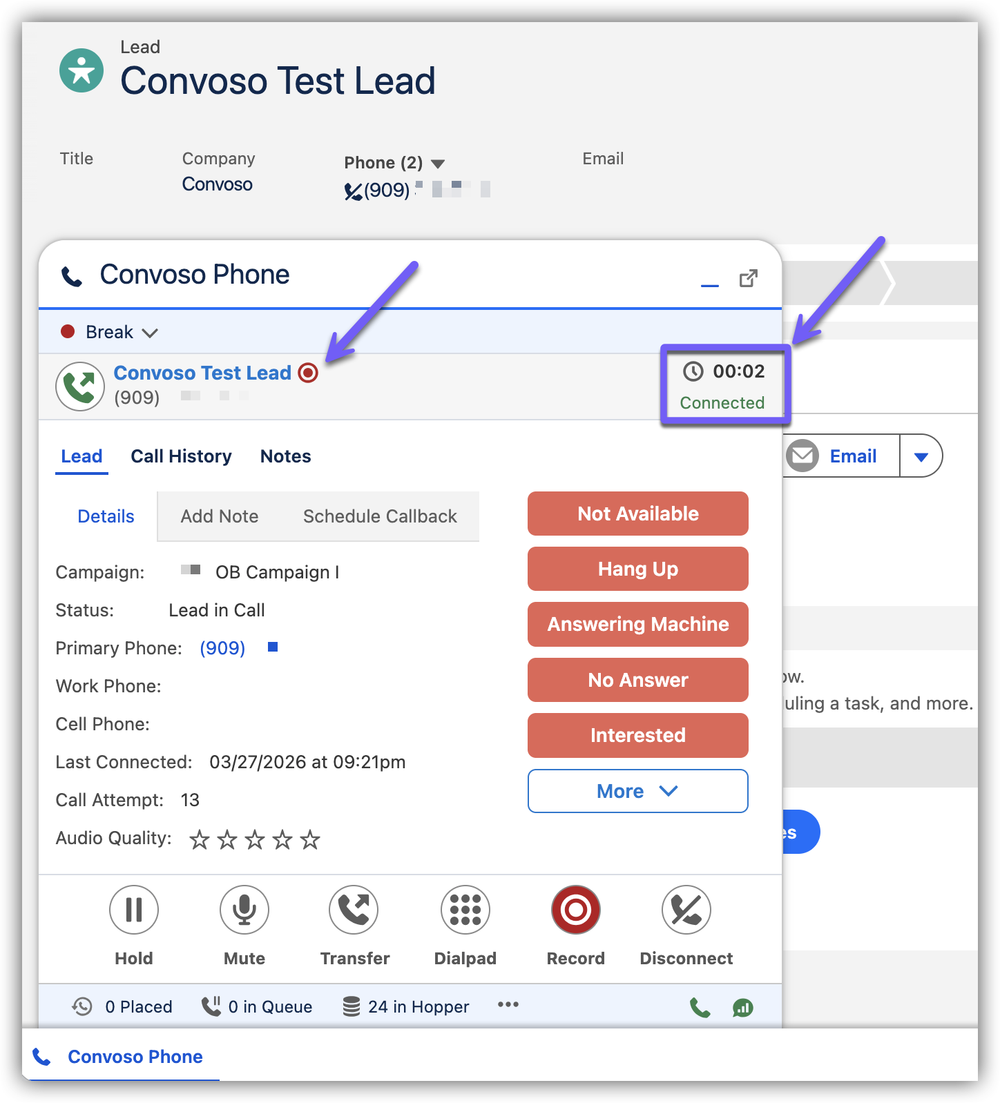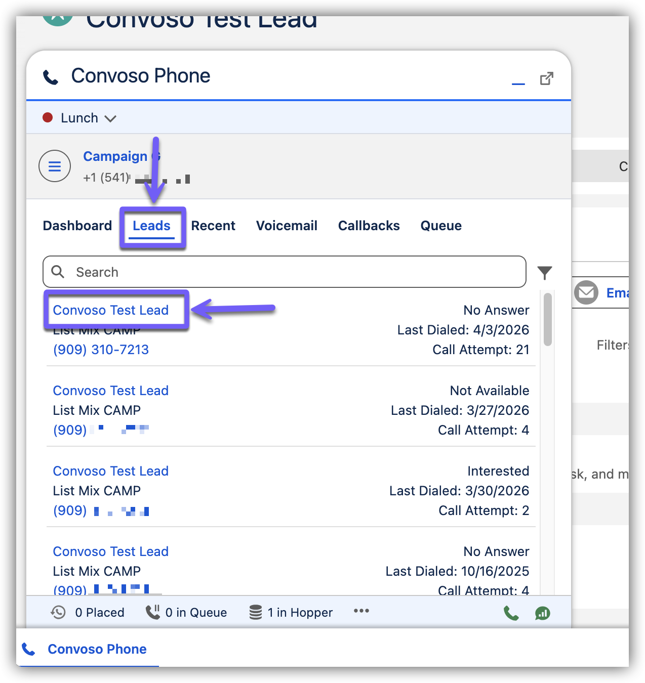 Once the live call is connected, the Convoso Phone displays the Lead’s information.