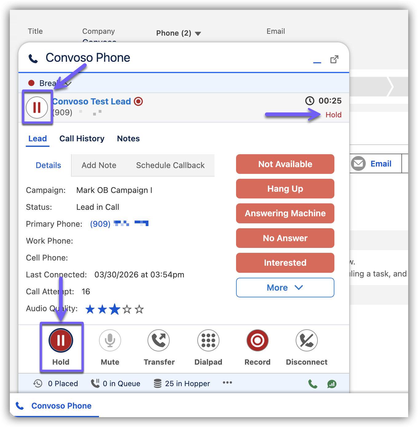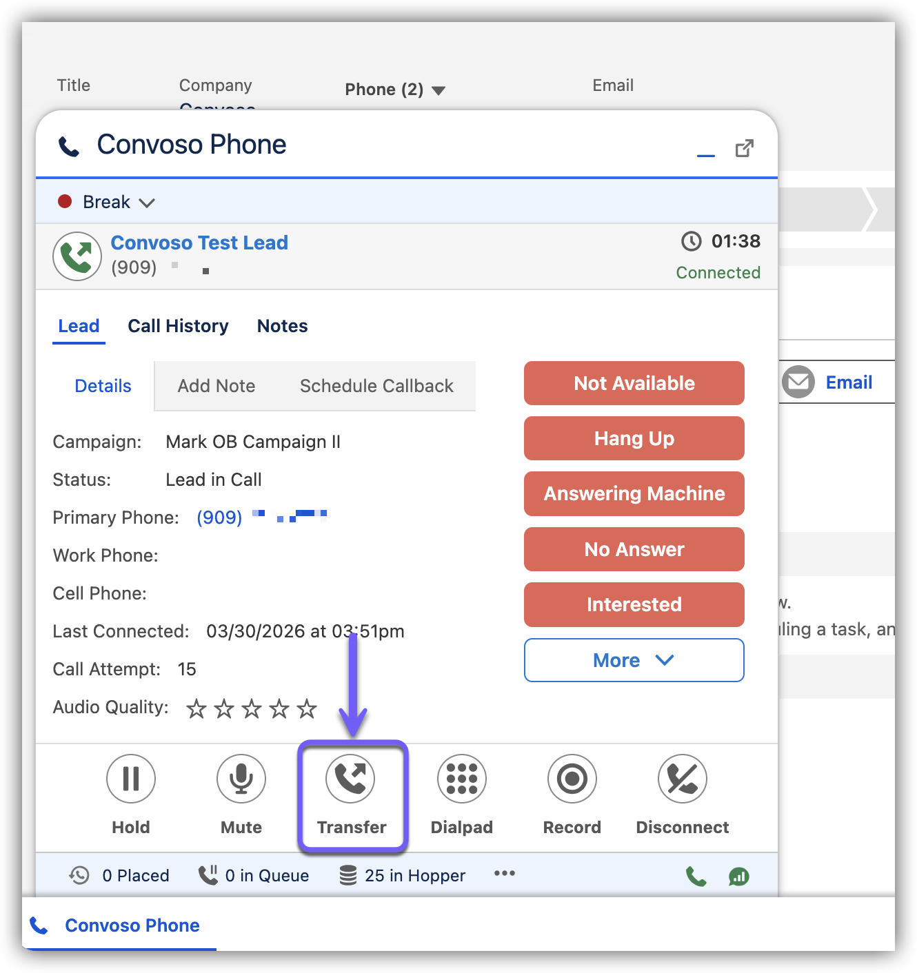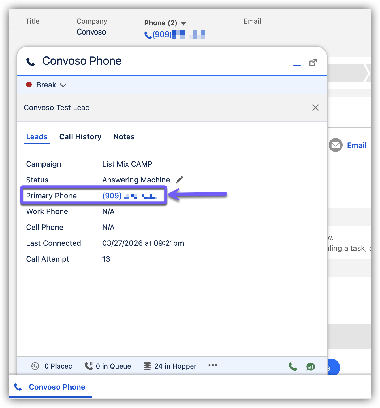 Once the live call is connected, the Convoso Phone displays the Lead’s information.